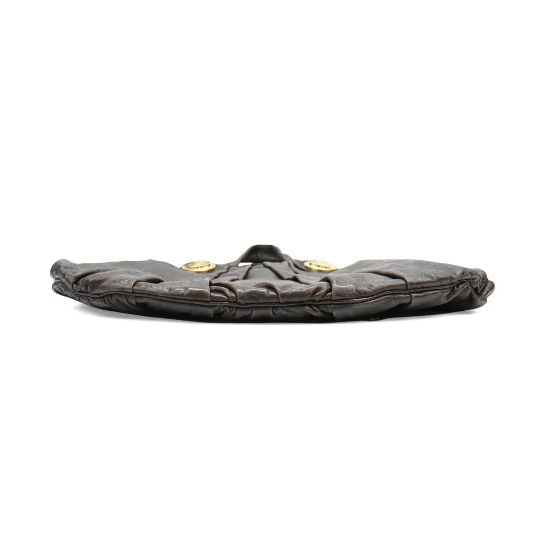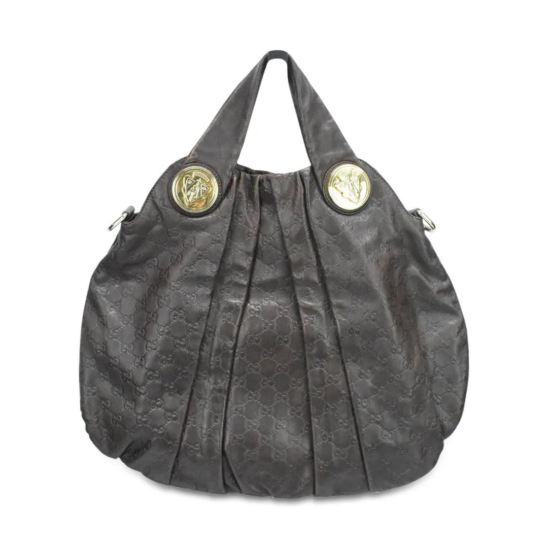 Gucci 'Hysteria' tote bag in dark brown monogram embossed leather. Features pleating at the top, two top handles, gold coat of arms hardware, a removable shoulder strap, a magnetic button closure, and red and brown horse-bit patterned canvas lining.