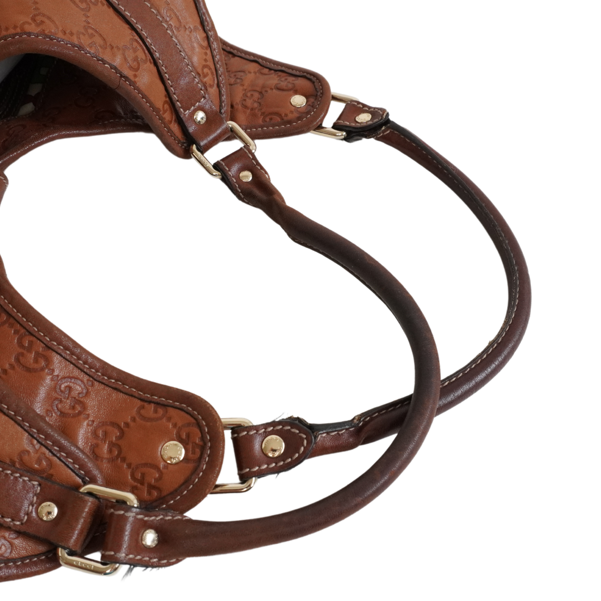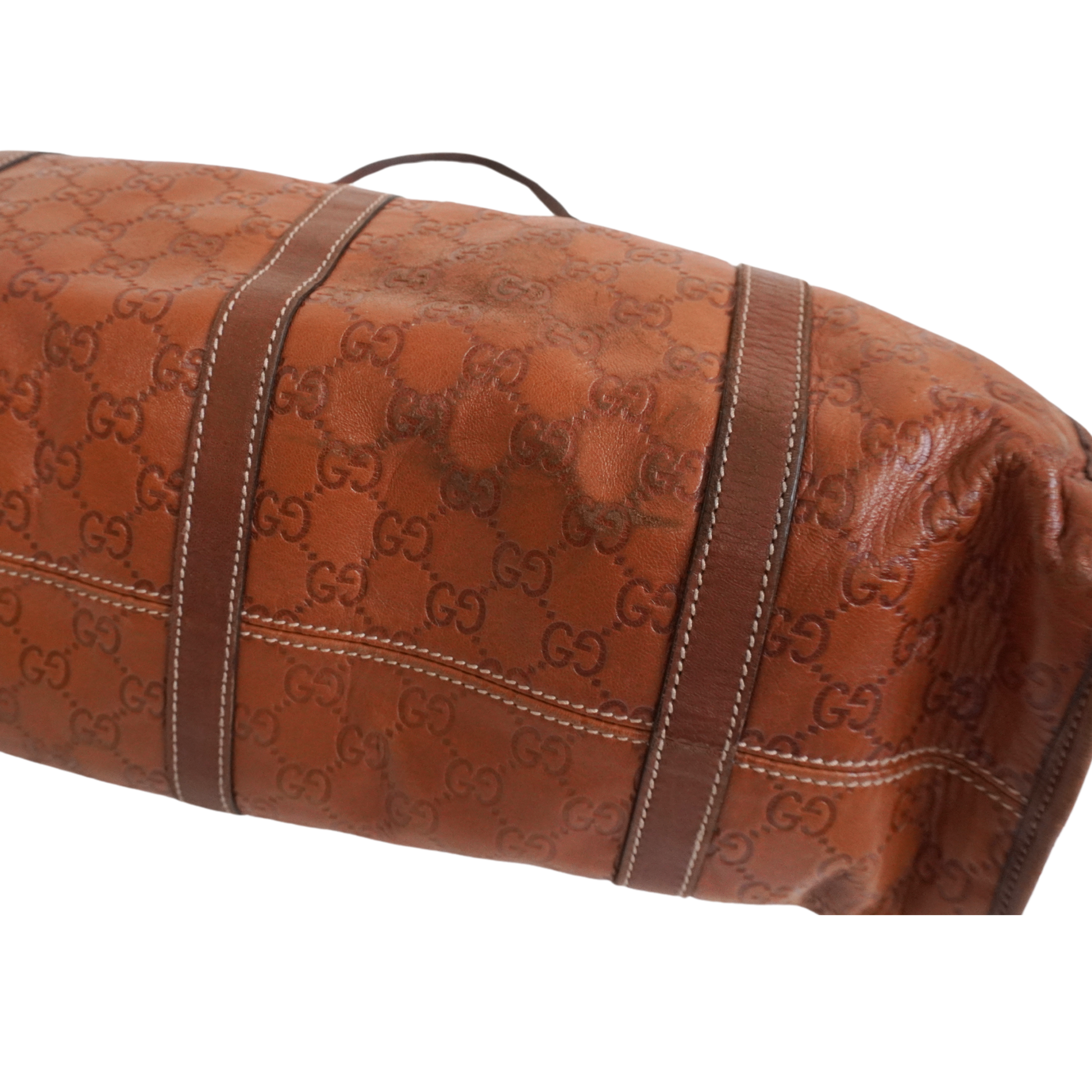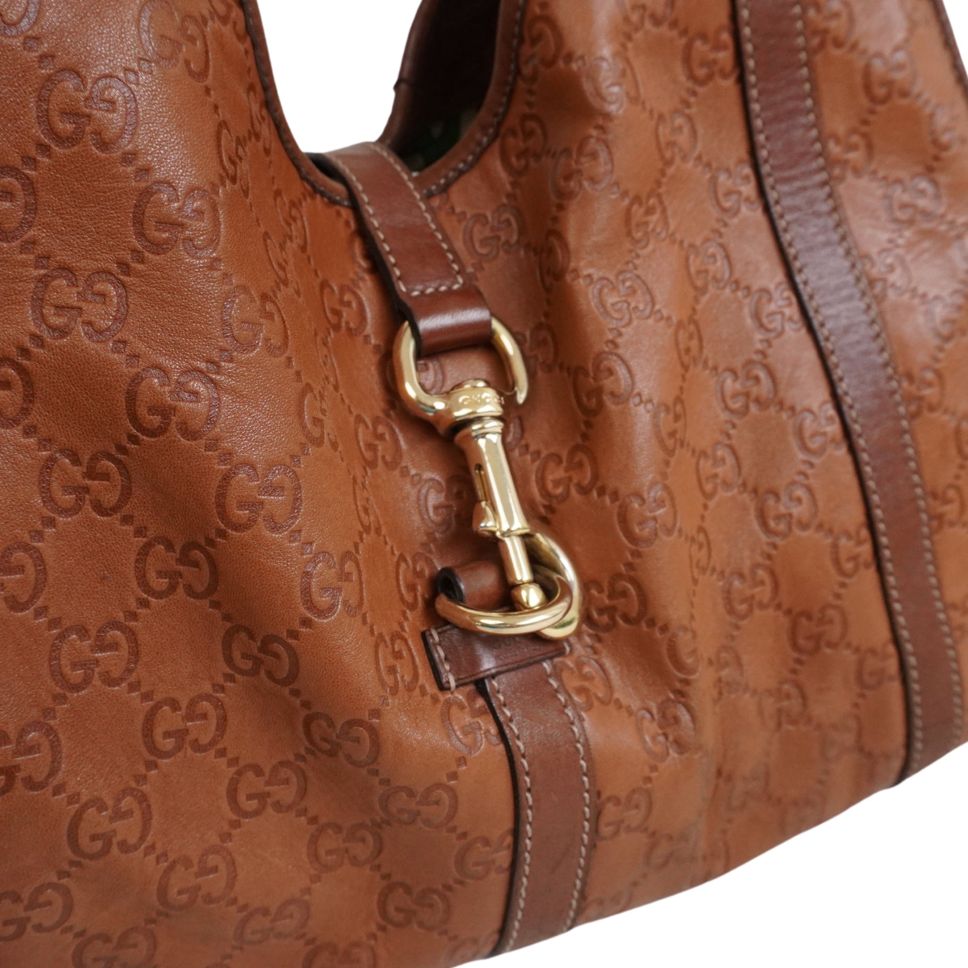 Gucci 'Joy Bardot' shoulder bag in brown guccissima monogram embossed leather with darker brown trim, dual rolled top handles, a top clasp closure in gold hardware, and a canvas lined interior with zip and slip pockets.