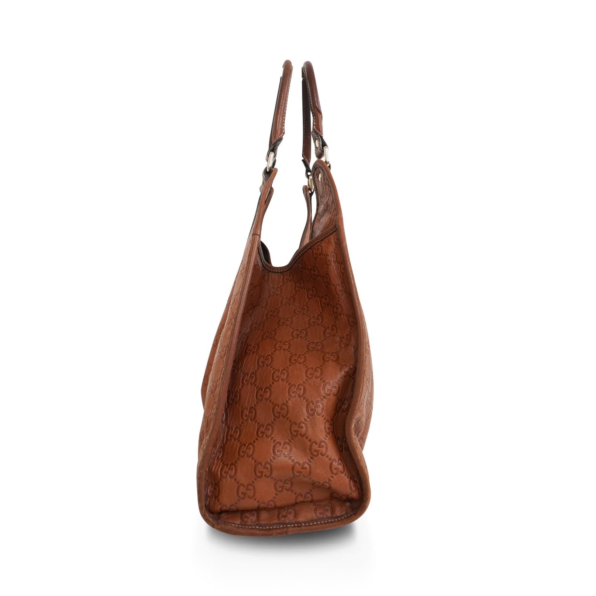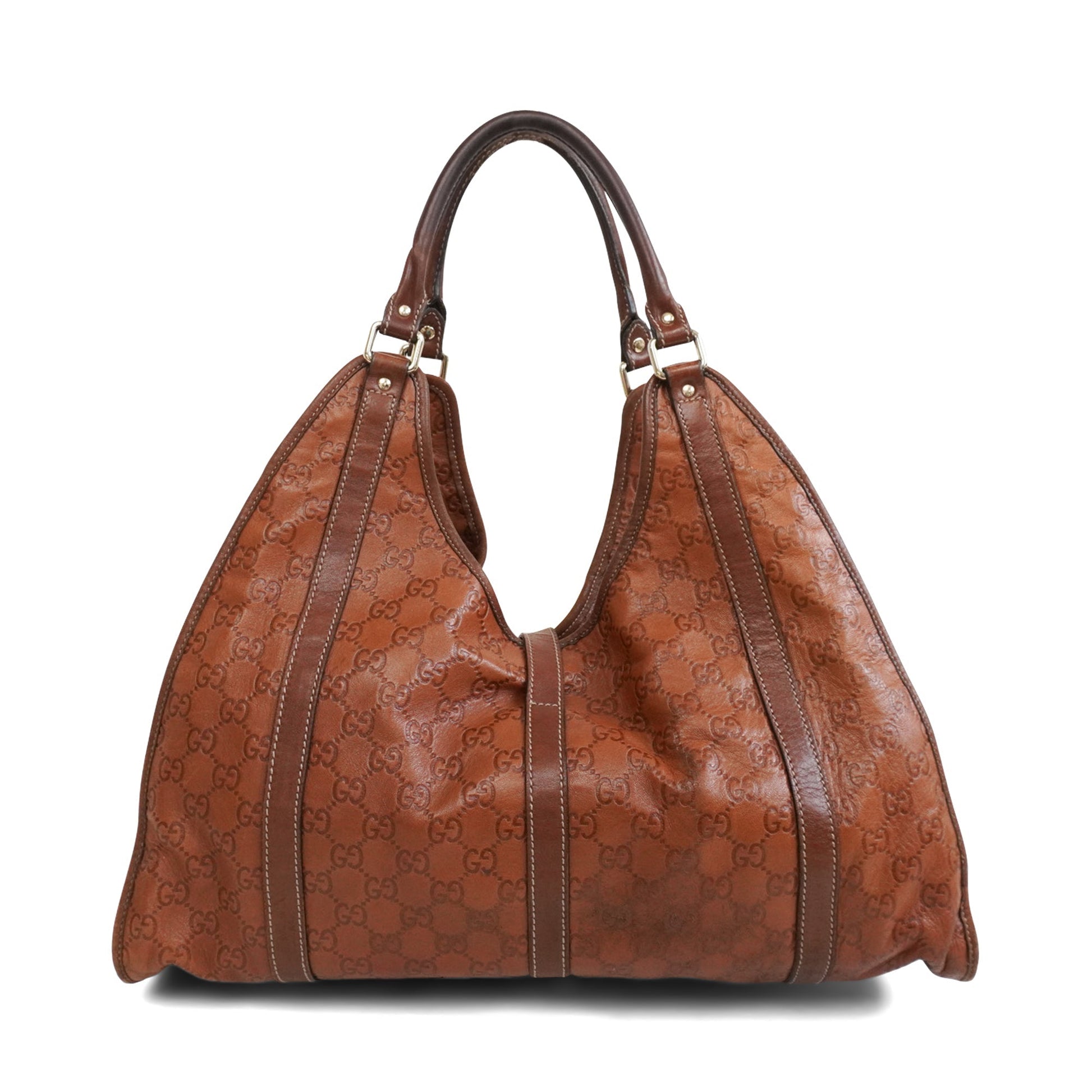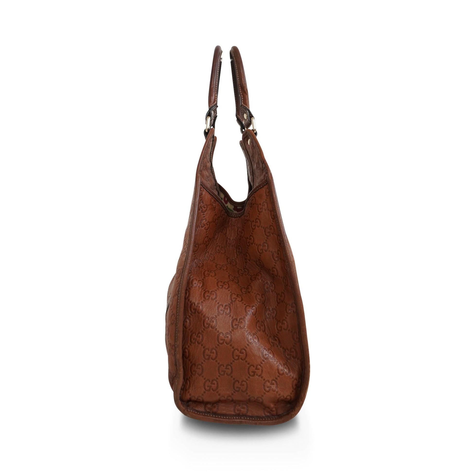 Gucci 'Joy Bardot' shoulder bag in brown guccissima monogram embossed leather with darker brown trim, dual rolled top handles, a top clasp closure in gold hardware, and a canvas lined interior with zip and slip pockets.