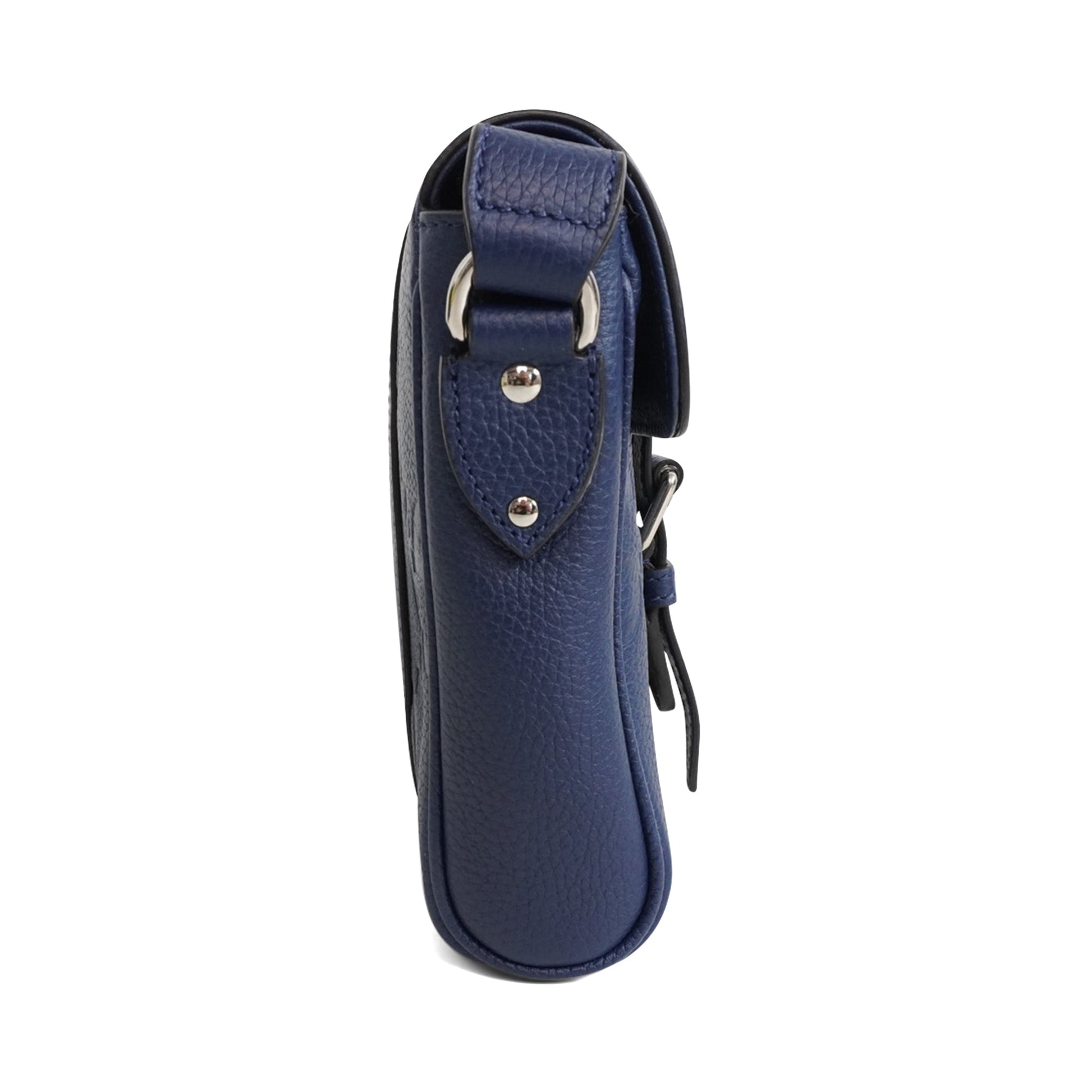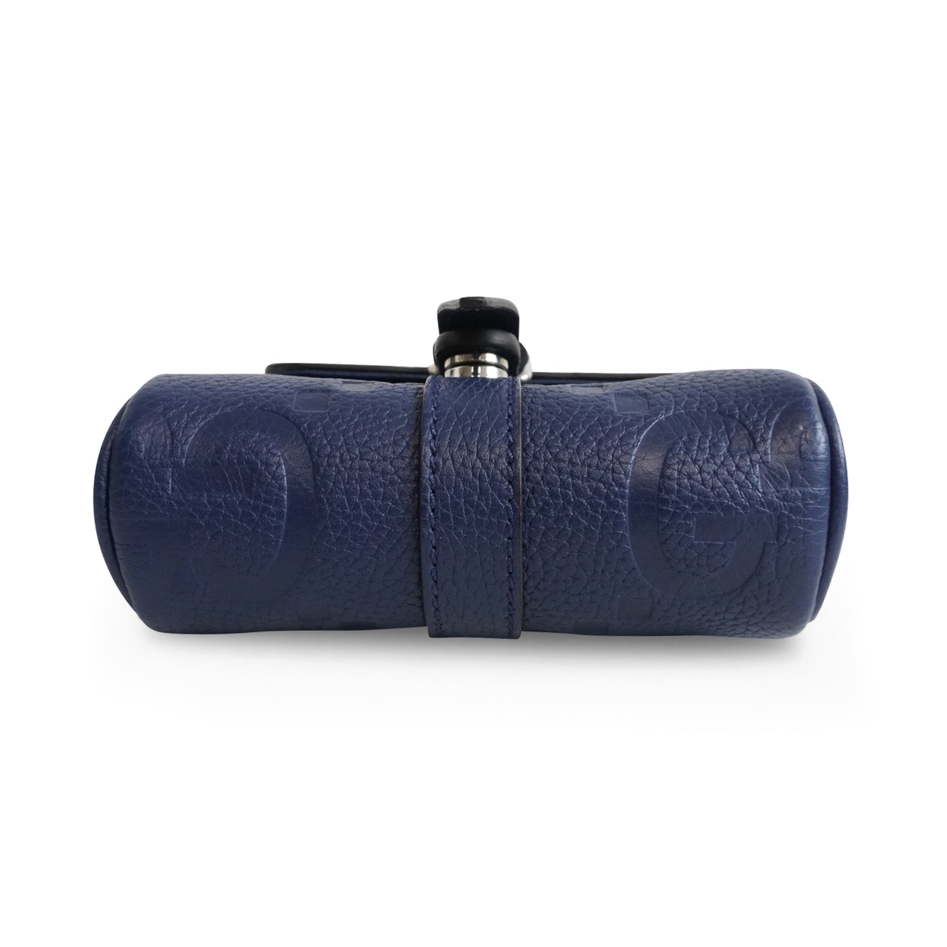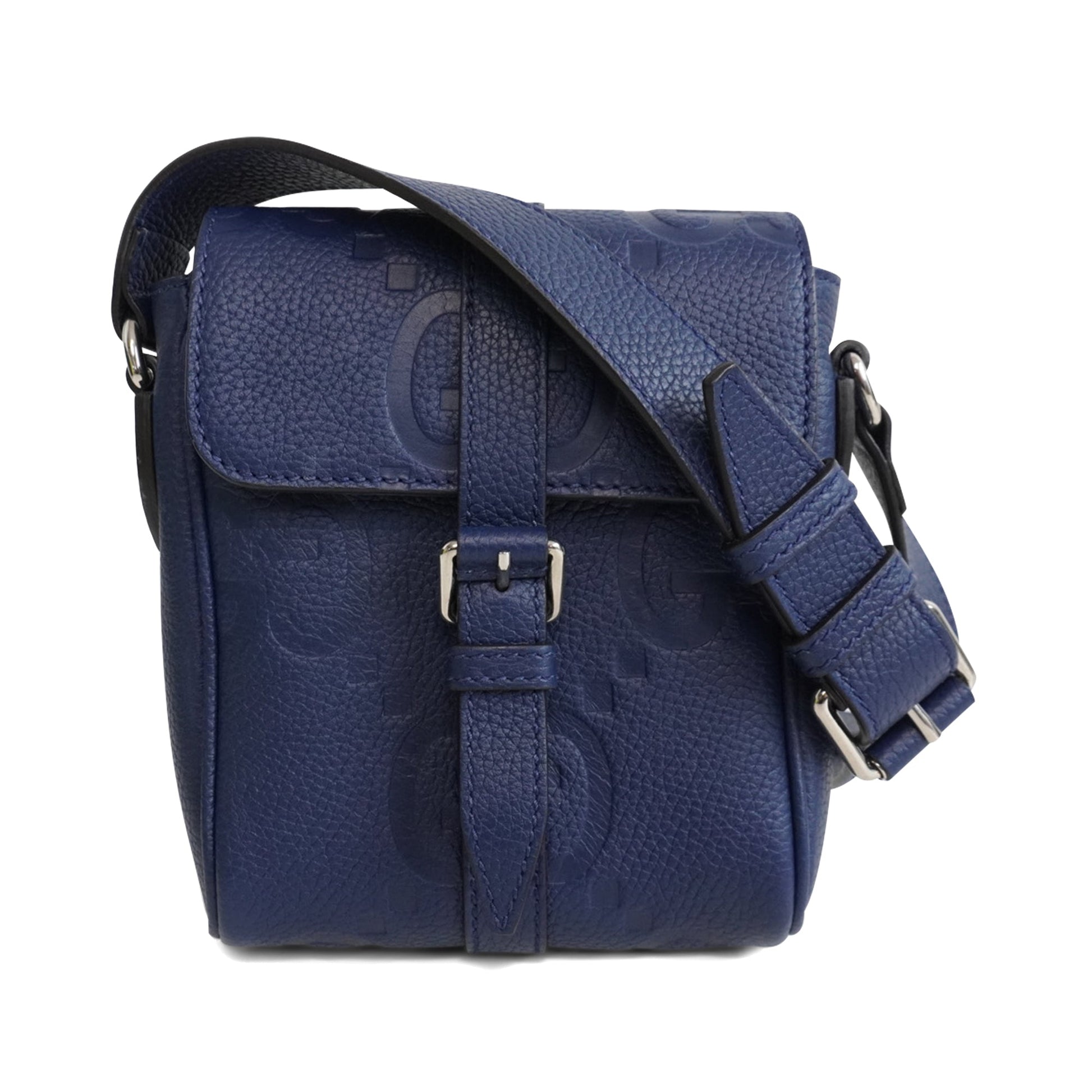 Gucci 'Jumbo GG Embossed Small Messenger' bag in navy blue calfskin leather with an all-over 'Jumbo GG' embossed pattern. The bag has an adjustable crossbody strap, a top flap opening with a magnetic snap closure in silver hardware, and a beige canvas inner lining with card pockets.