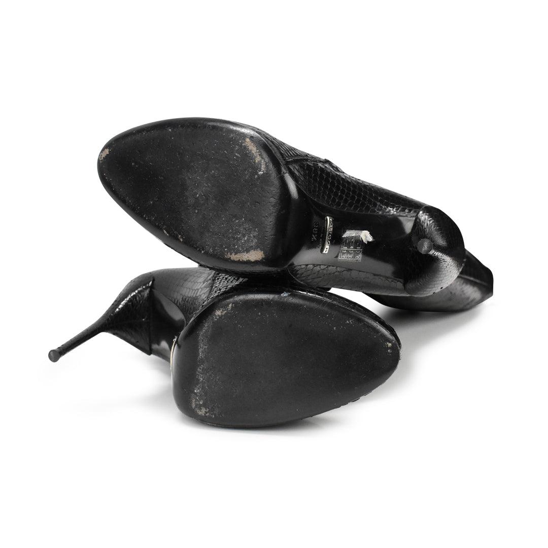 Gucci 'Kim' boots in black python snakeskin with a side zip opening down the inner leg and a stiletto heel. From the Gucci Fall 2014 collection.