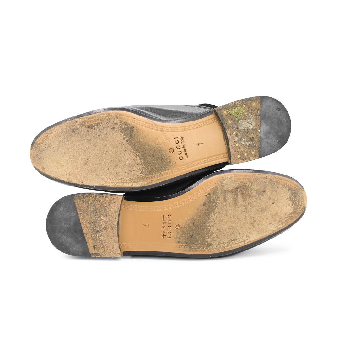 Gucci 'Kings' mules in black leather with an elastic slingback strap and gold horsebit detail on the toe.