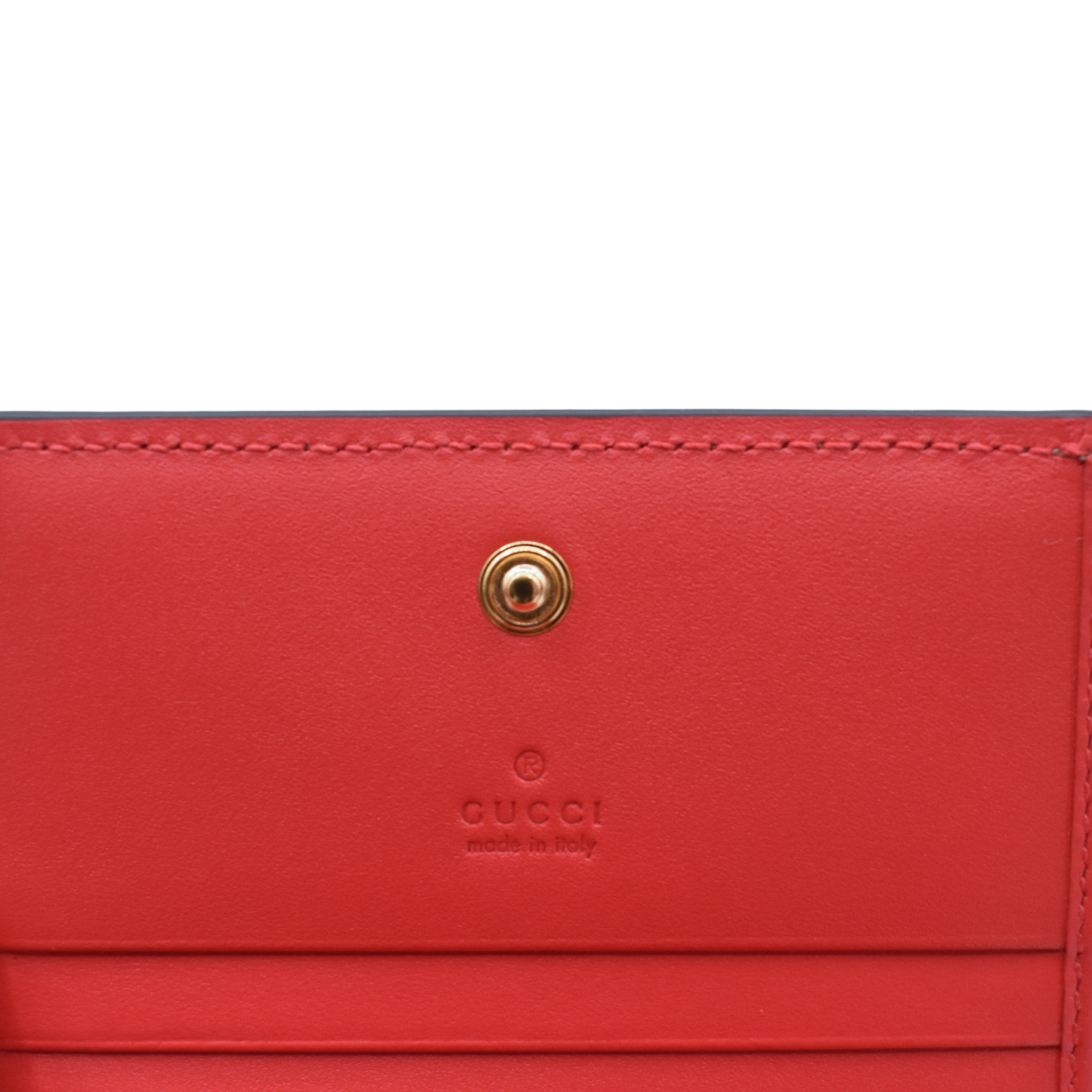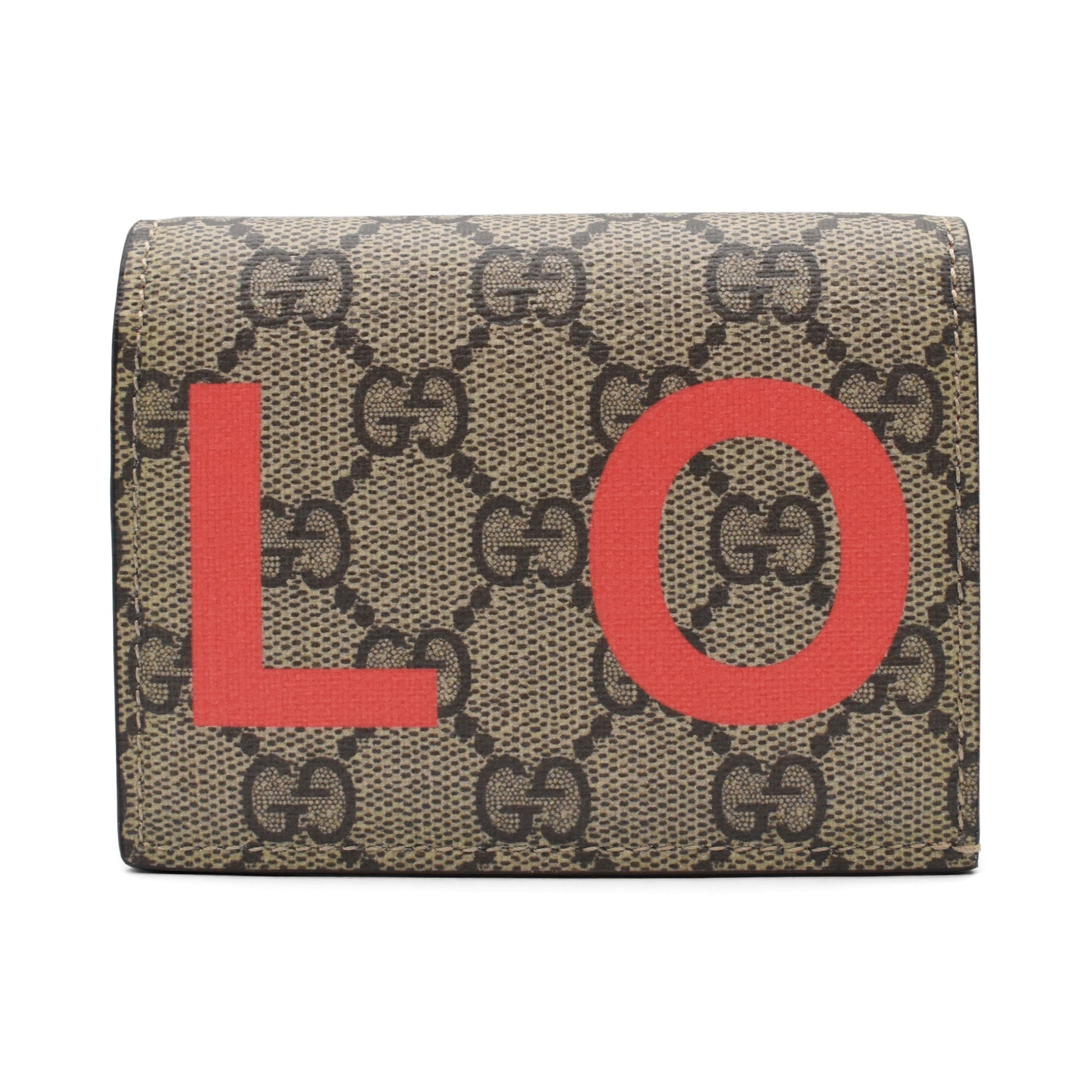 Gucci 'Love' compact wallet in brown monogram Guccissima coated canvas with red leather lining and 'LO VE' printed across both sides. Features a snap button closure, 6 card slots, a bill pocket, and a coin pocket with zip.