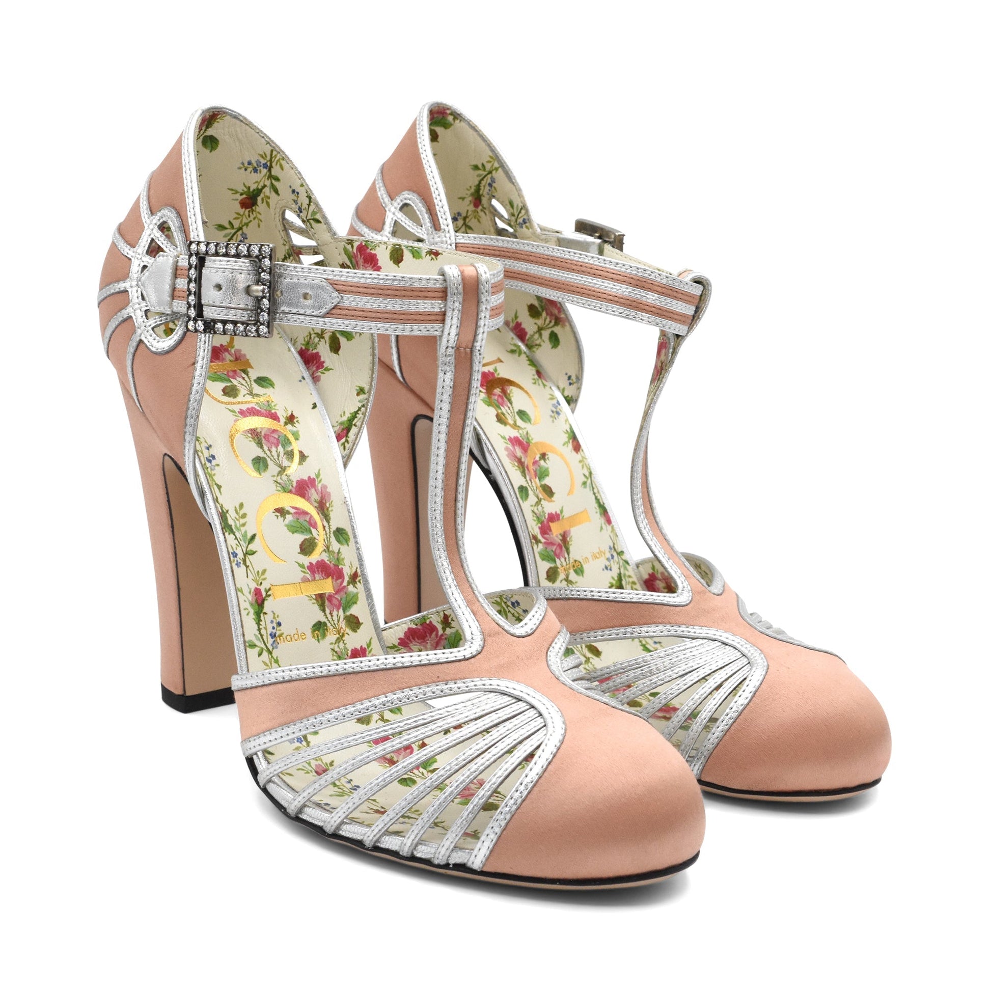 Gucci 'Mariska' T-strap pumps in blush pink satin with silver leather detailing. Feature an adjustable ankle strap with crystal buckle, cut outs on the toe box, and floral printed leather insole.