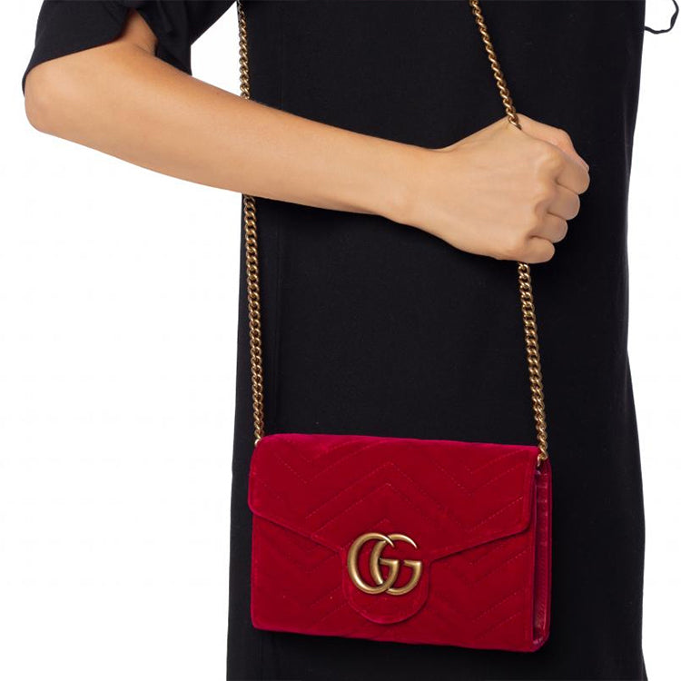 (WMNS) Gucci GG Marmont Gold Logo Distress Velvet Chain Shoulder Messenger Bag Mini Red 474575-9QIDT-6433