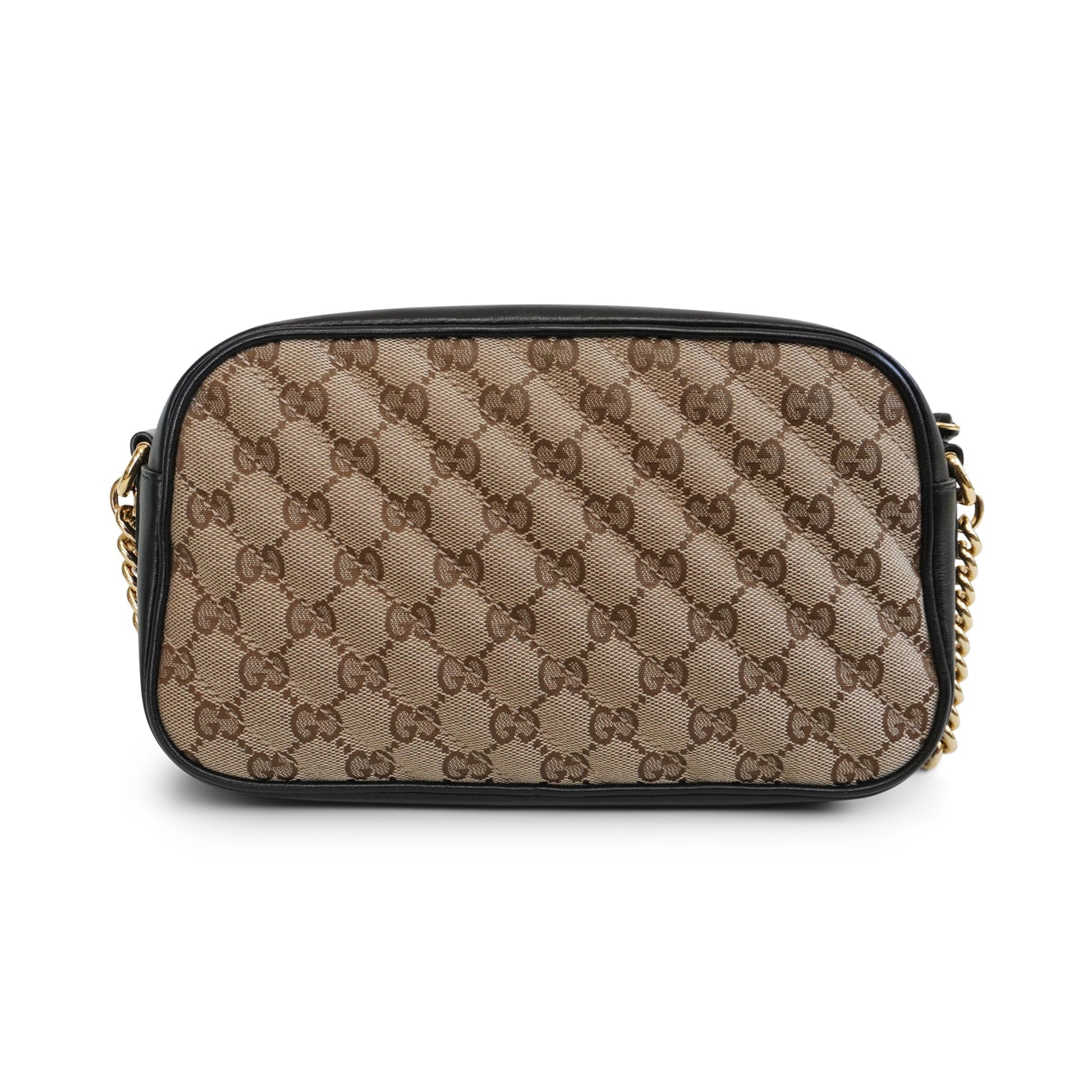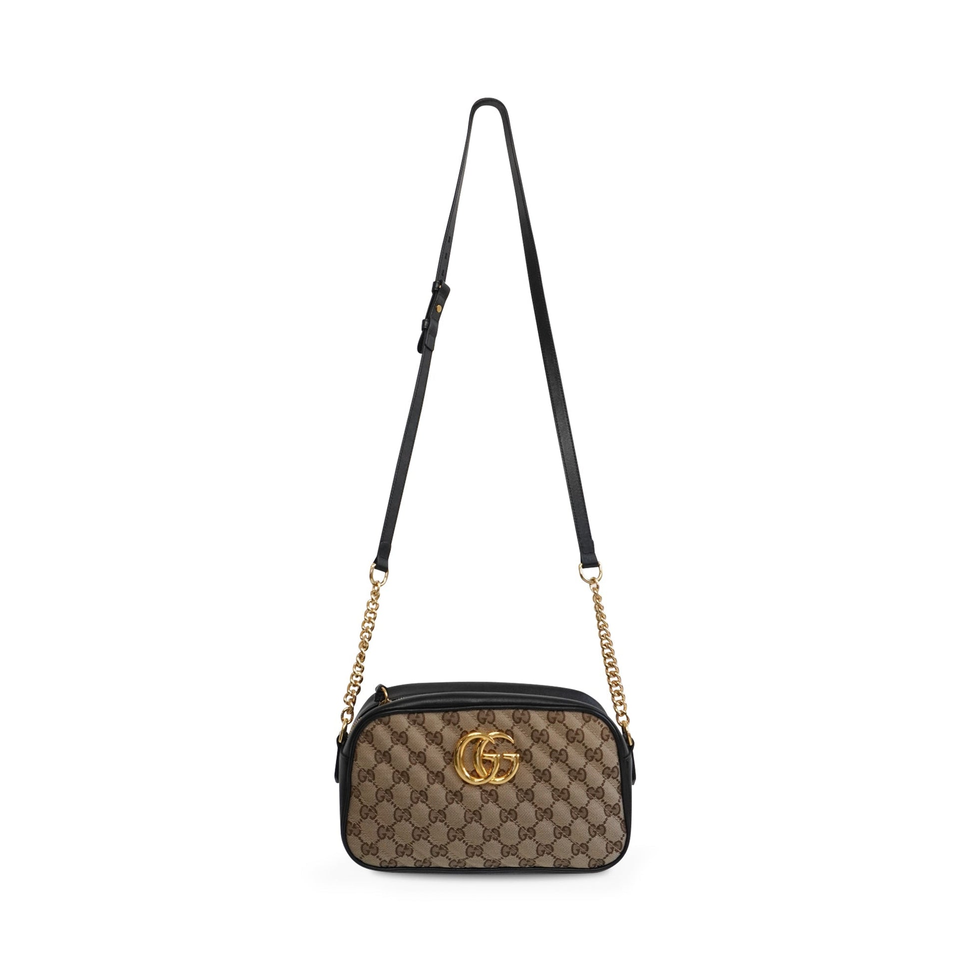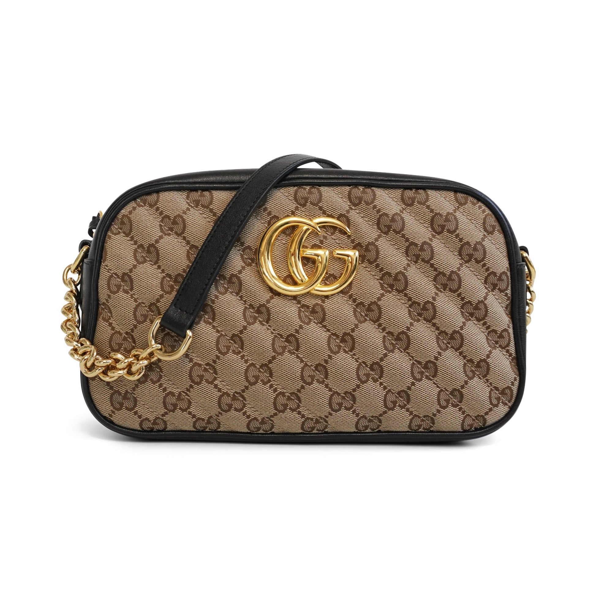 Gucci 'Marmont' camera bag in quilted monogram canvas with black leather accents and gold 'GG' hardware. Features a zip pocket with blush pink microsuede lining and adjustable chain and leather crossbody strap.