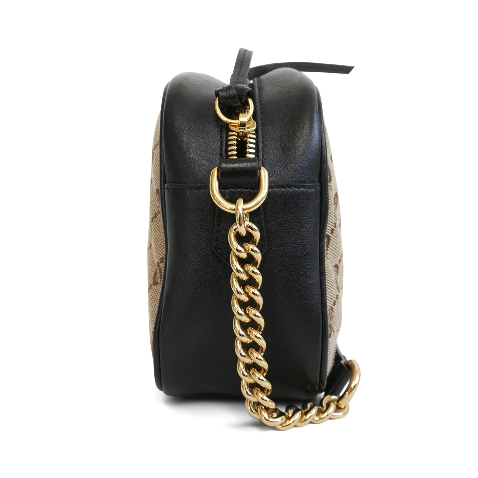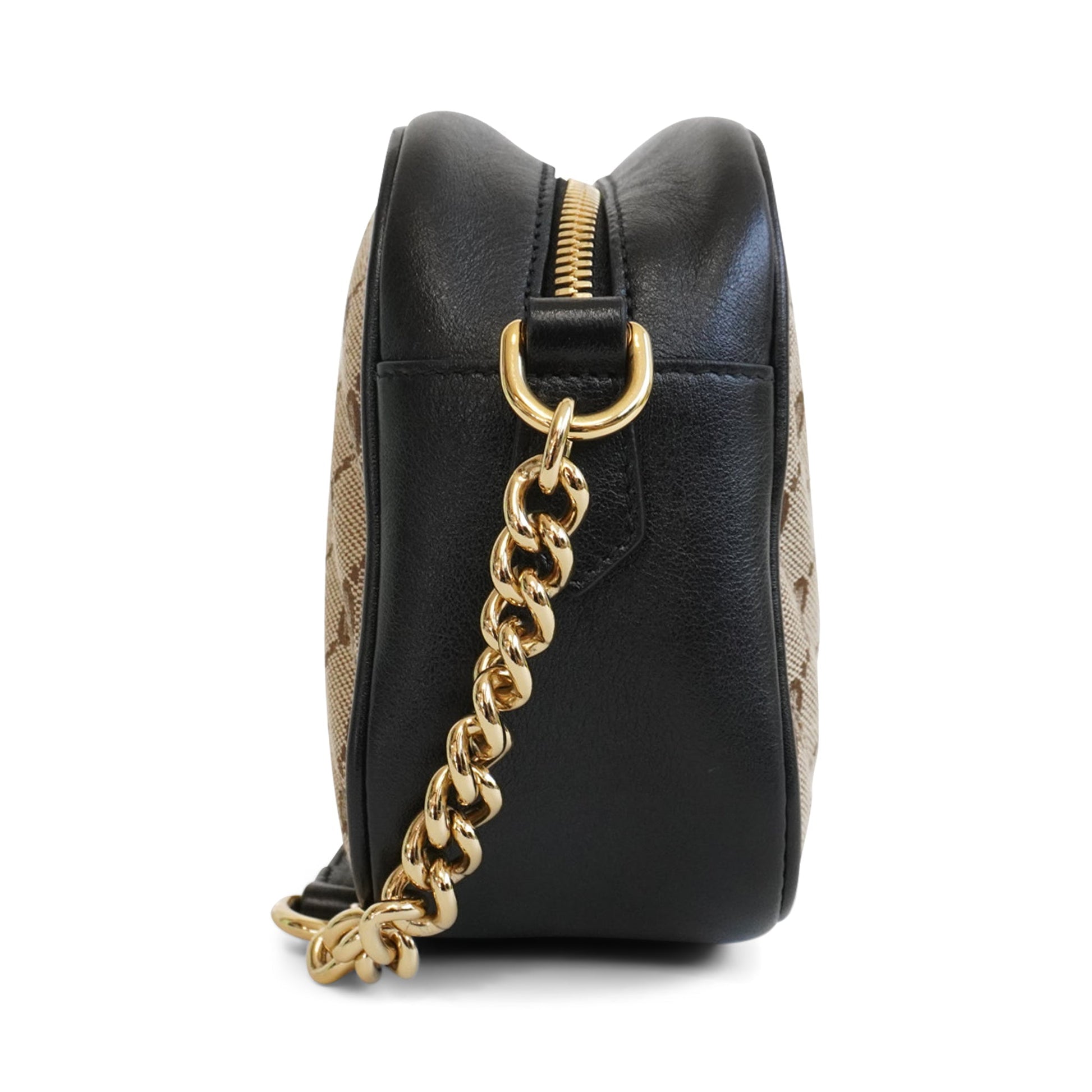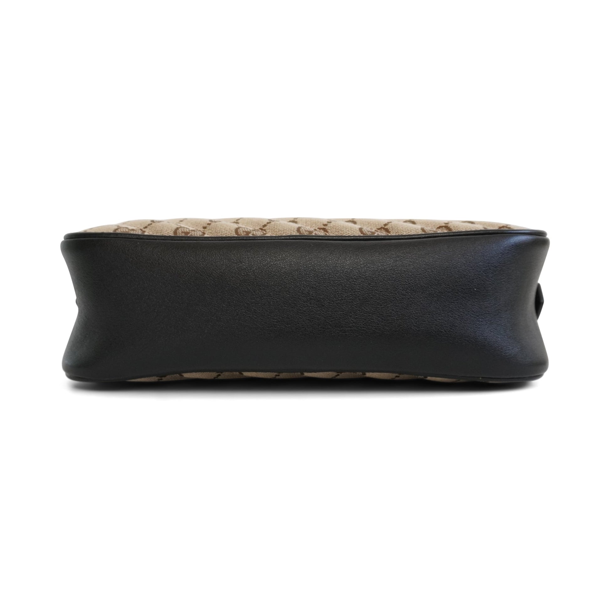 Gucci 'Marmont' camera bag in quilted monogram canvas with black leather accents and gold 'GG' hardware. Features a zip pocket with blush pink microsuede lining and adjustable chain and leather crossbody strap.