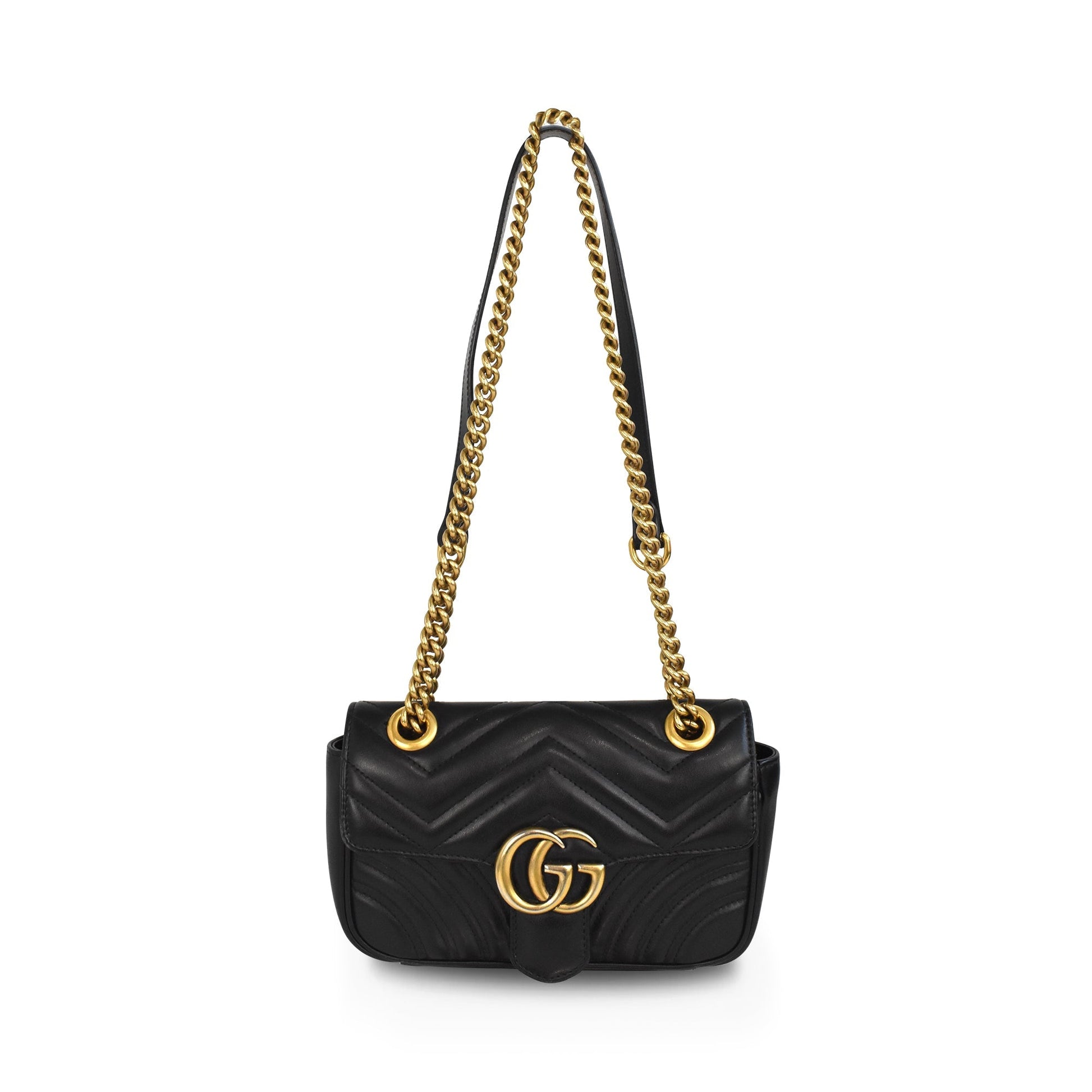 Gucci 'Marmont' crossbody bag in black quilted leather. Features a push-lock top flap closure, gold 'GG' logo on the front, a chain strap that can be adjusted to 2 lengths, and a quilted heart on the back. The interior is beige suede lined with a slip pocket.