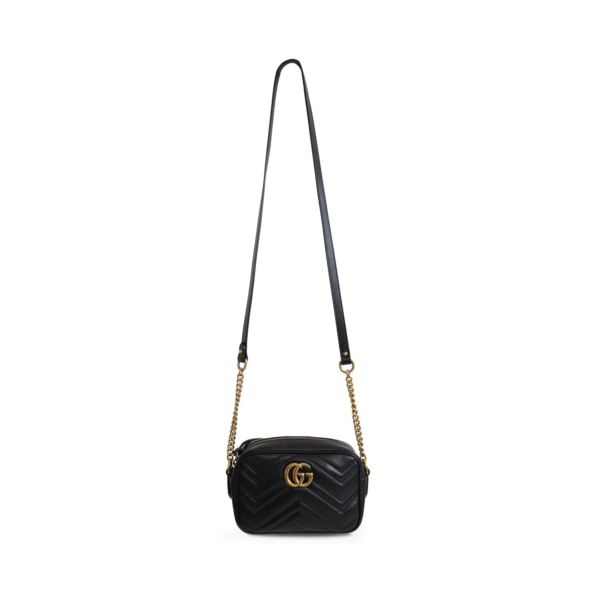 Gucci 'Marmont' mini crossbody bag in blackmatelass chevron quilted leather with GG logo plaque in gold hardware on the front and embroidered GG logo on the back. Features a top zip closure, chain shoulder strap and beige suede lining with an inner open pocket.