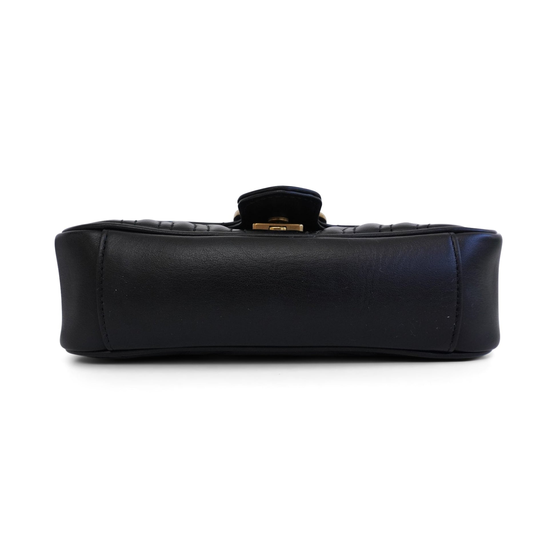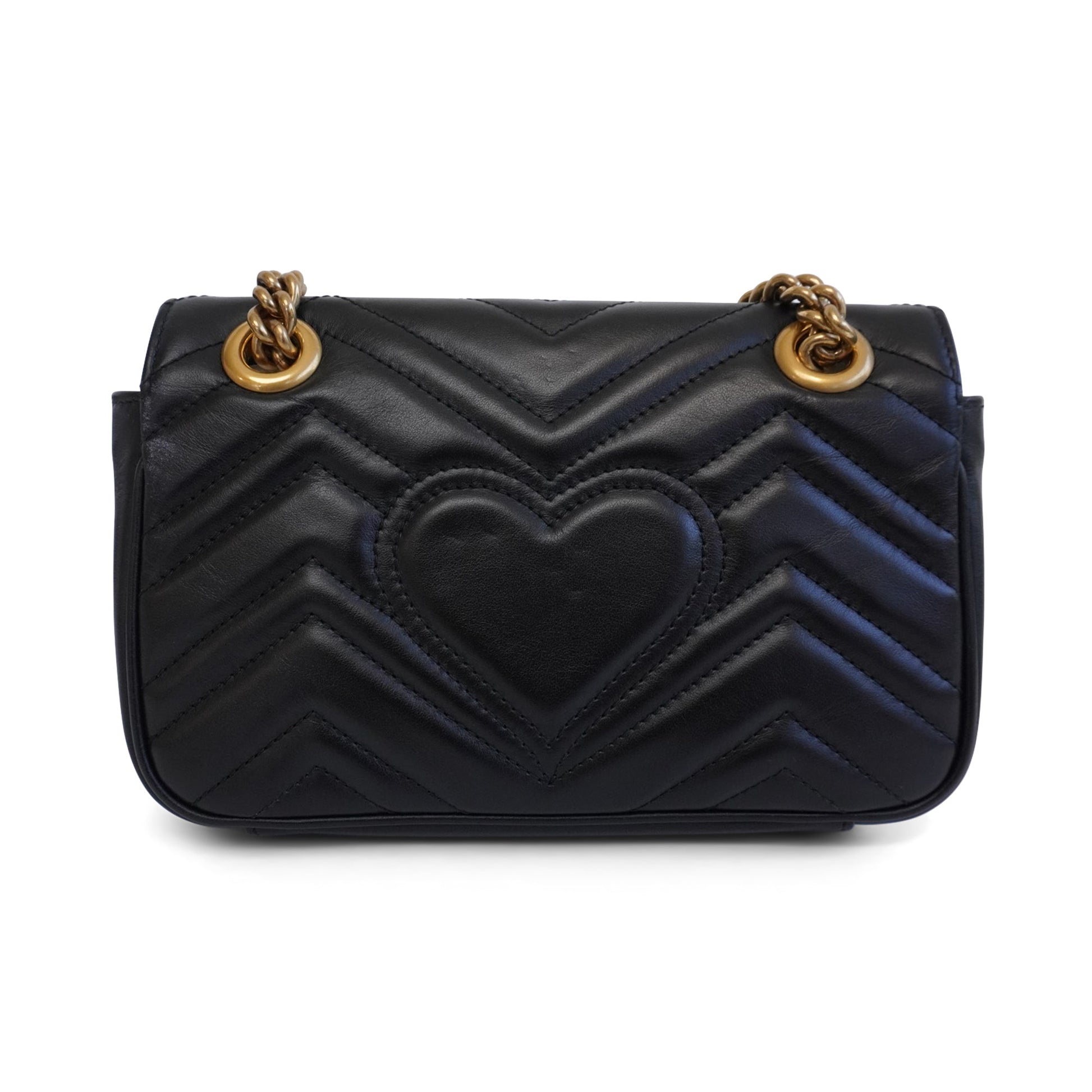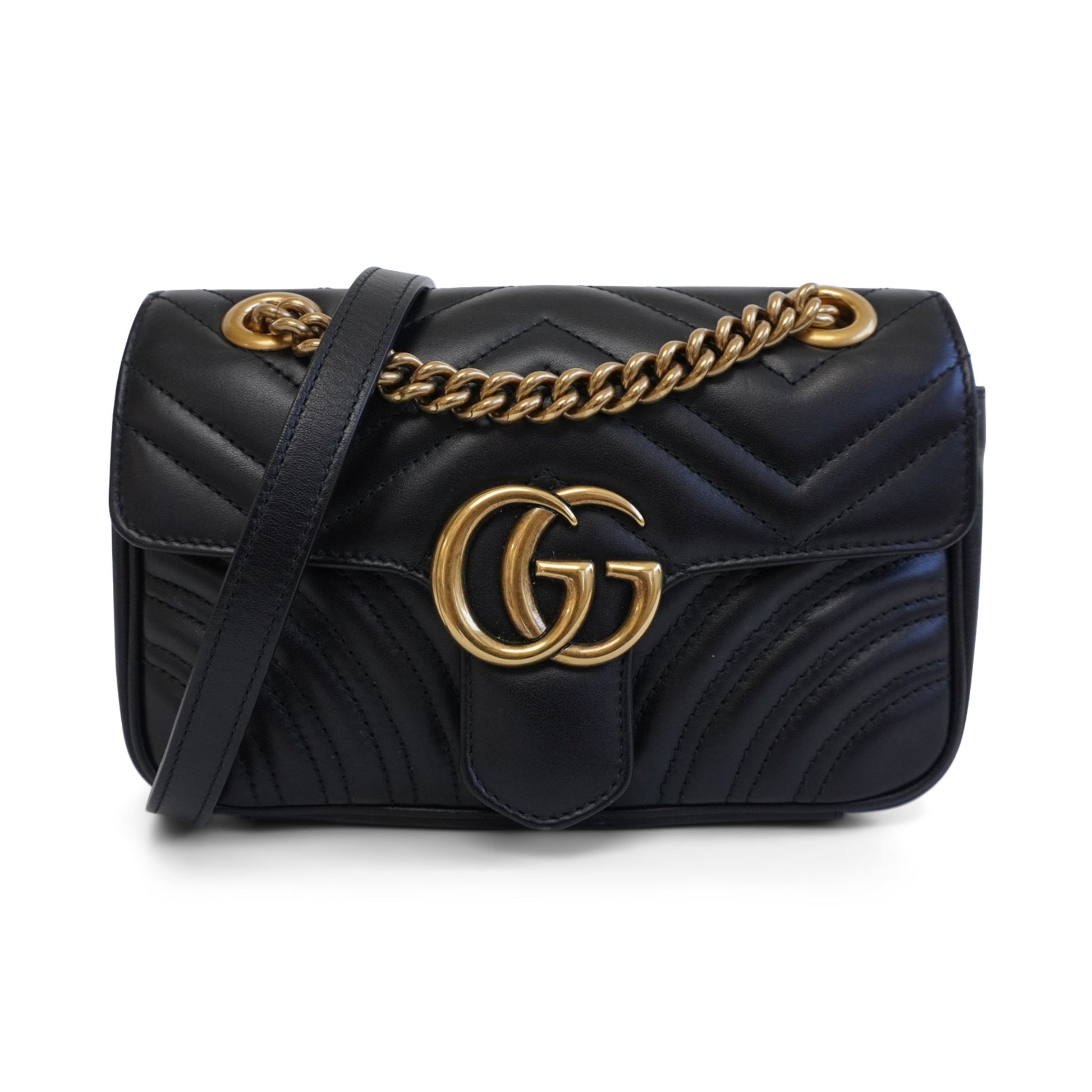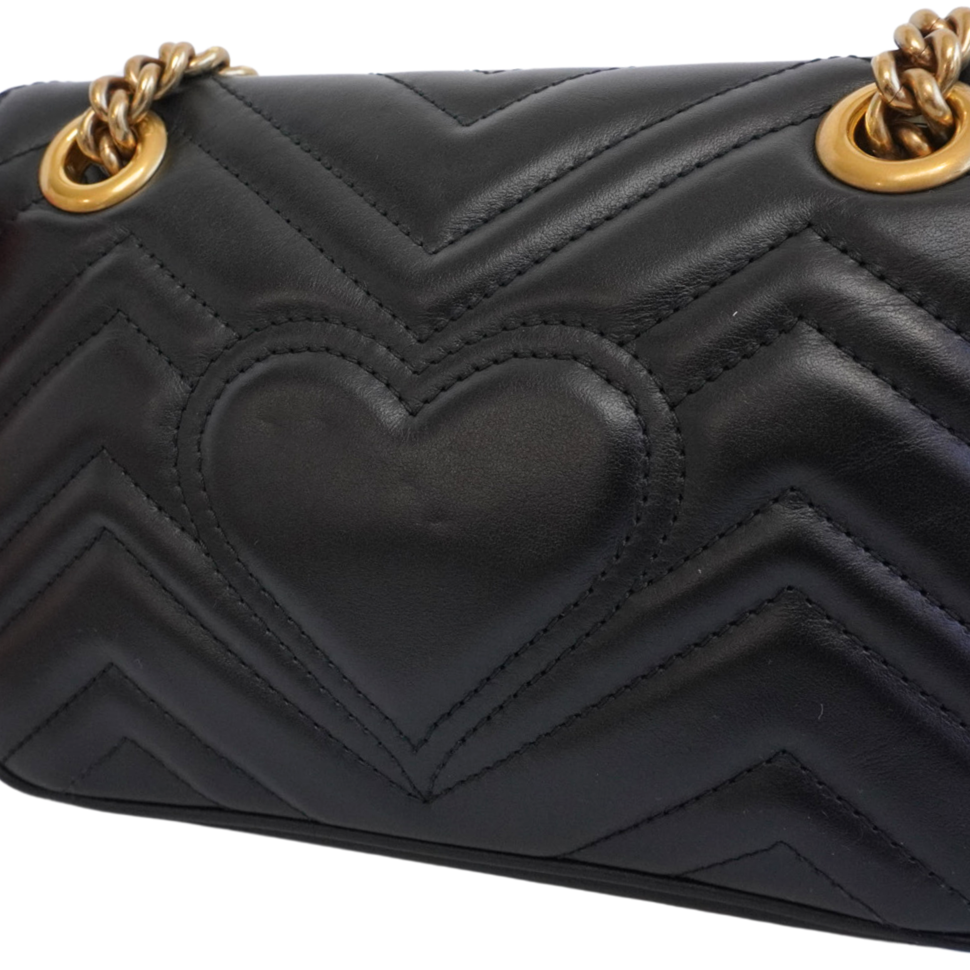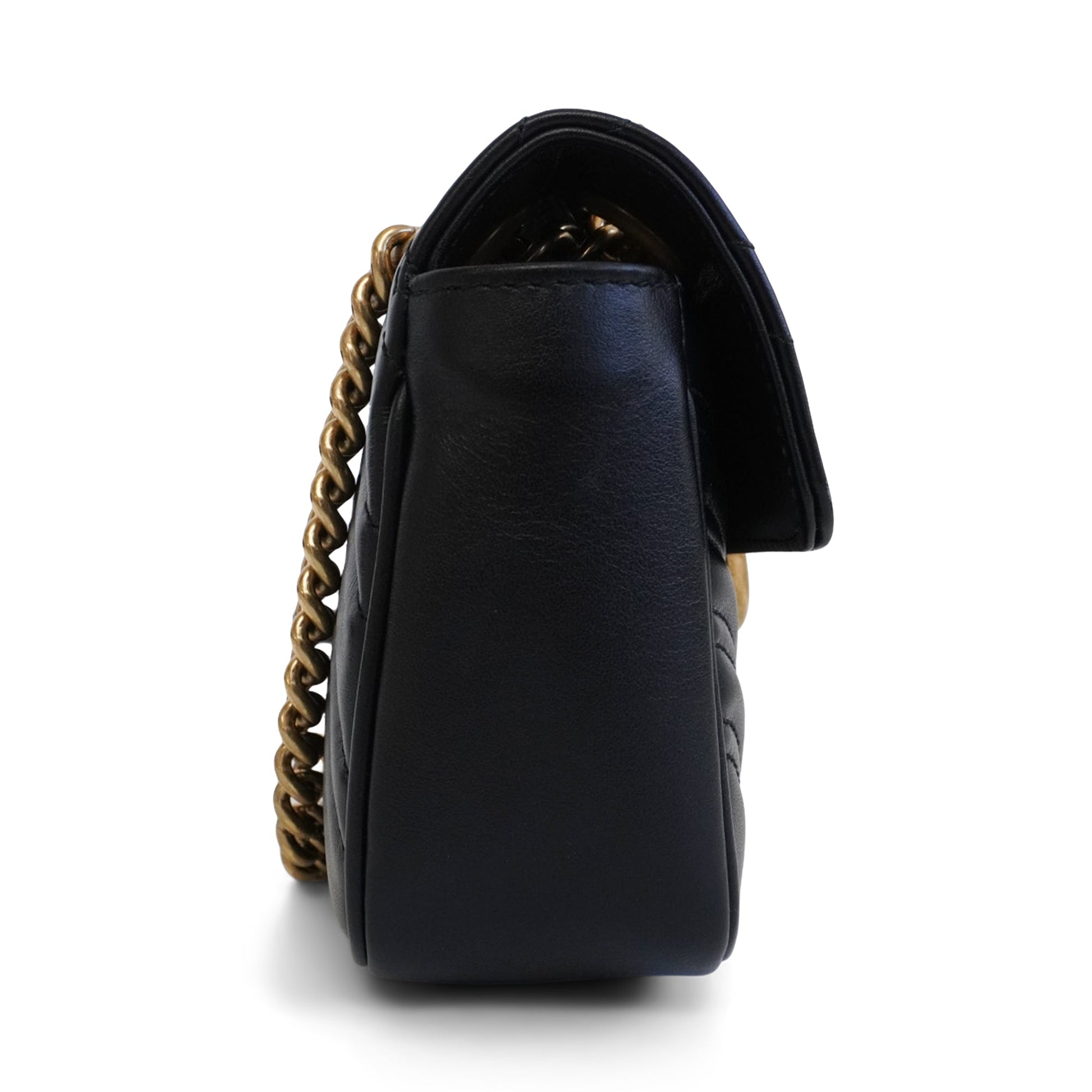 Gucci 'Marmont' shoulder bag in black matelass chevron leather with aged gold signature GG hardware. Features a hidden pushlock closure and light pink microsuede lining with interior slip pocket. The chain strap has a leather shoulder rest and can be worn on the shoulder or crossbody.
