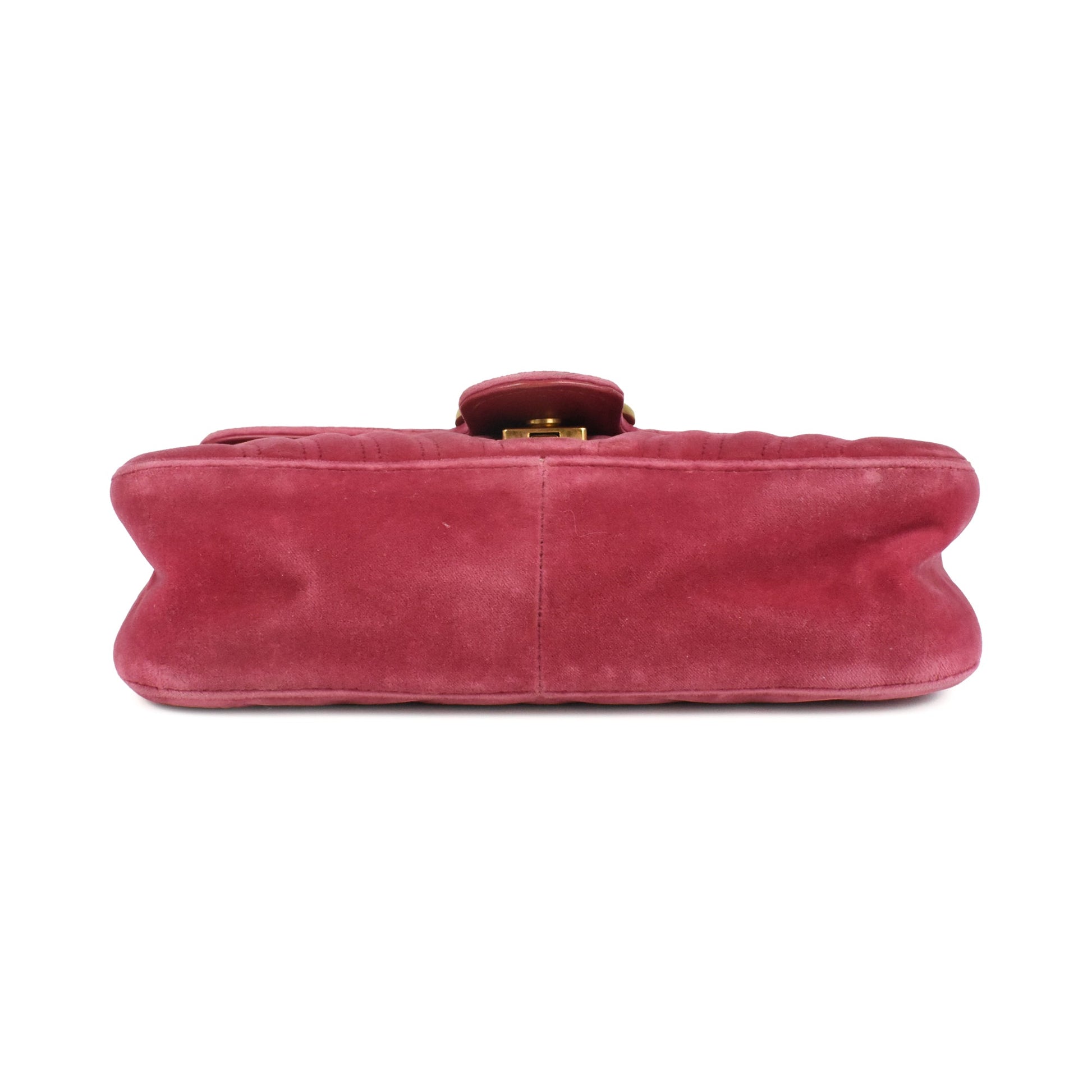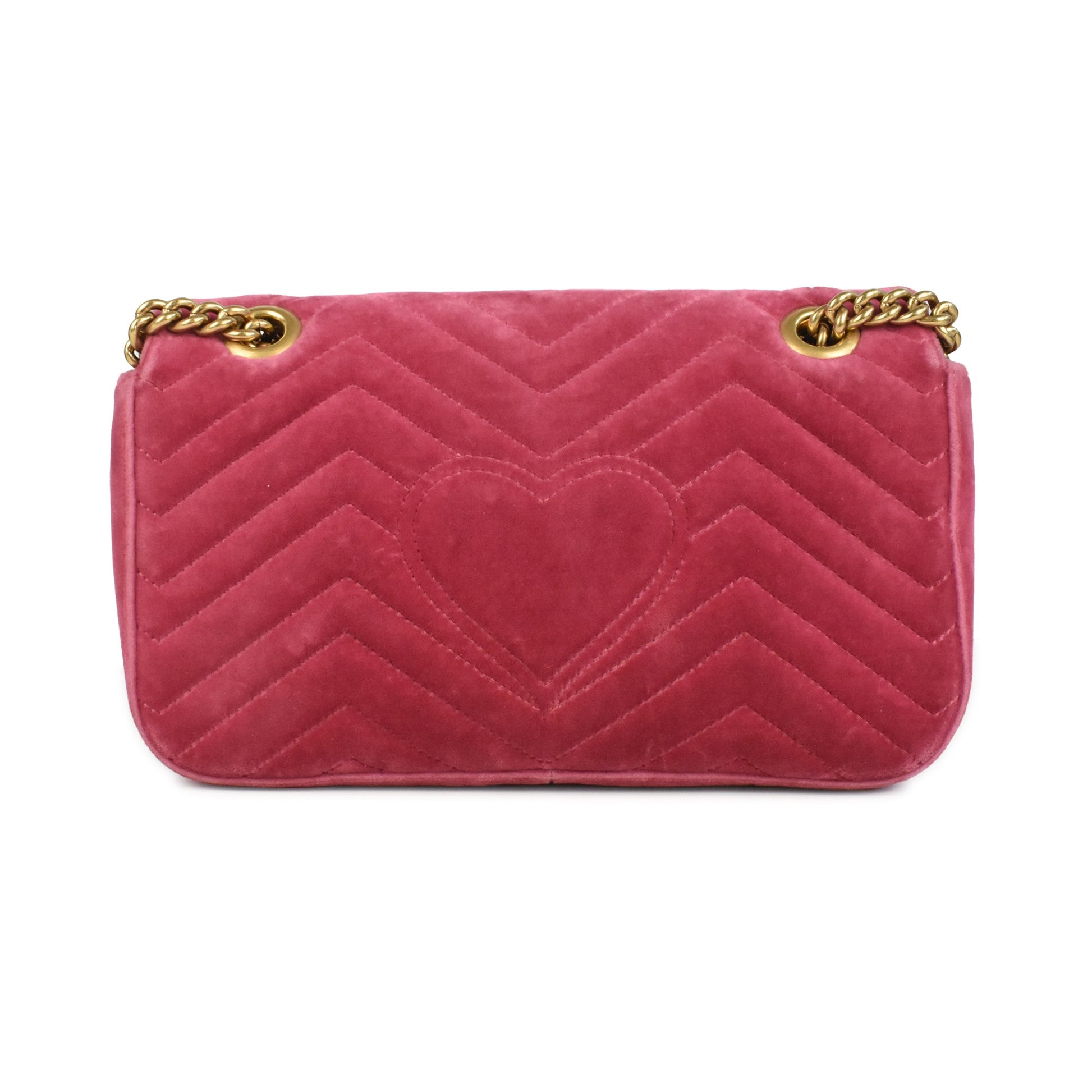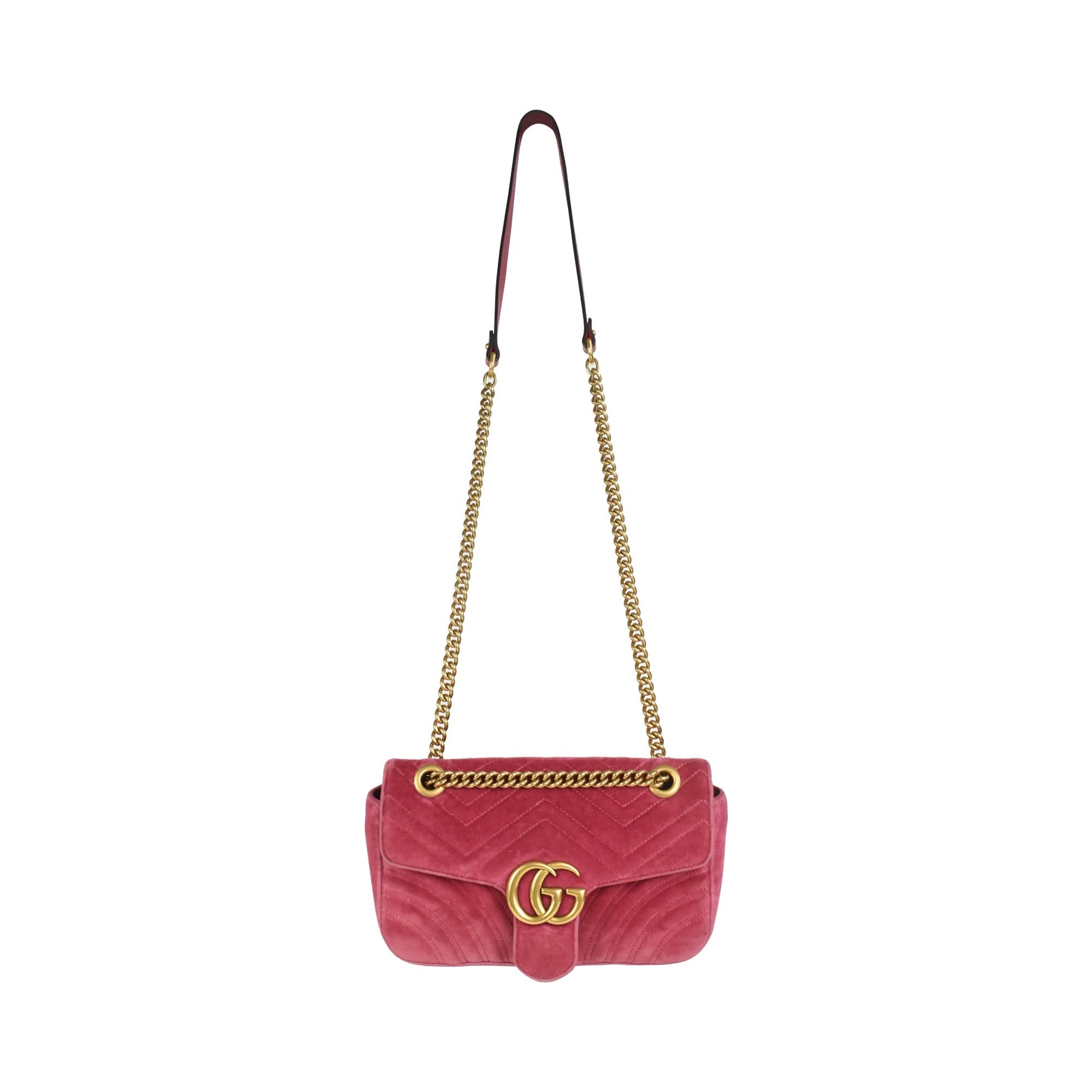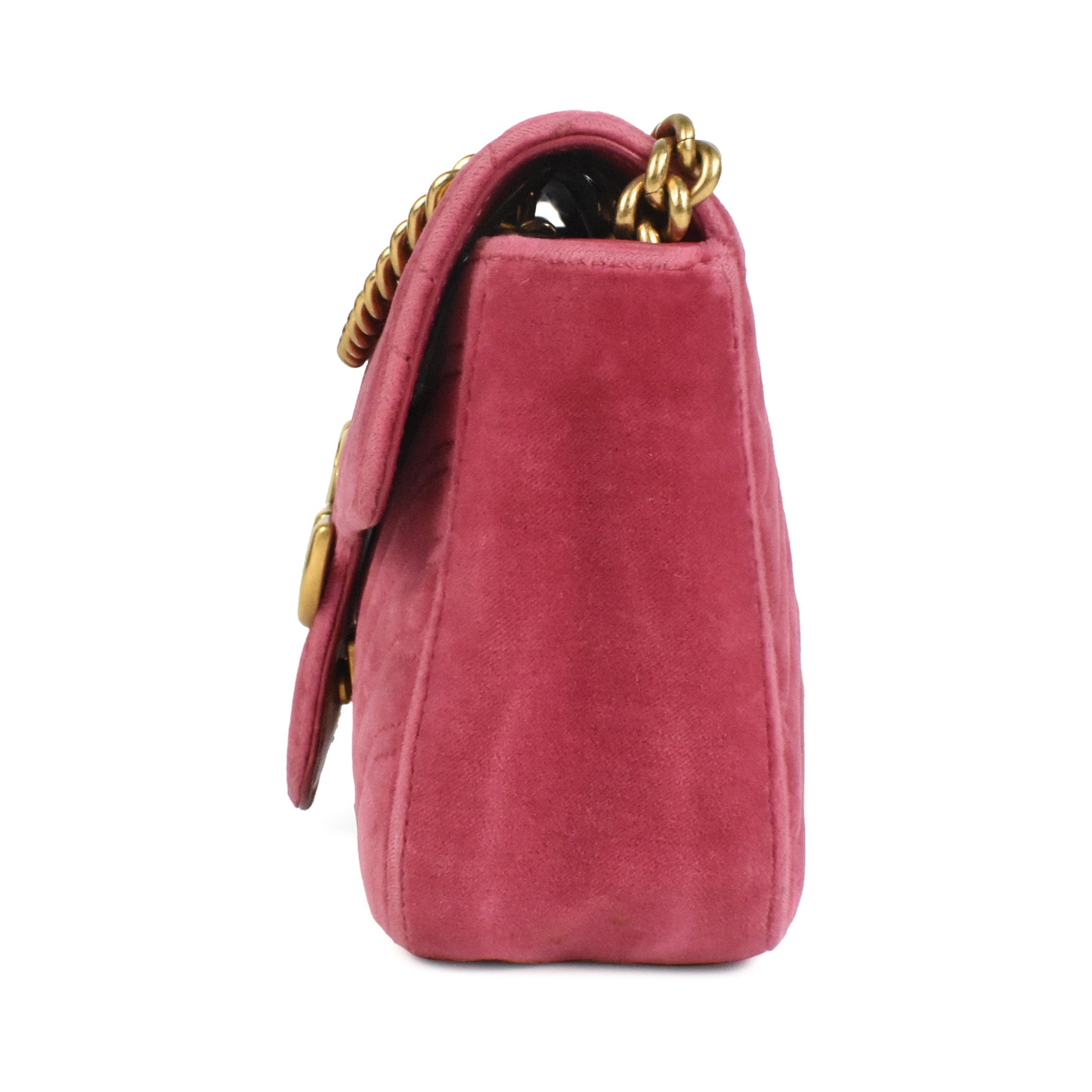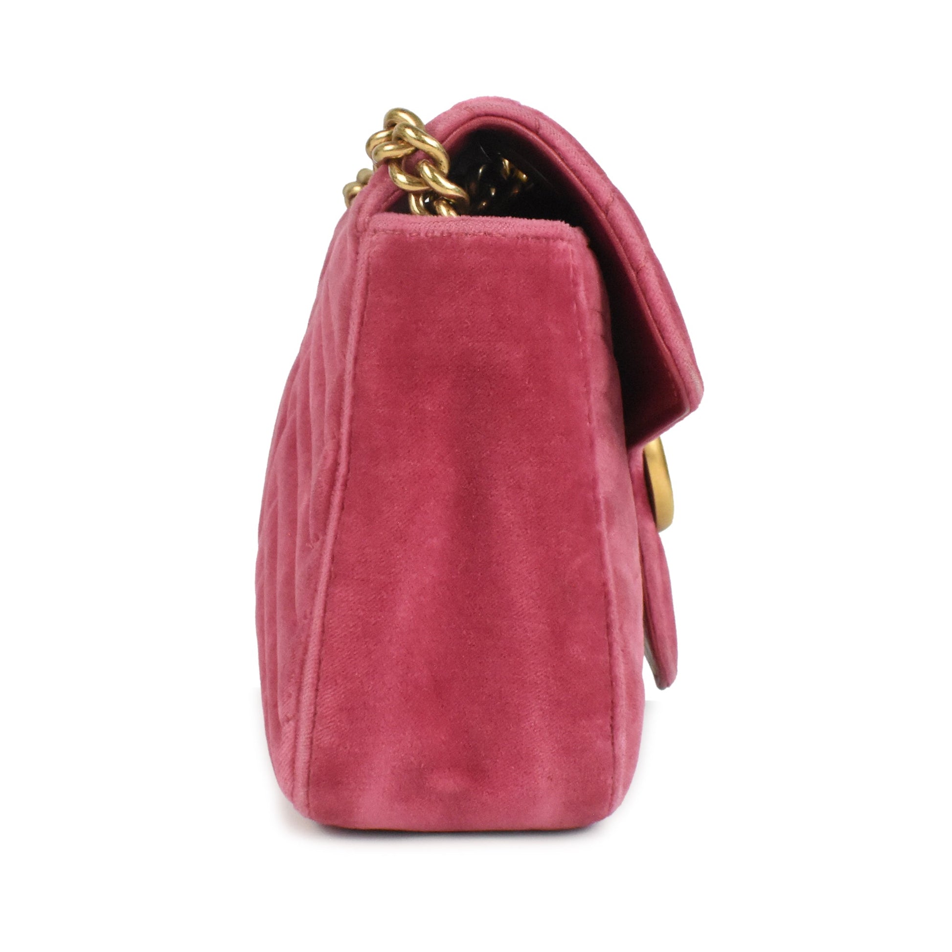 Gucci 'Marmont' handbag in magenta pink velvet with panel detailing throughout, a top flap opening with a push-lock closure, and a large 'GG' logo emblem in antiqued gold hardware. The bag has a long gold chain strap with leather trim that can be doubled up as a shoulder strap. Features a pink leather and blue satin inner lining with a single interior zip pocket.