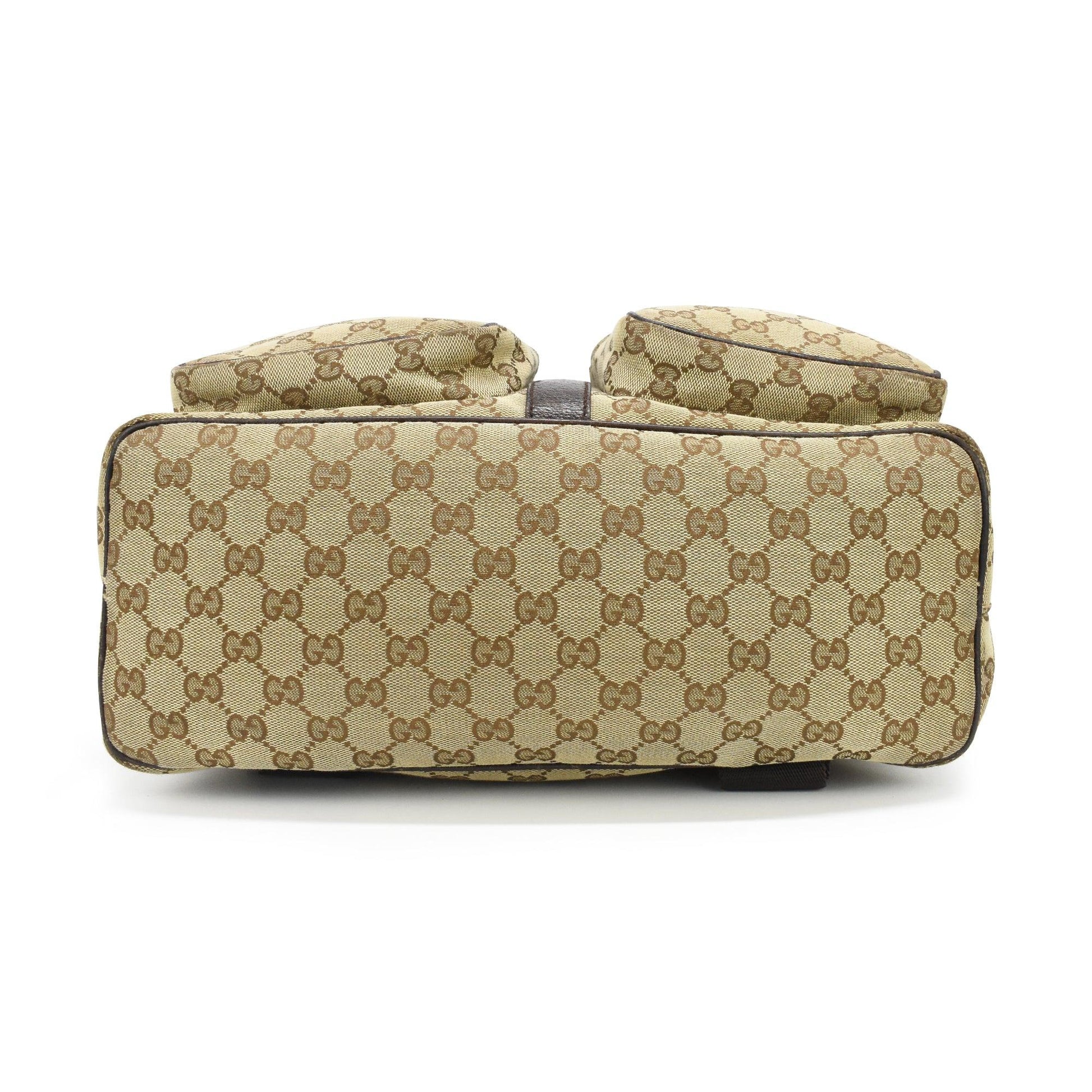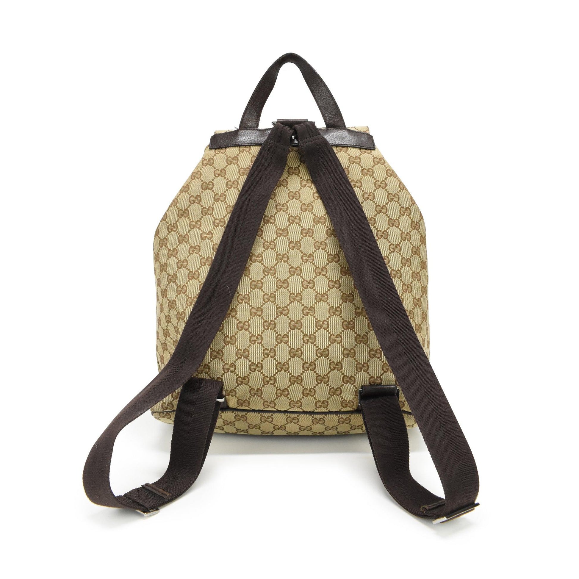 Gucci backpack in brown monogram canvas with a front flap latch closure and drawstring closure in brown leather. Features a brown leather top handle, brown canvas adjustable shoulder straps and two large zip pockets. The bag has brown canvas inner lining with a zip pocket.
