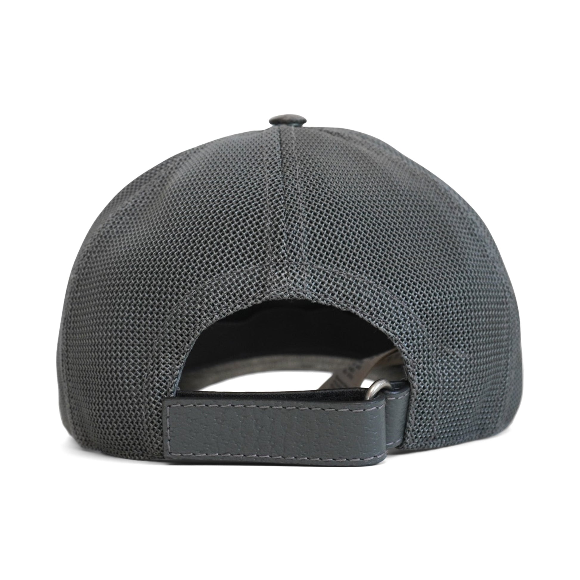 Gucci baseball cap in grey 'GG Supreme' monogram coated canvas with green-grey mesh accents and a silver 'GG" logo at the centre.