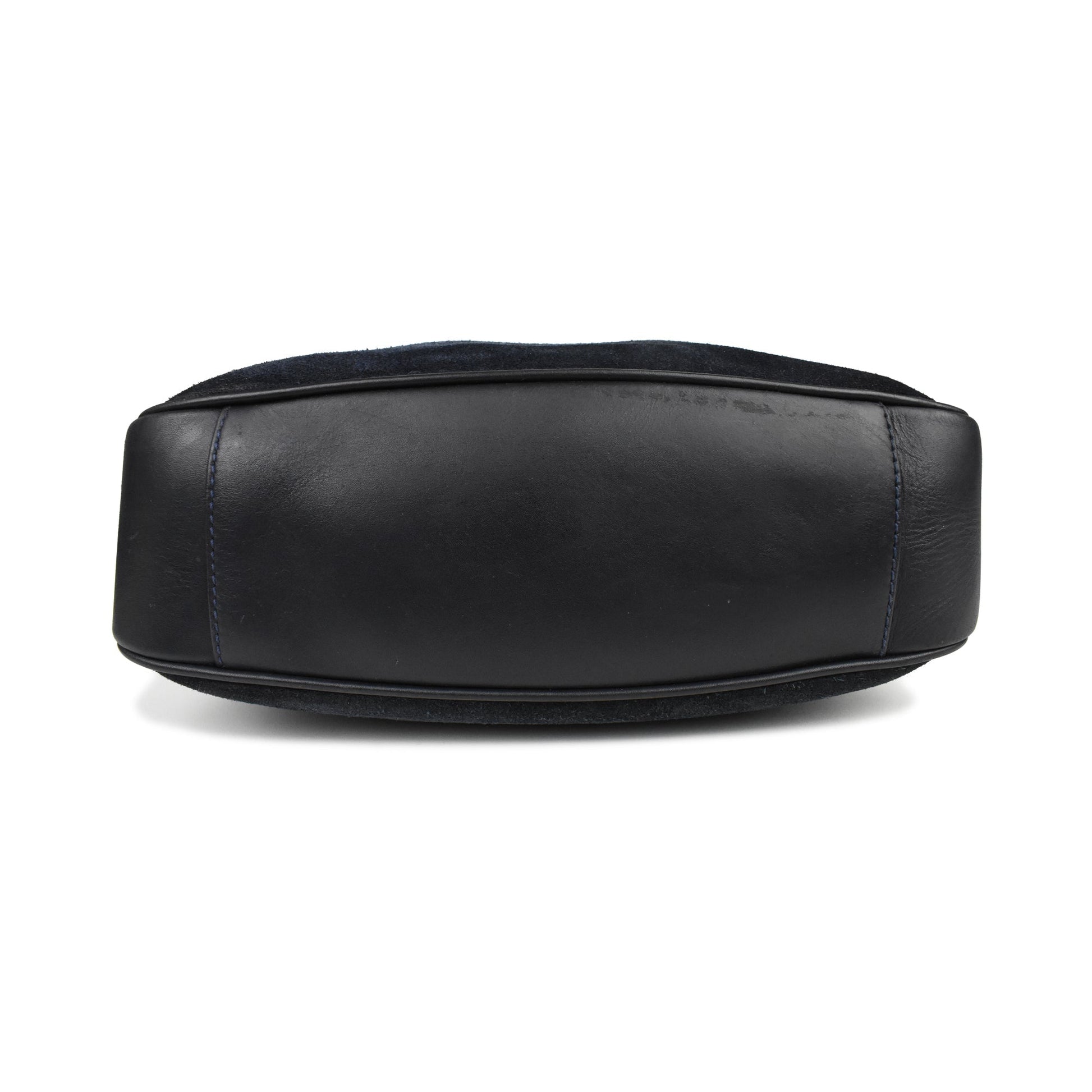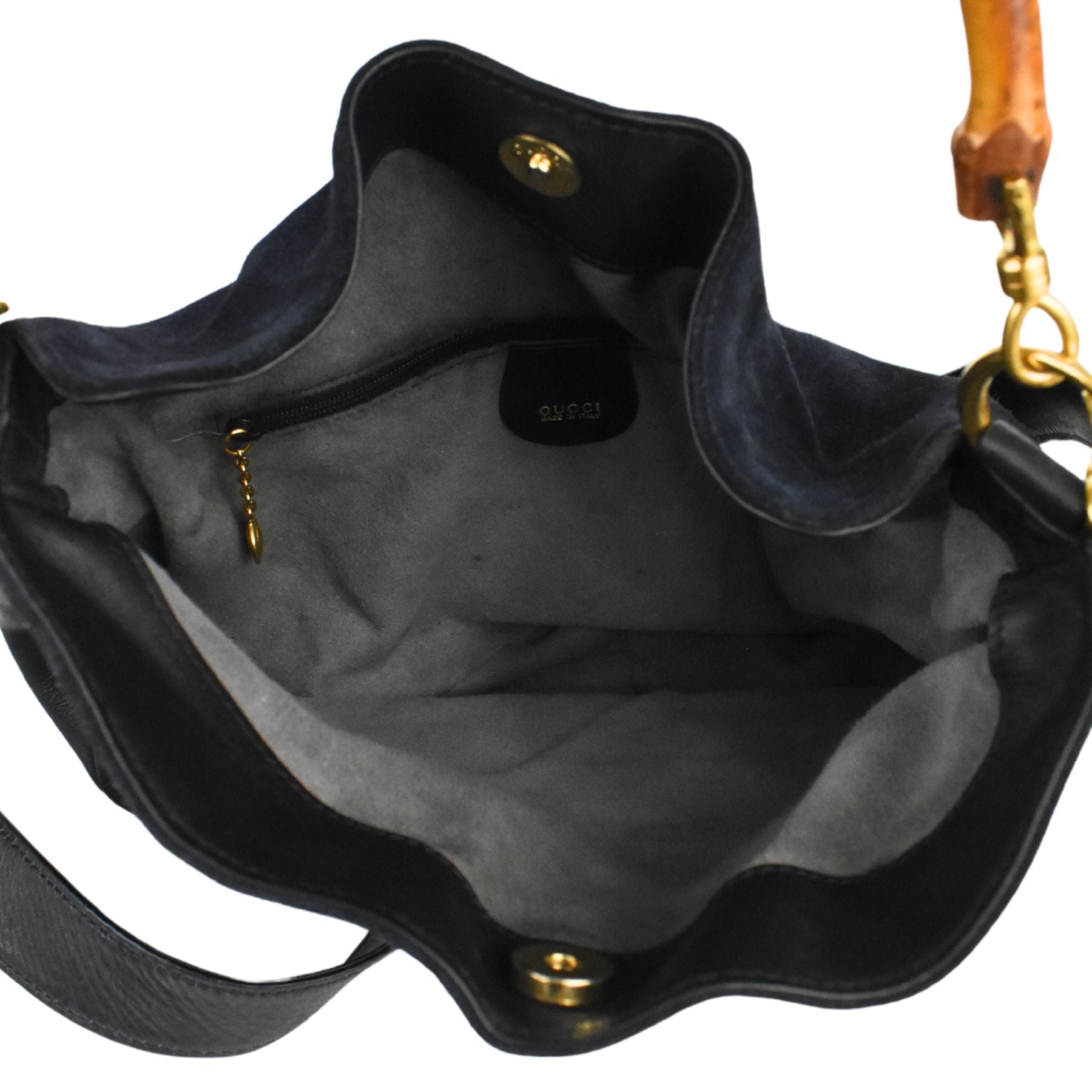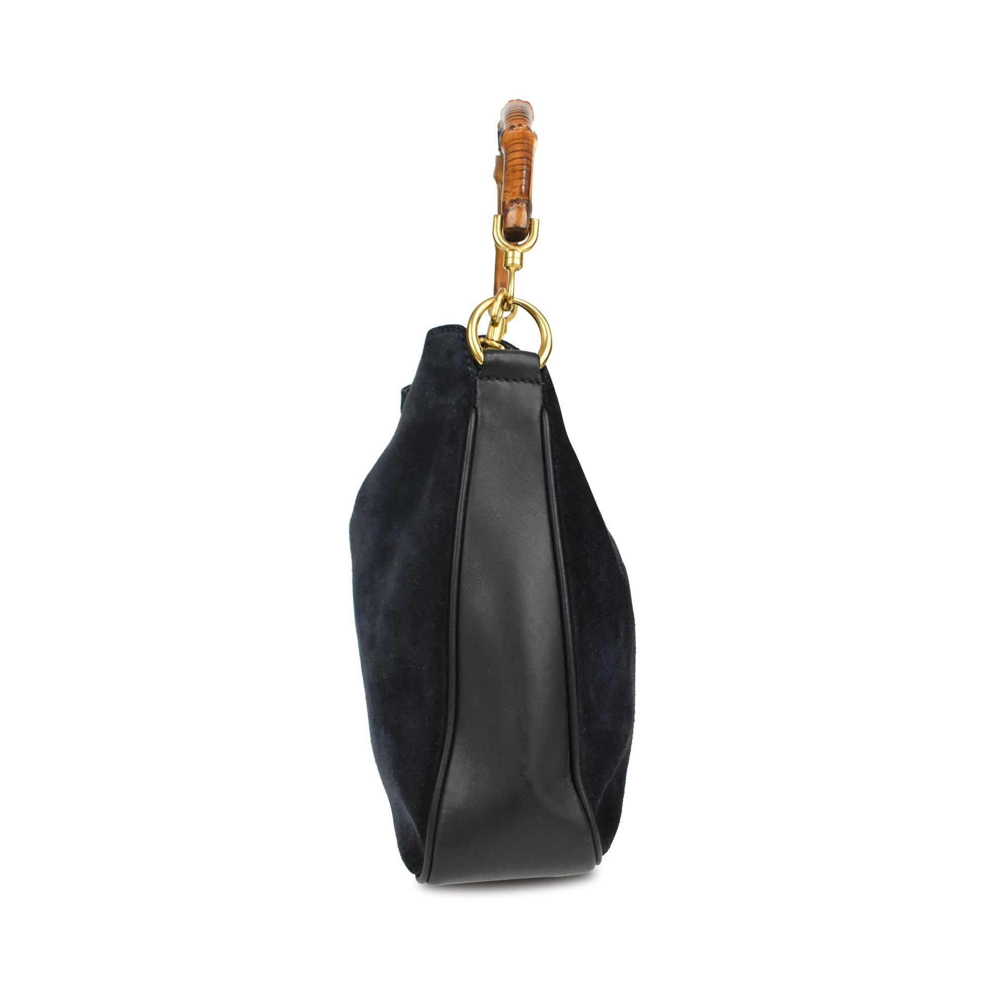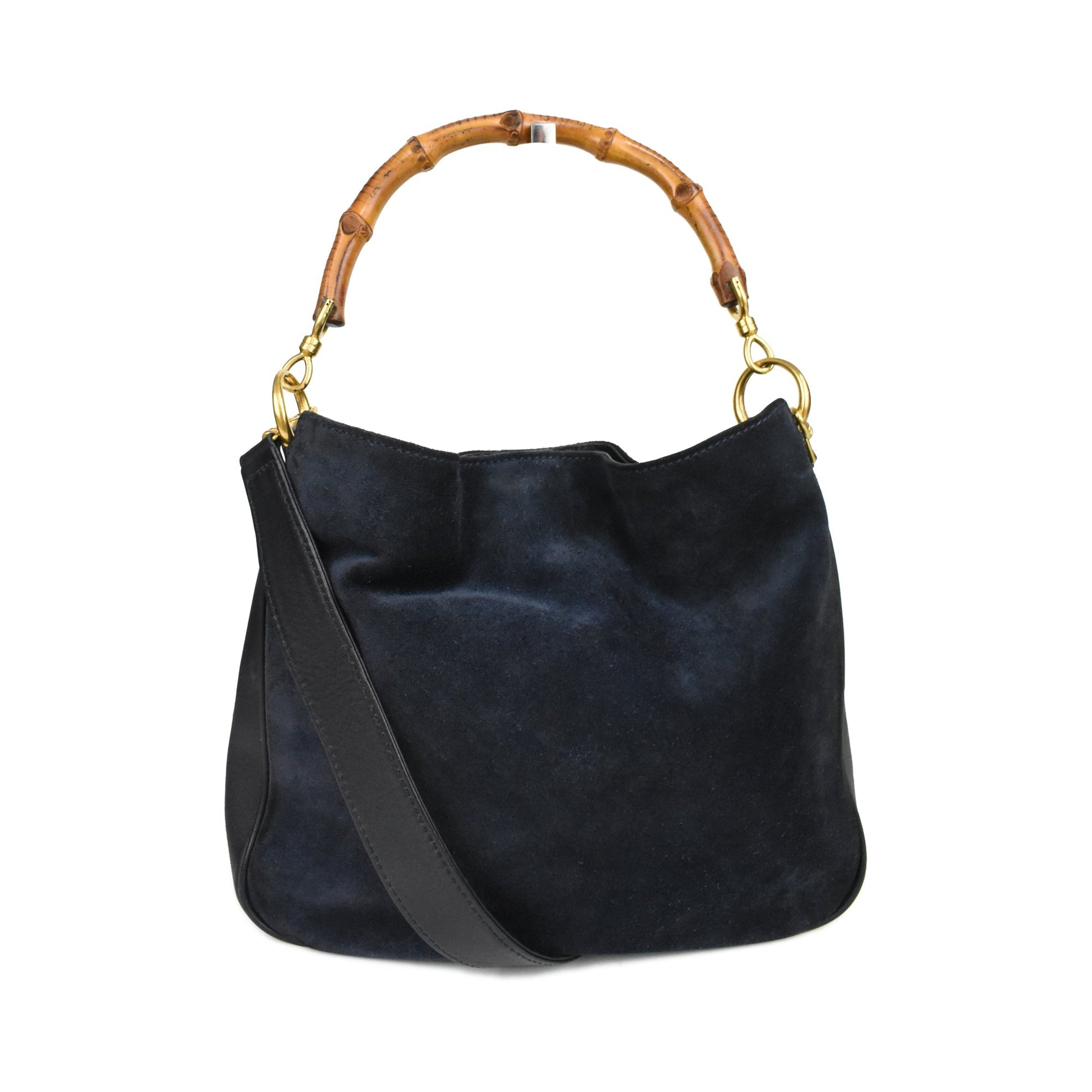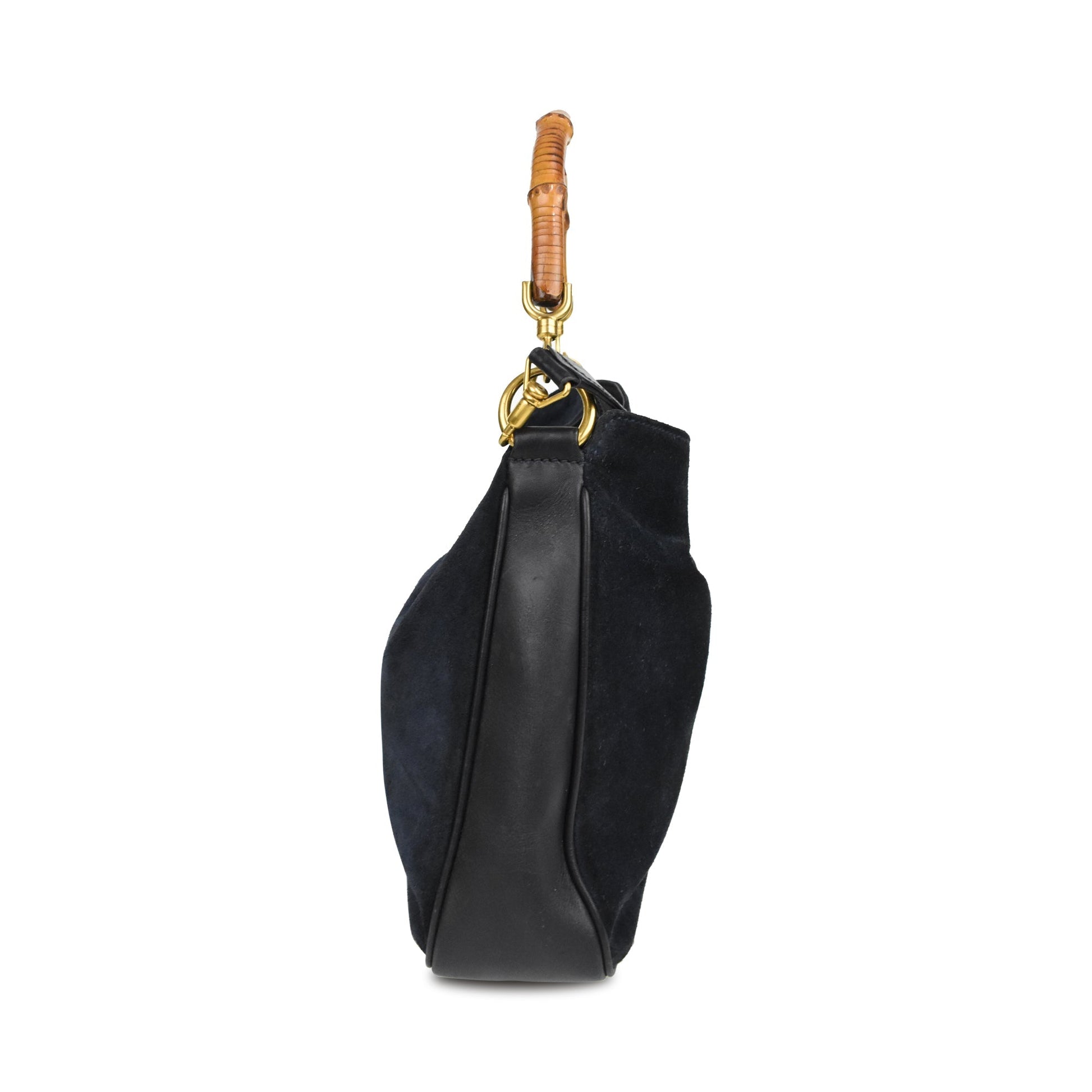 Gucci vintage bamboo handbag in navy blue suede and leather with a top push button closure in gold hardware. Features a single bamboo handle with a detachable shoulder strap, and grey canvas lining with an inner zip pocket.