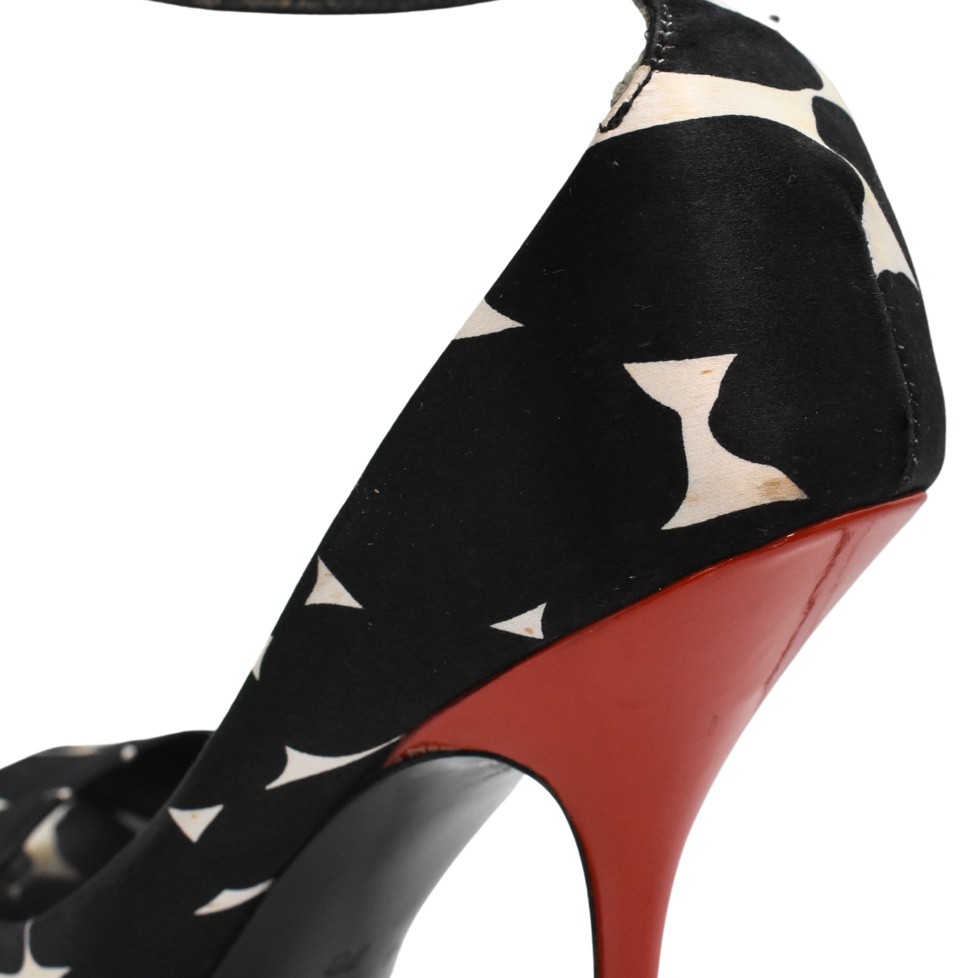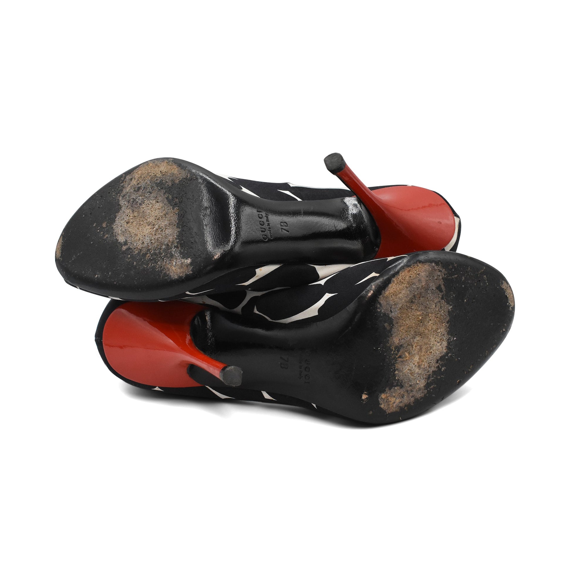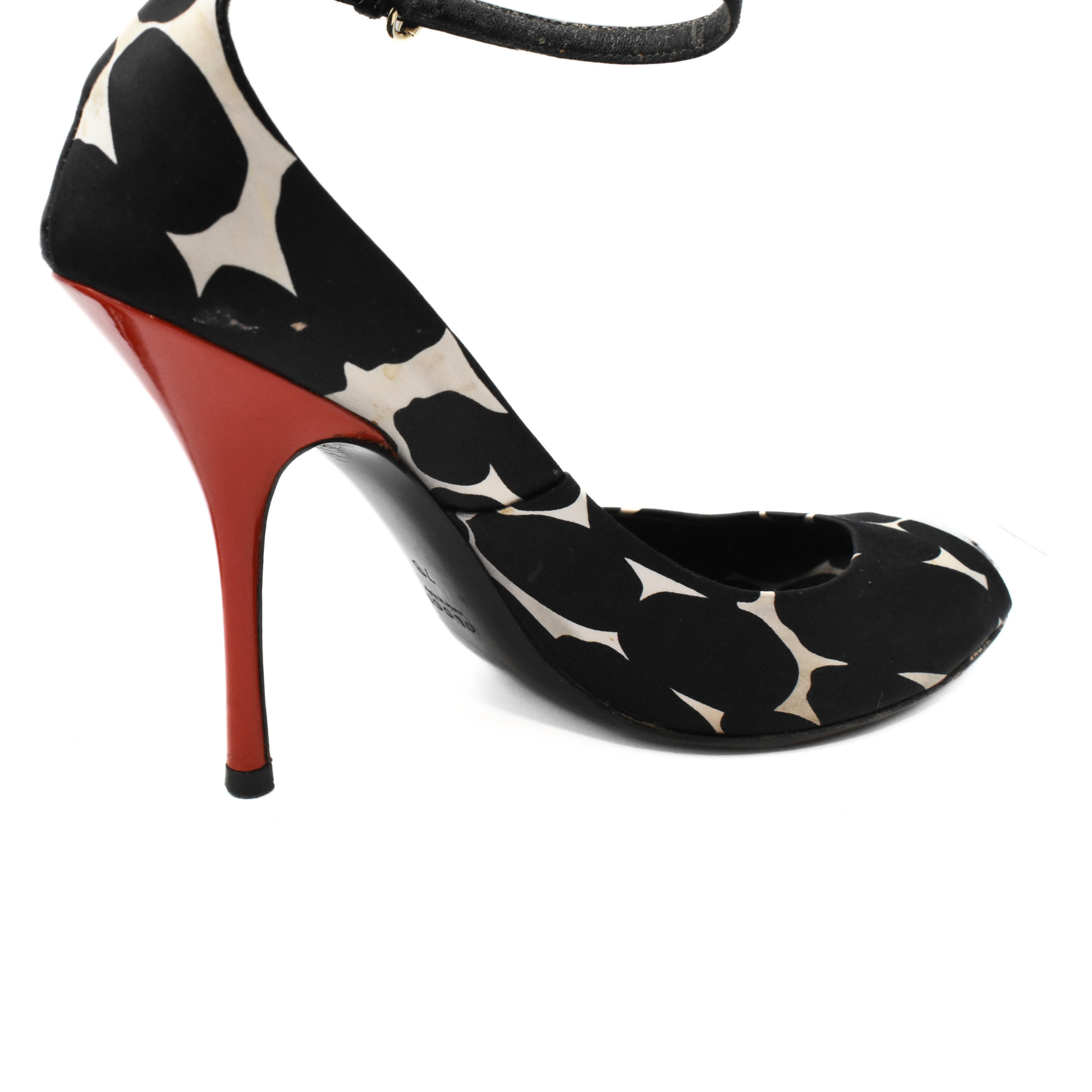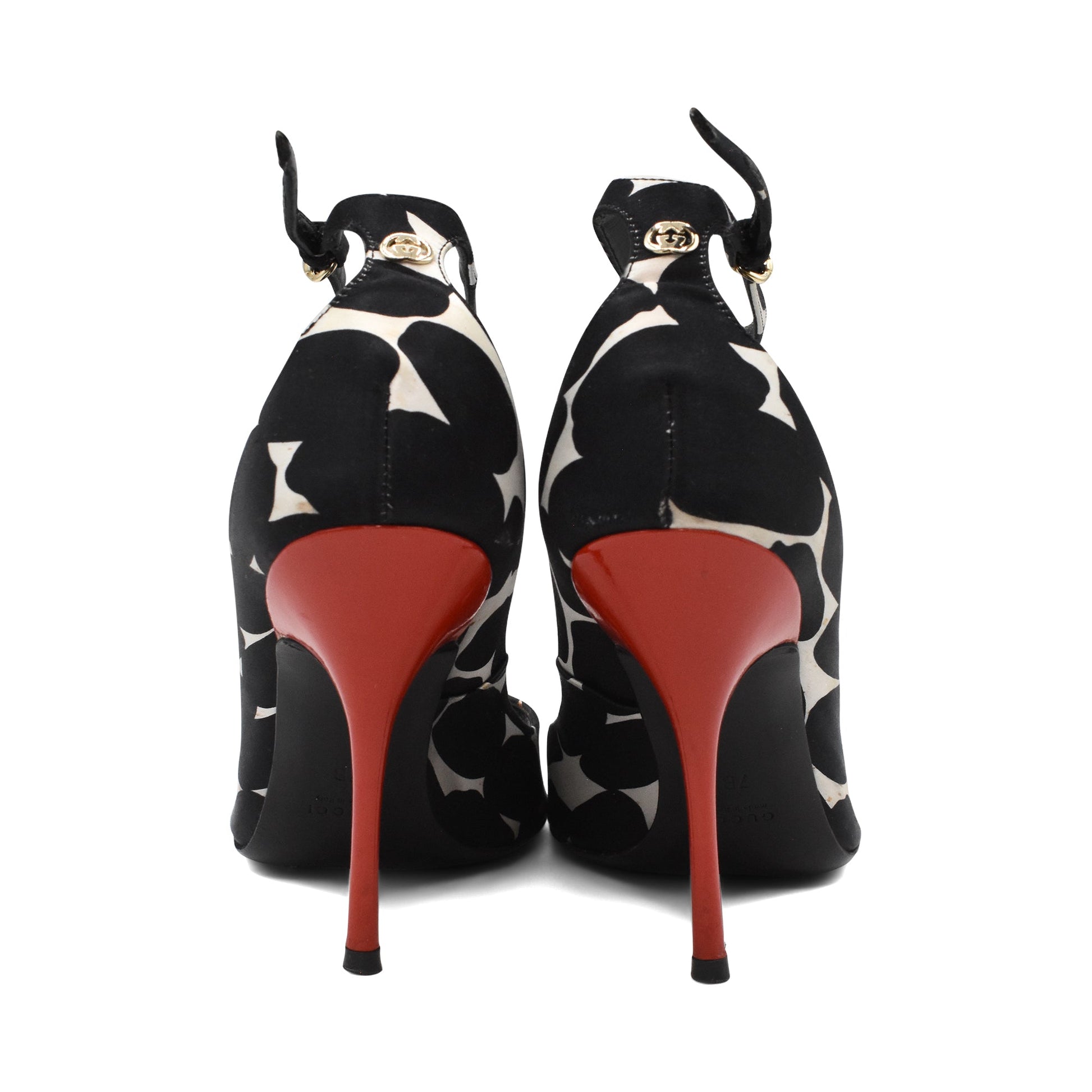 Gucci 'Nero Blanco' heels in black and white polka-dot satin with a red vinyl heel, an ankle strap with silver buckle hardware, and a peep toe.