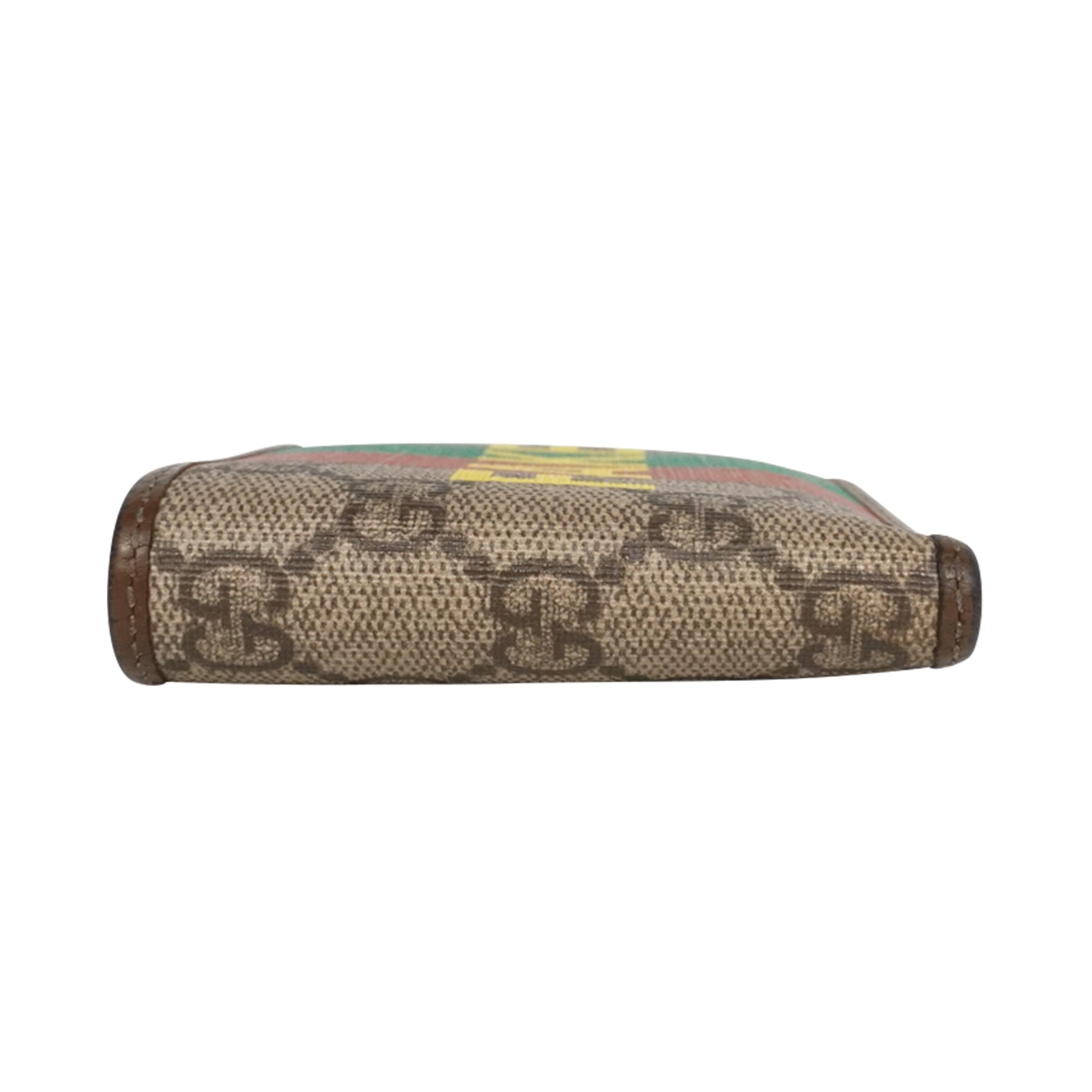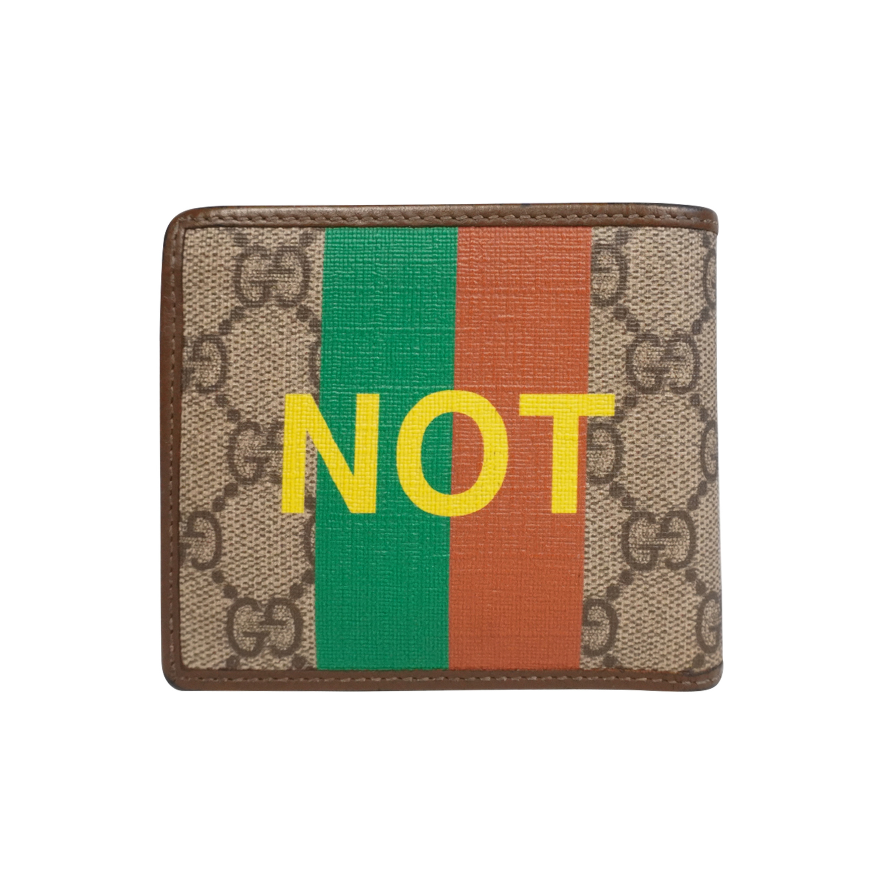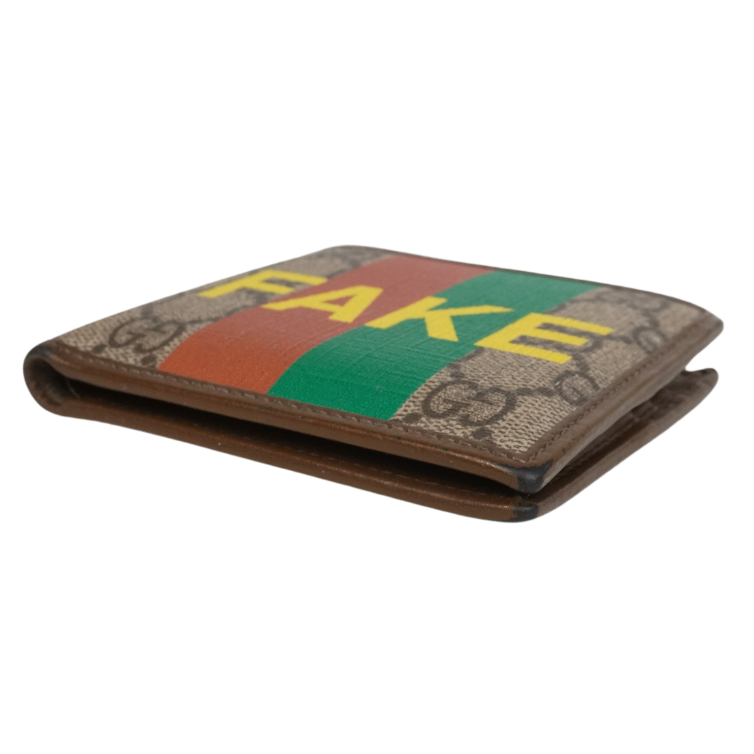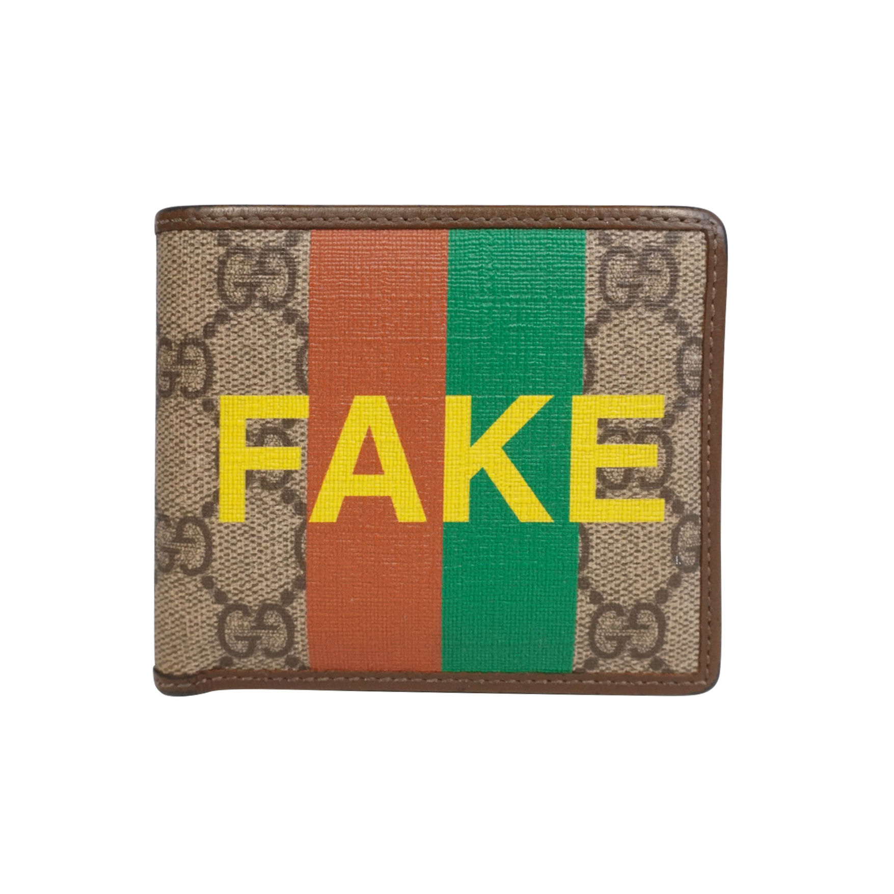 Gucci bi-fold wallet in brown 'GG' monogram printed coated canvas with brown leather trim, a red and green racing stripe, and a large yellow 'NOT FAKE' text graphic across the exterior.