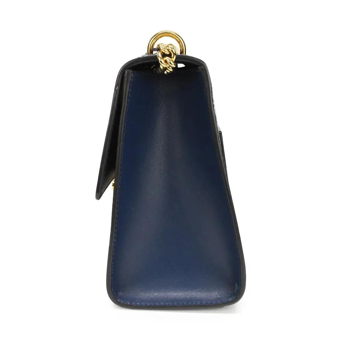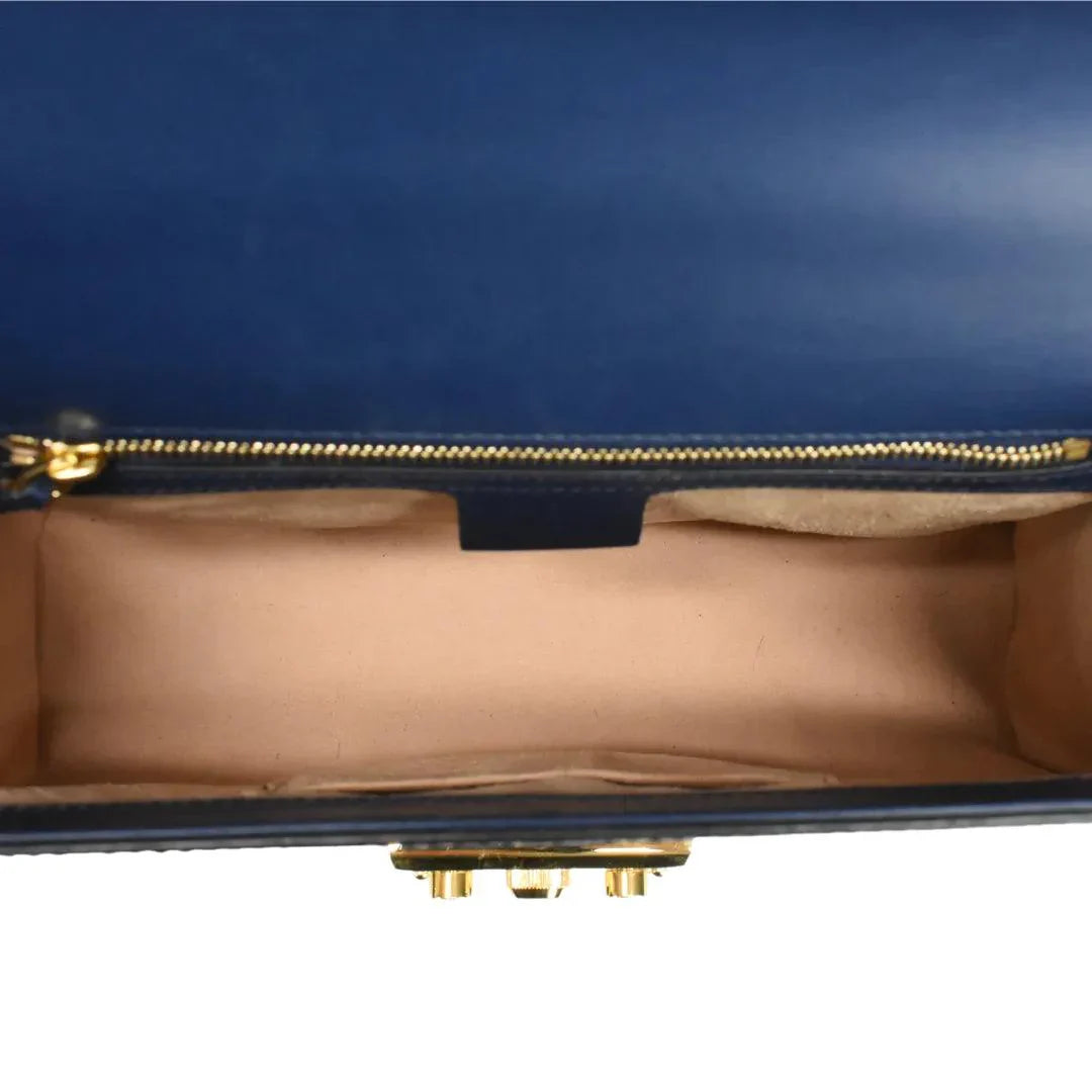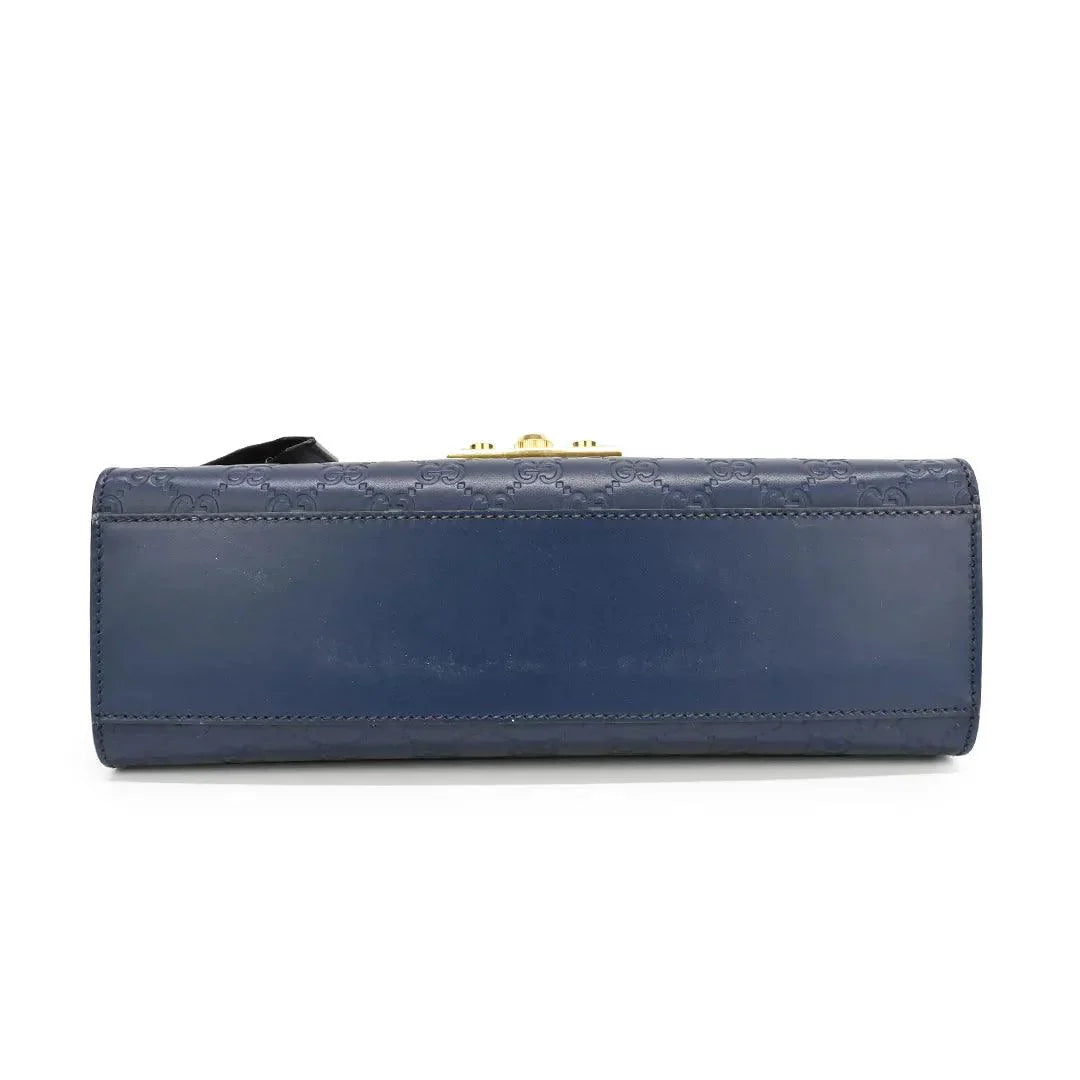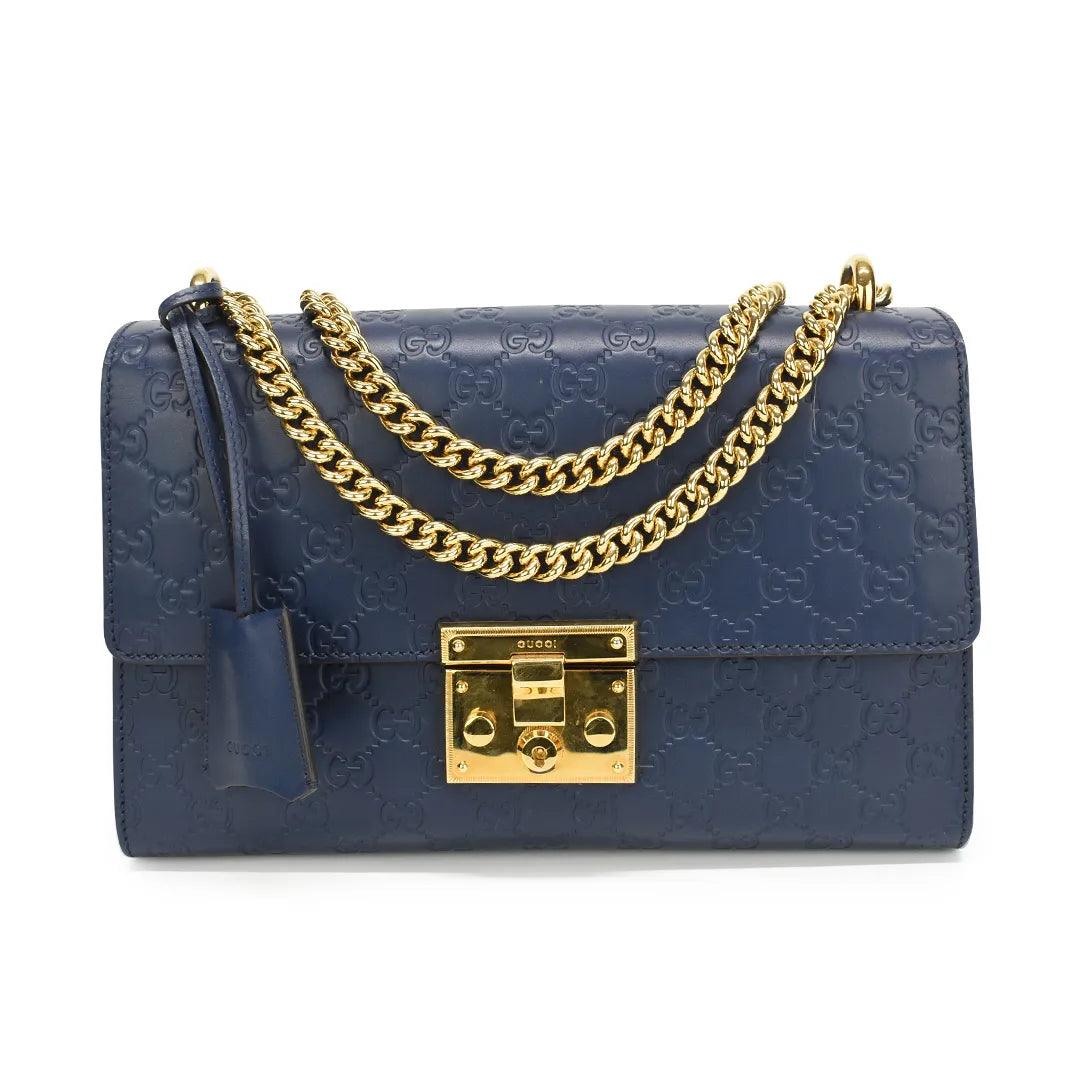 Gucci 'Padlock' handbag in Guccissima monogram embossed navy blue leather. Features a gold padlock closure, gold chain that can be worn as a short or long strap, and back slip-pocket. The interior is beige suede-lined with a zip pocket and two slip pockets.