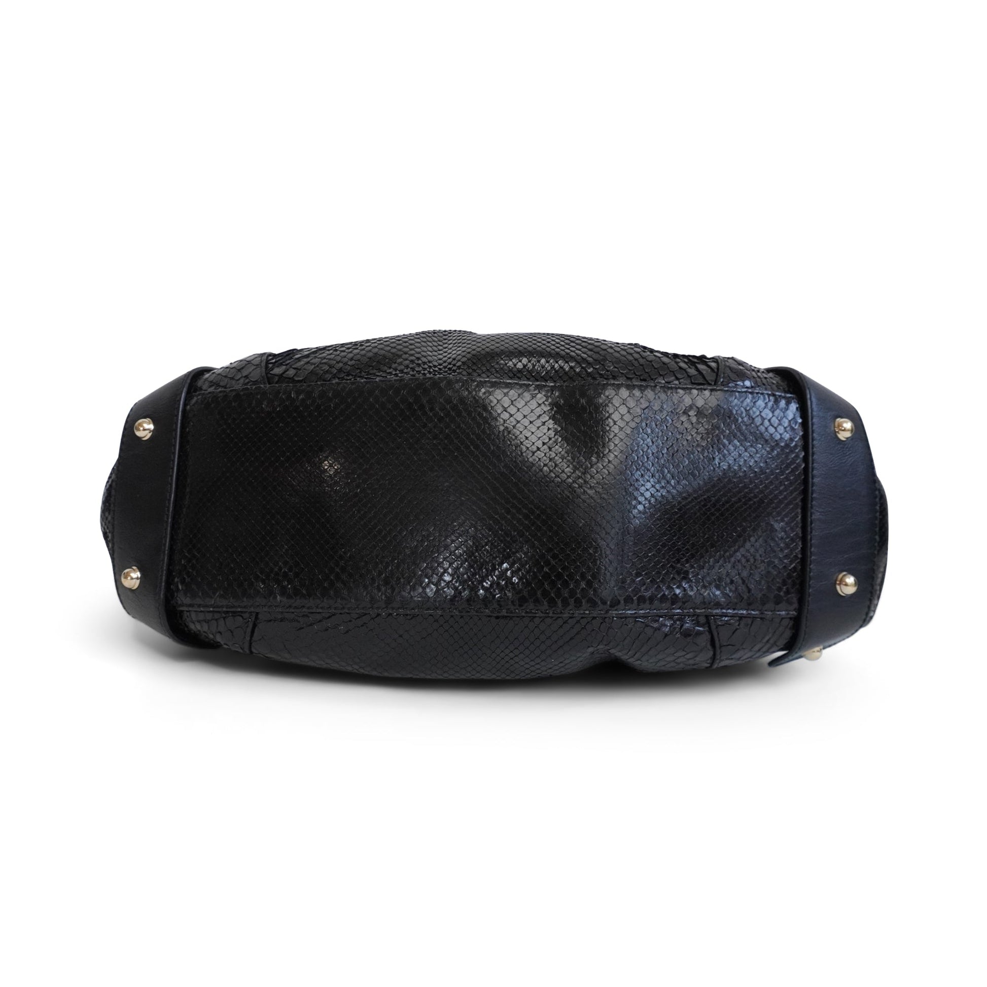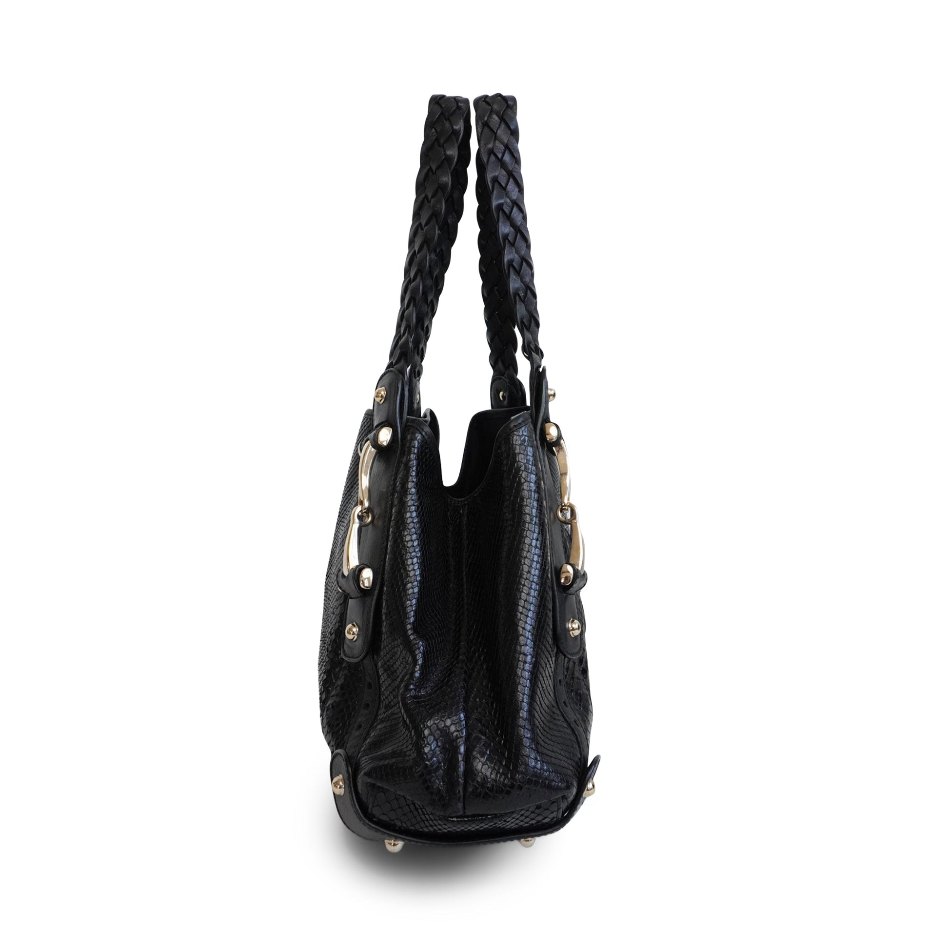 Gucci 'Pelham' shoulder bag in black snakeskin with braided leather straps and oversized gold horsebit hardware. Features an interior strap that draws the gussets in, black fabric lining, and flat zip pocket.