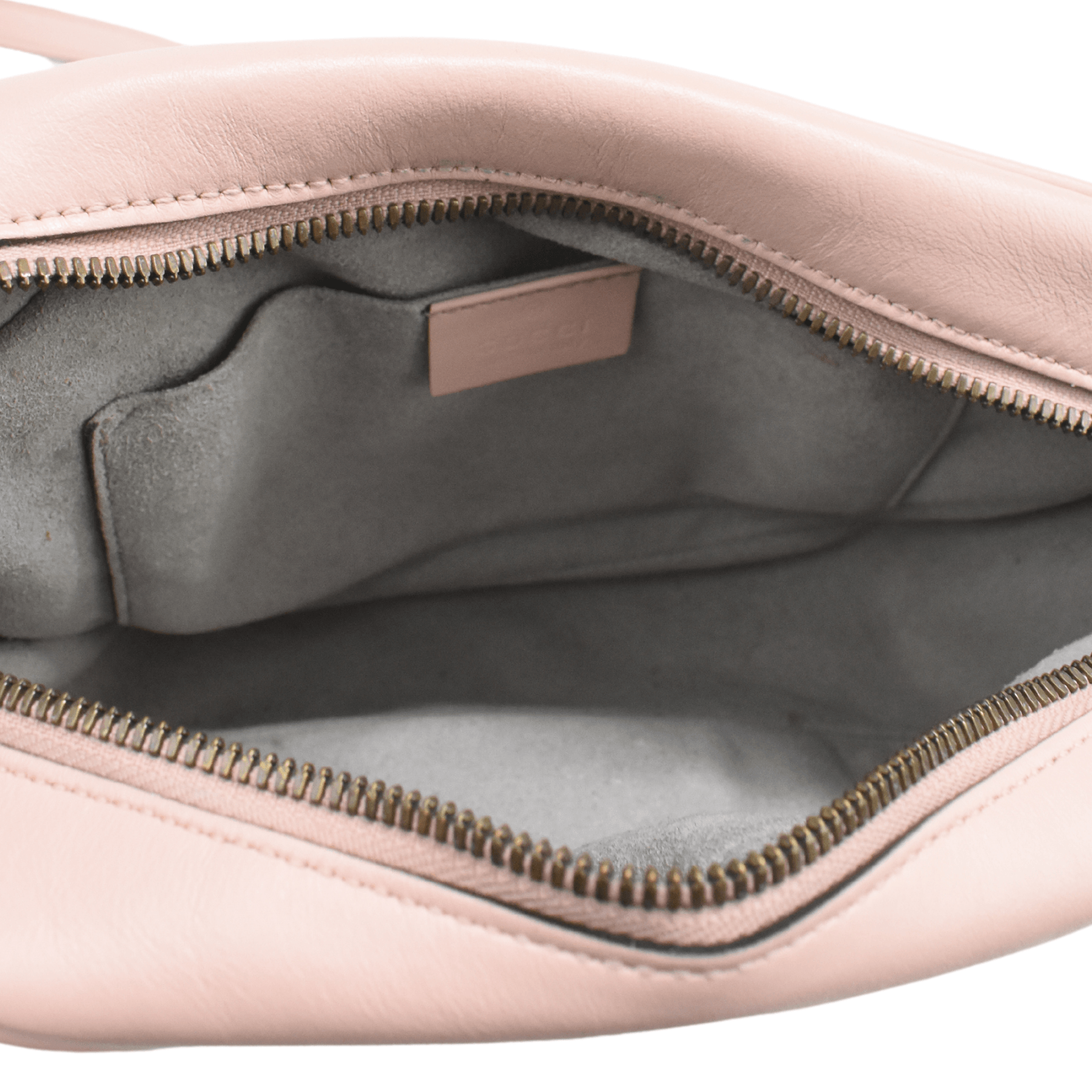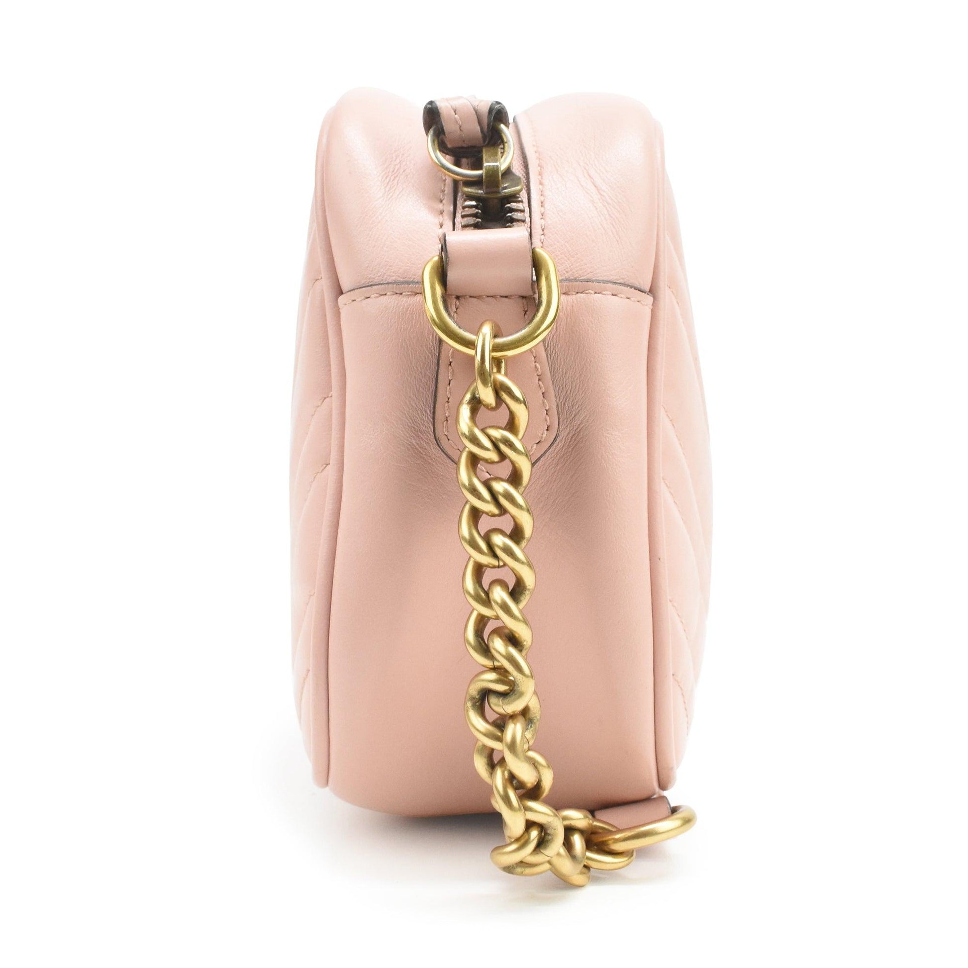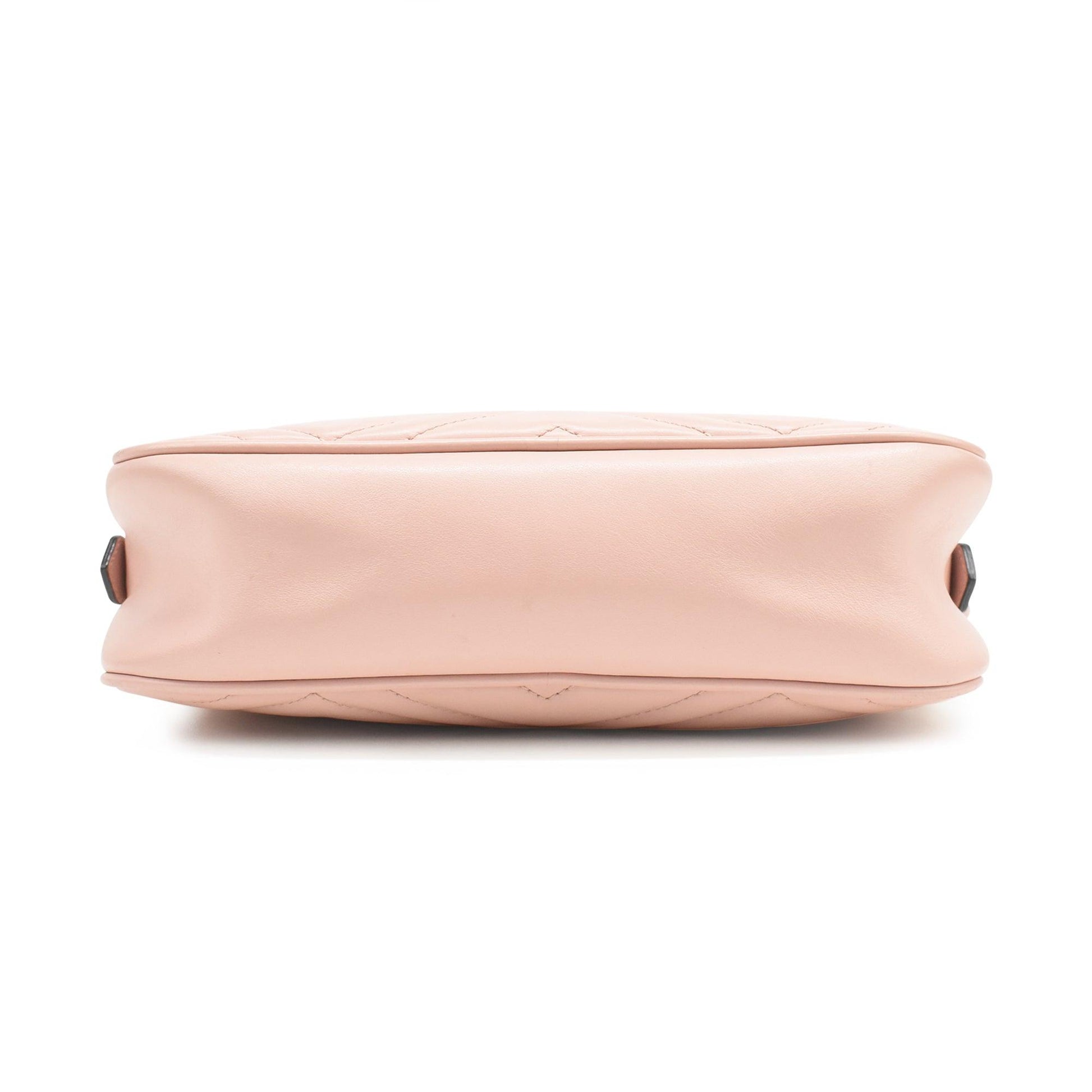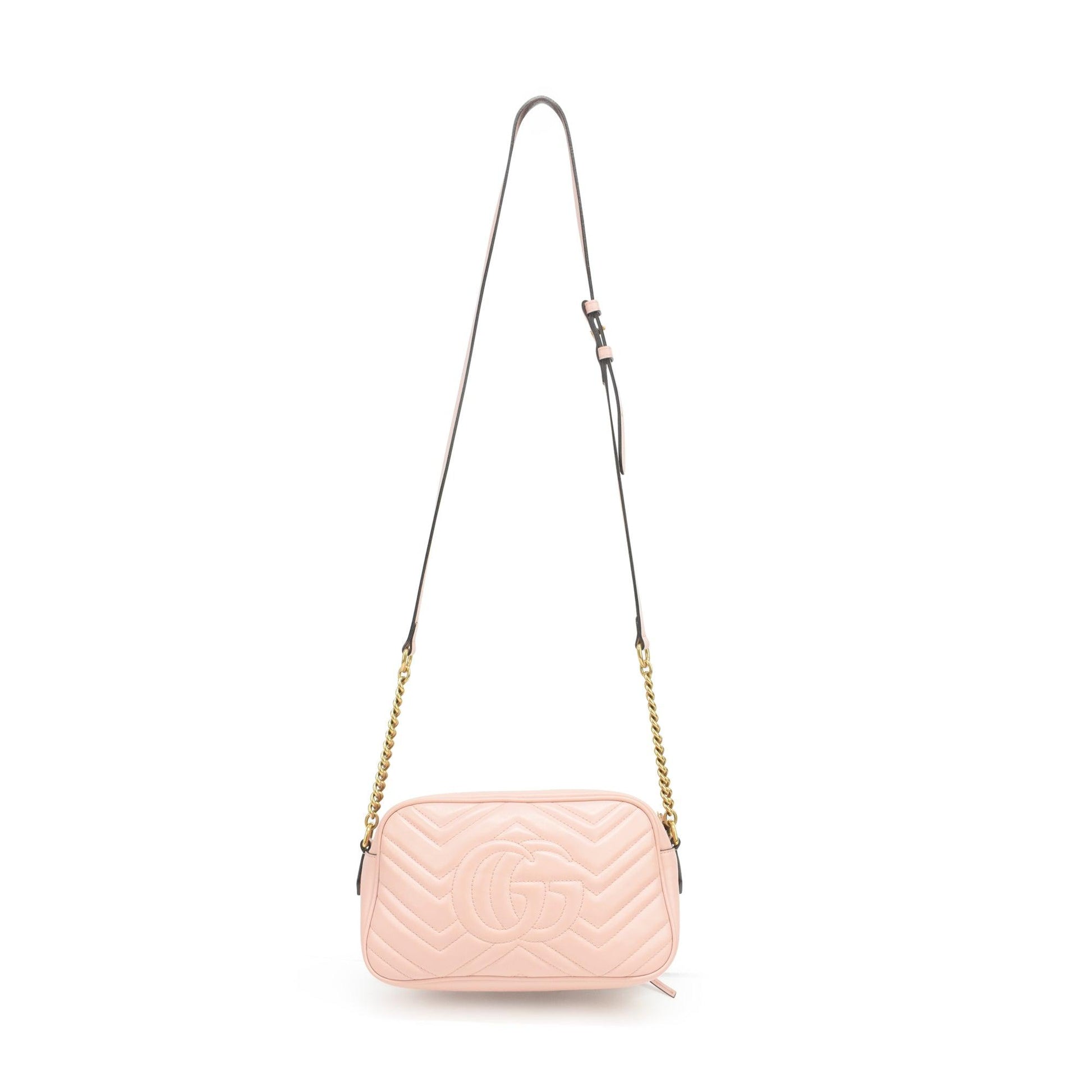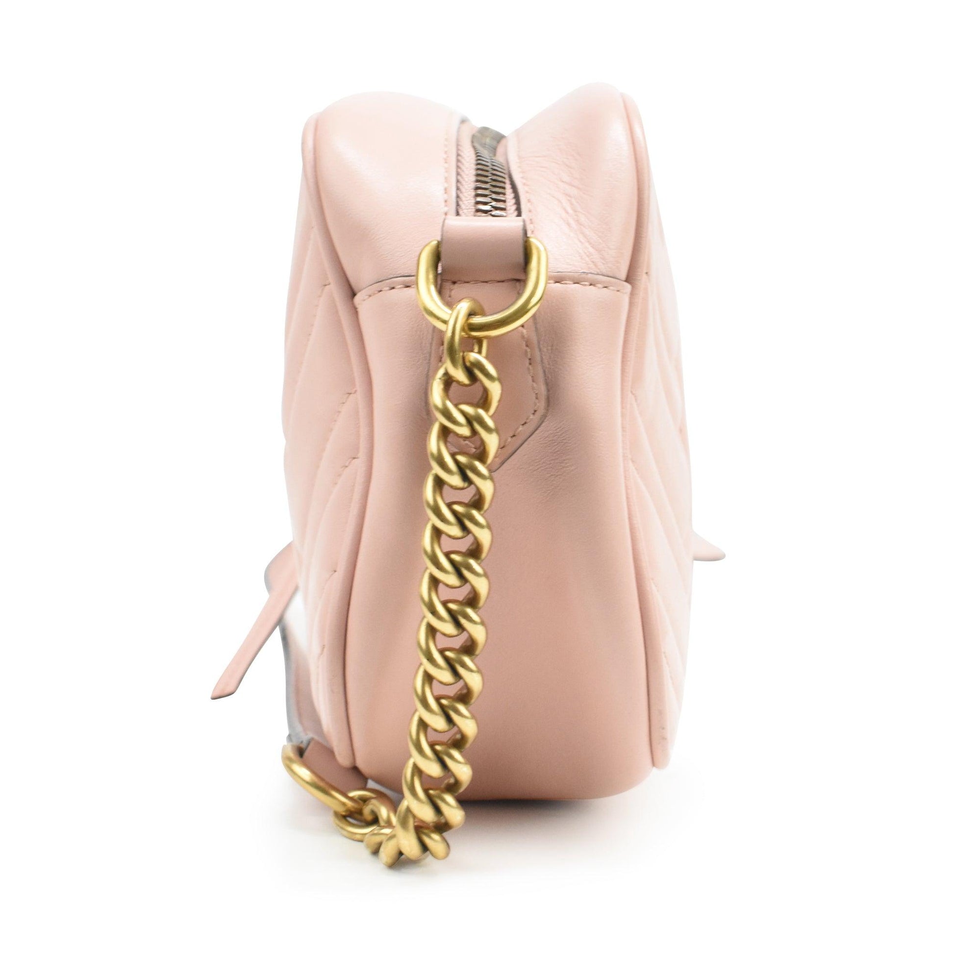Gucci 'Marmont Small' crossbody bag in light pink matelass chevron leather with GG logo plaque in gold hardware on the front and embroidered GG logo on the back. Features a top zip closure, chain shoulder strap and grey suede lining with an inner open pocket.