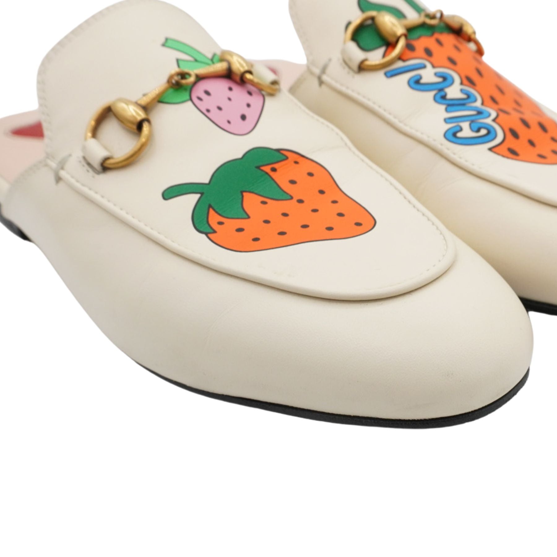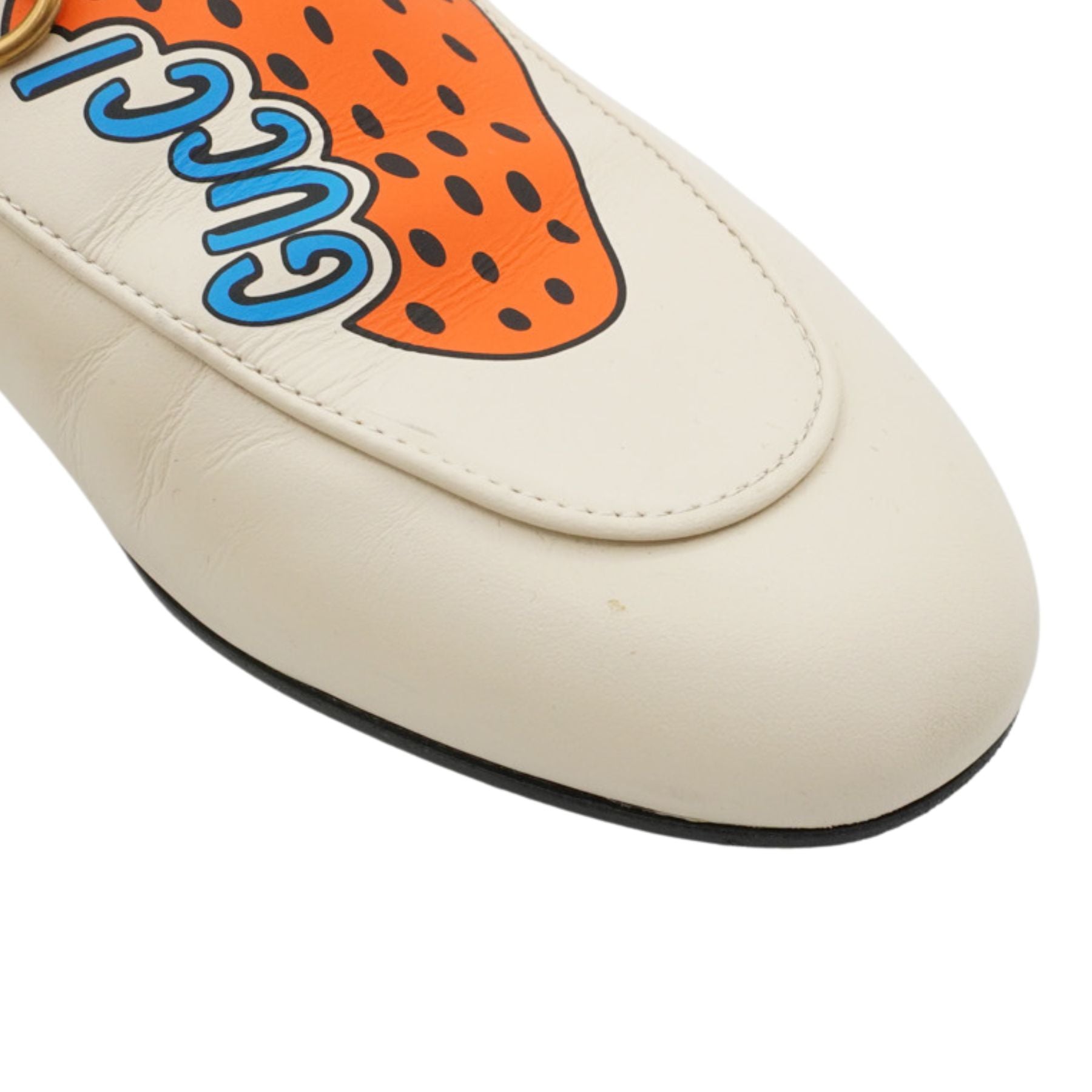 Gucci 'Princetown' slip on loafers in cream leather with strawberry logo graphic and aged gold horsebit hardware.
