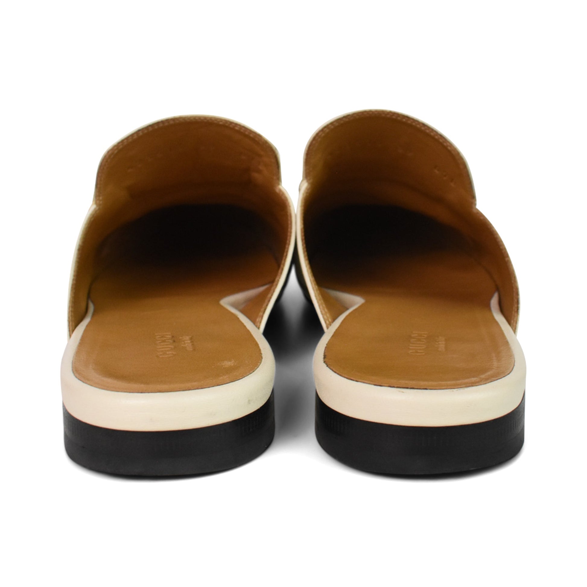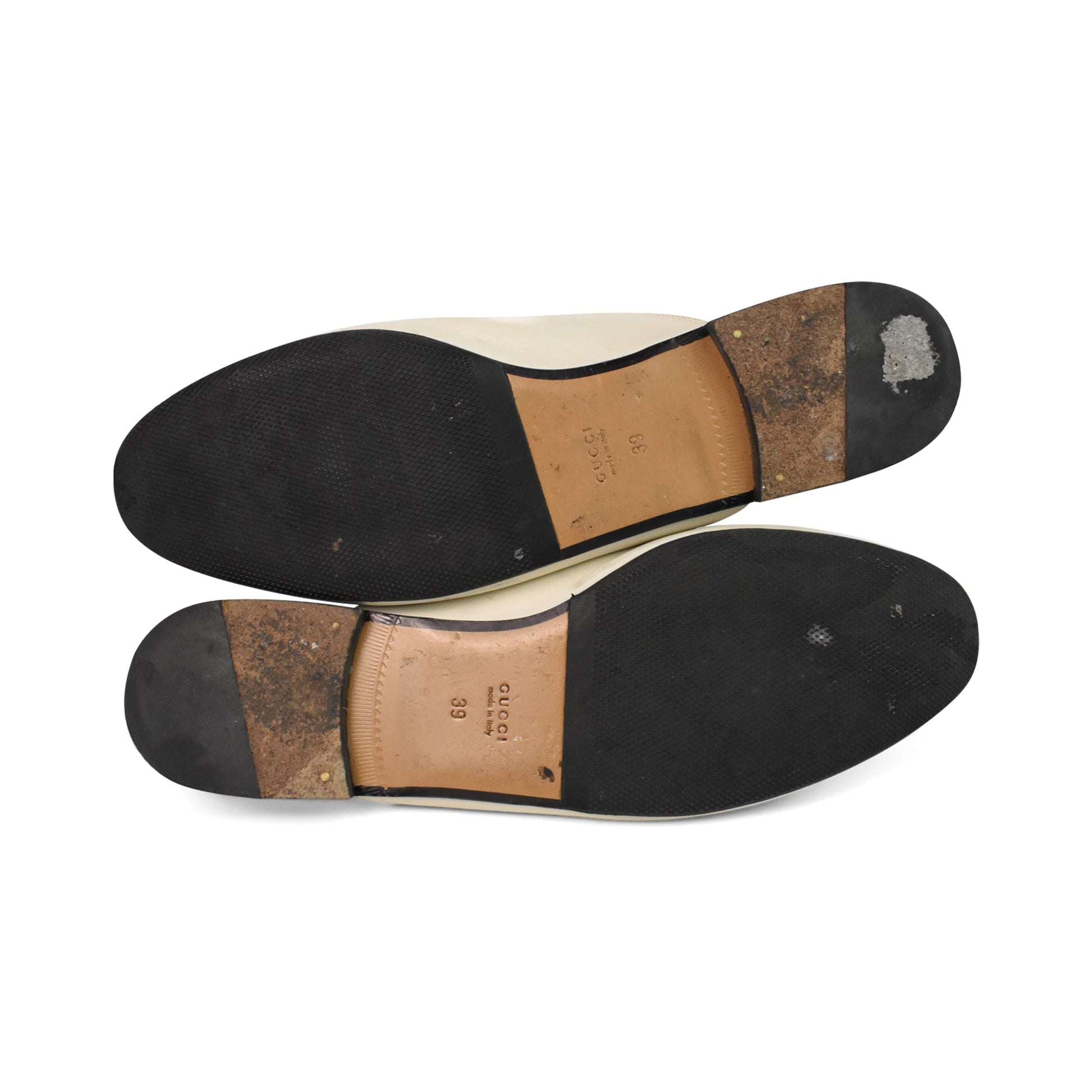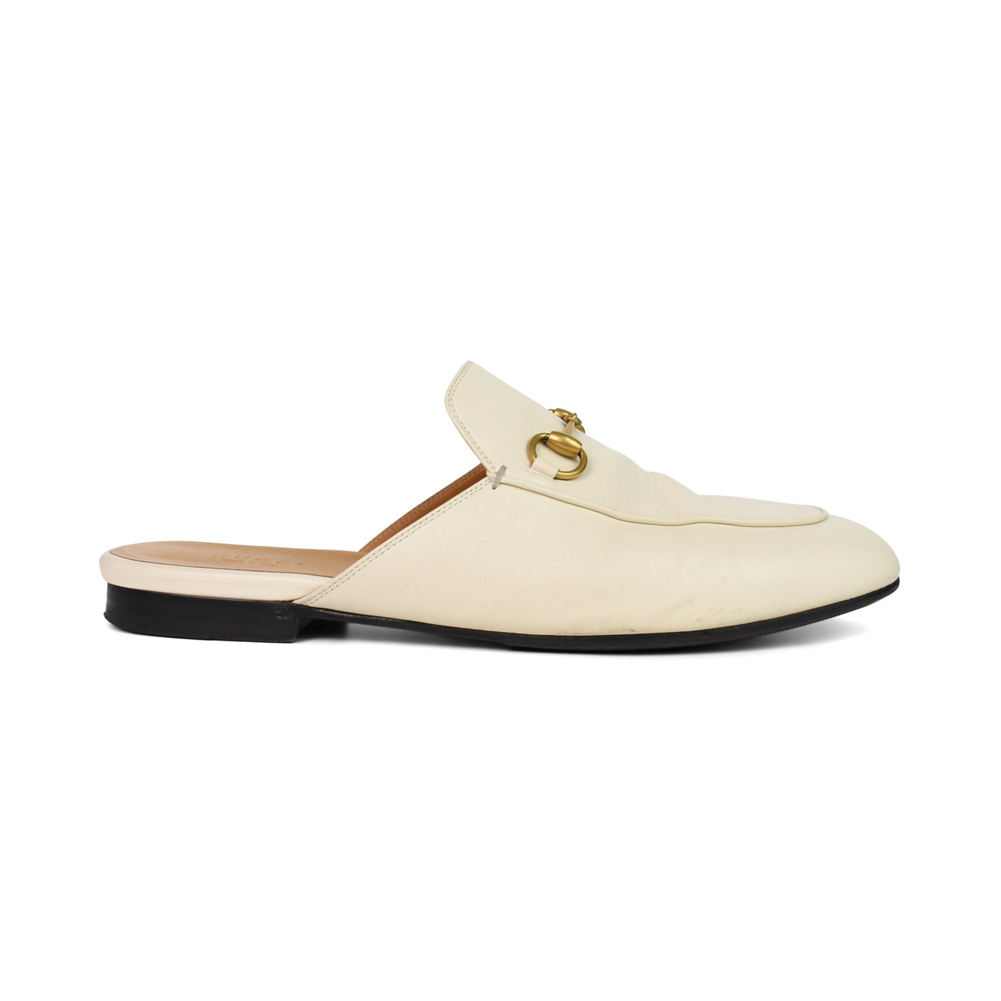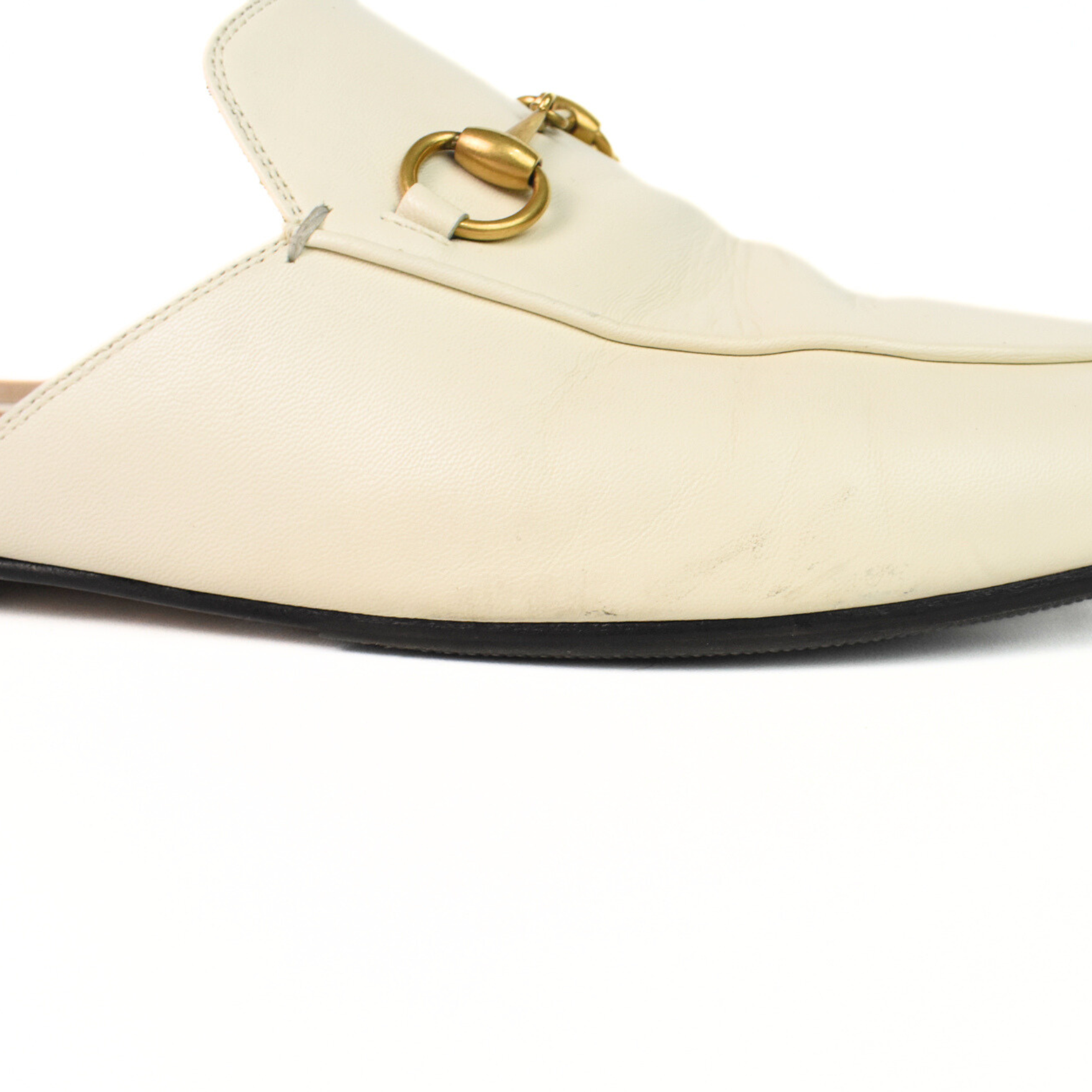 Gucci 'Princetown' mules in white leather with horse-bit detailing in gold hardware, a black sole and a tan leather insole.