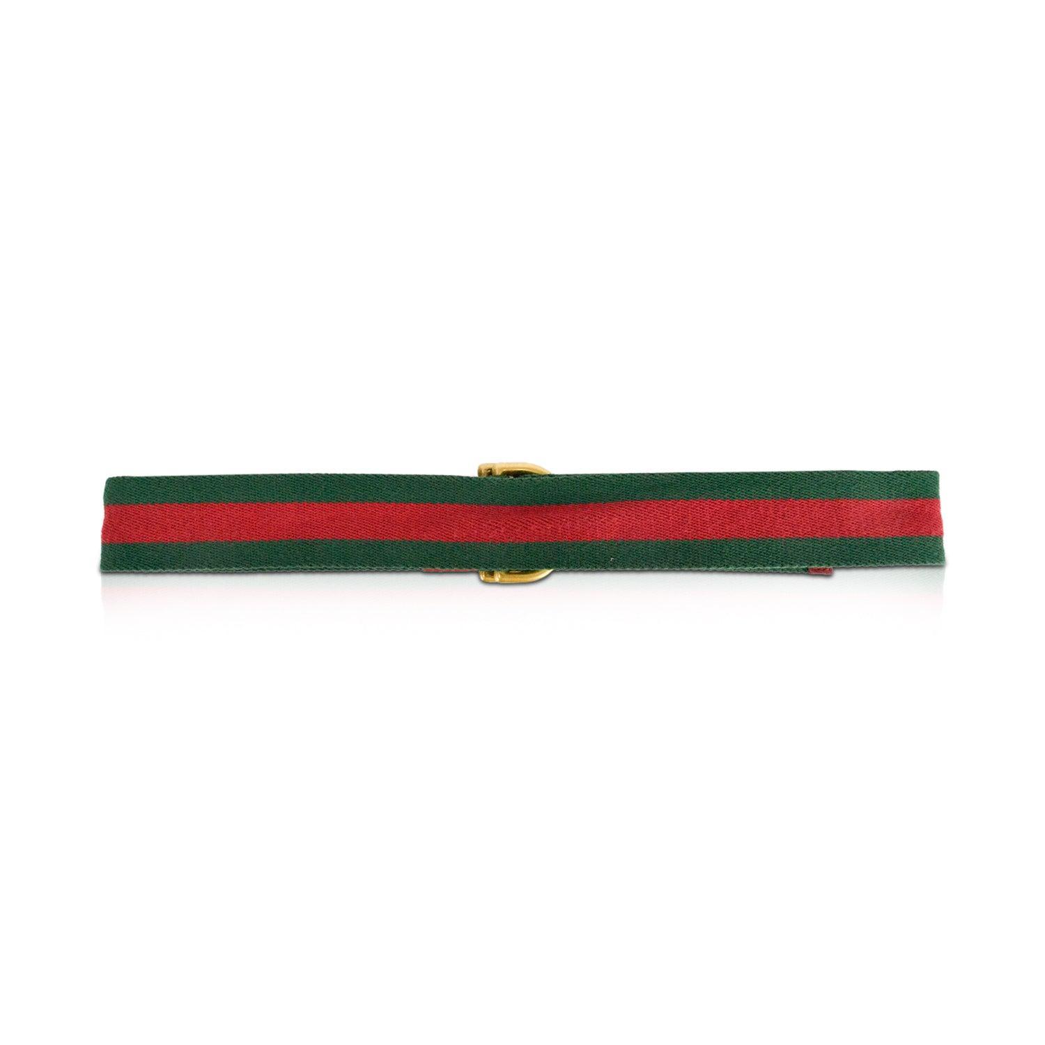 Gucci belt in red and green striped canvas with adjustable buckle in gold hardware and tiger head detail.