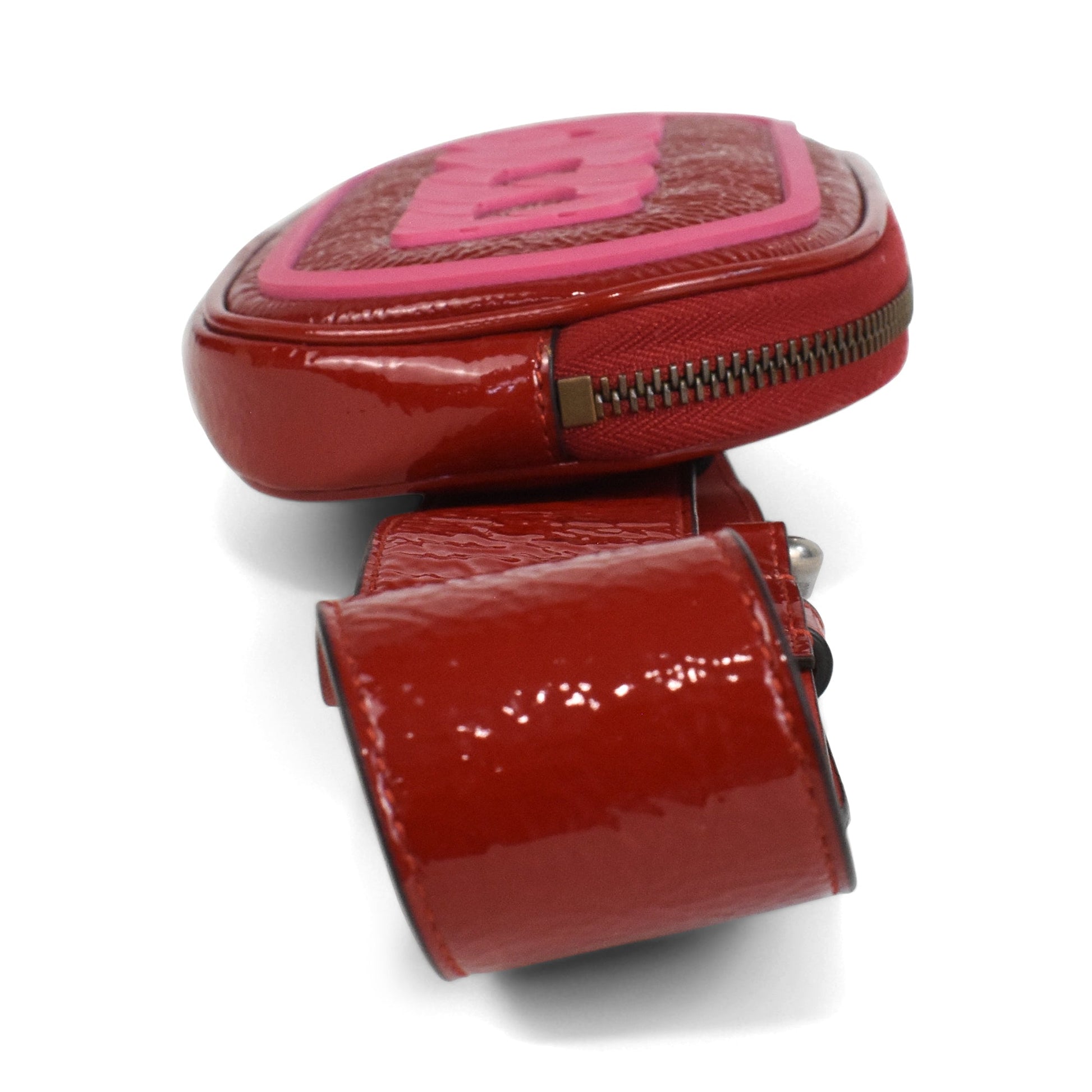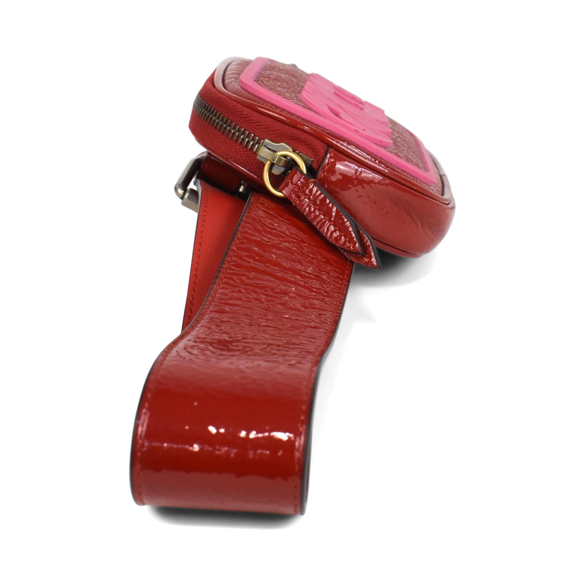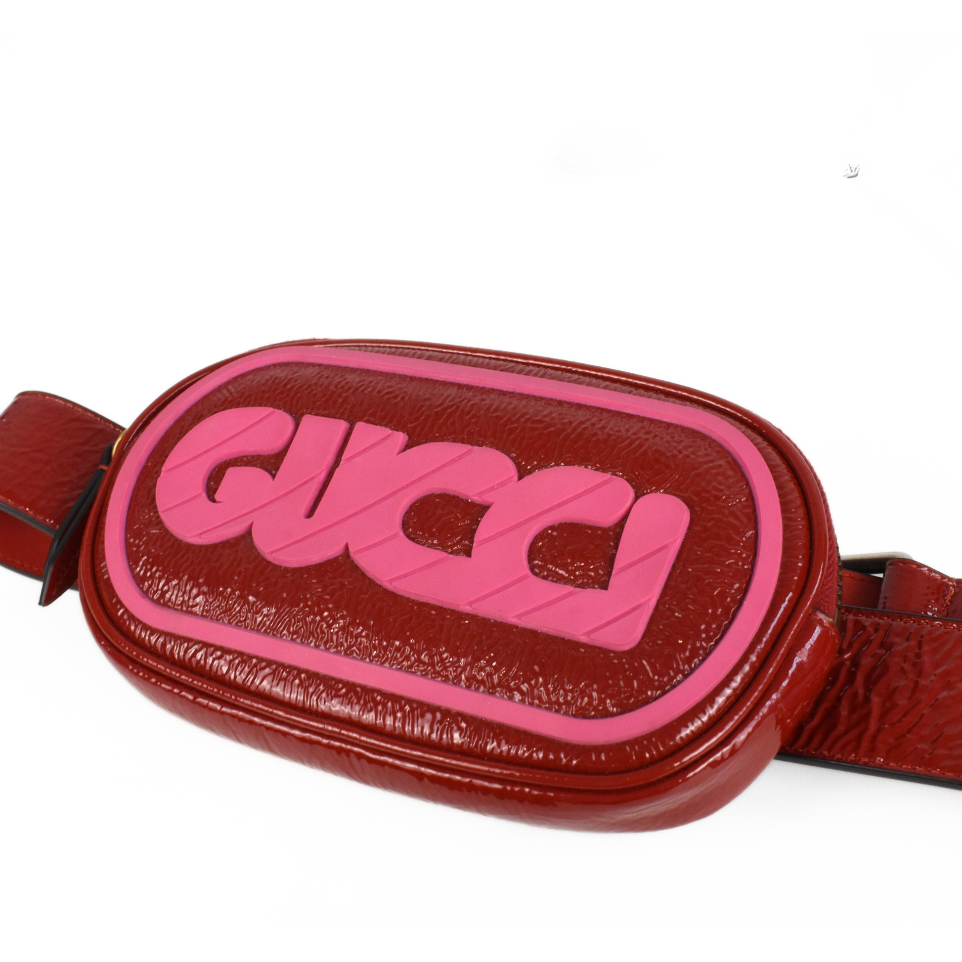 Gucci 'Retro' belt bag in red crinkled patent leather with a pink rubber logo across the front, an adjustable waist strap, and a zip opening in aged gold hardware revealing a floral canvas lined interior with card pockets.