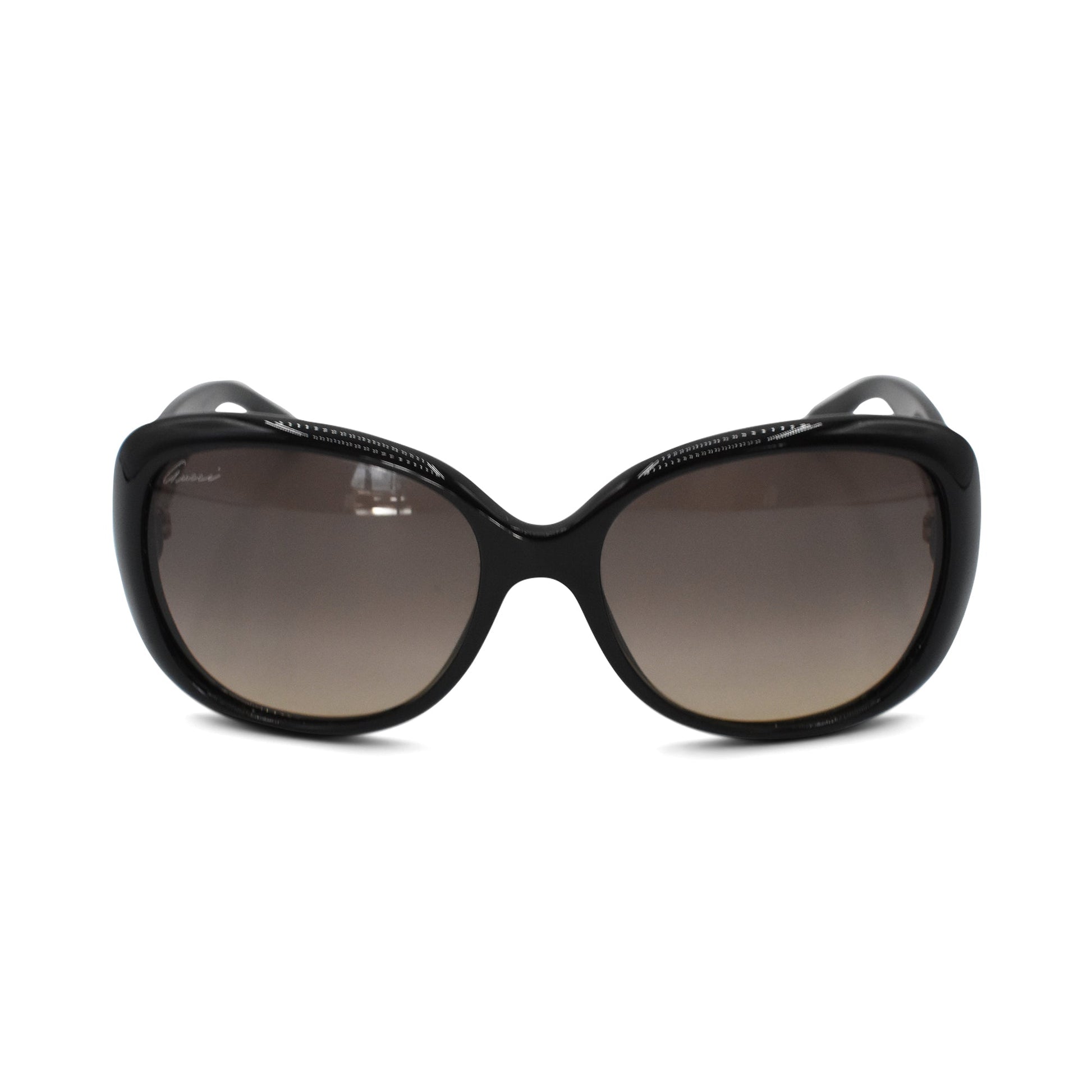 Gucci 'Web' sunglasses with black acetate frames with dark brown lenses. Features canvas red and green racing stripes on the arms, gold hardware 'GG' logos on the arms, and engraved logo on a lens.
