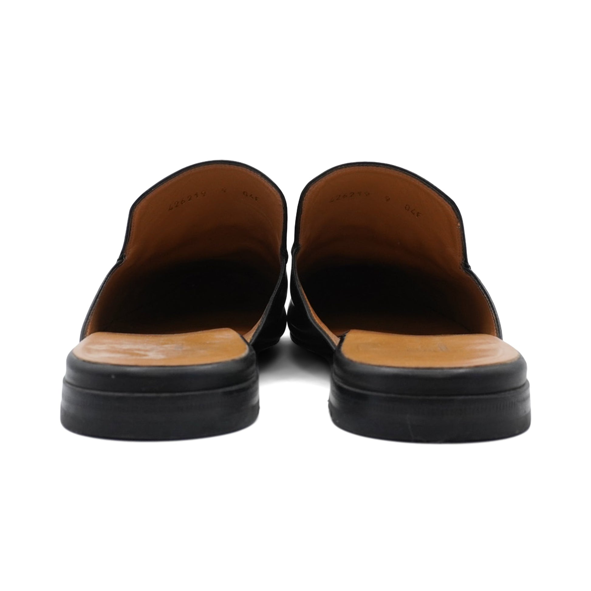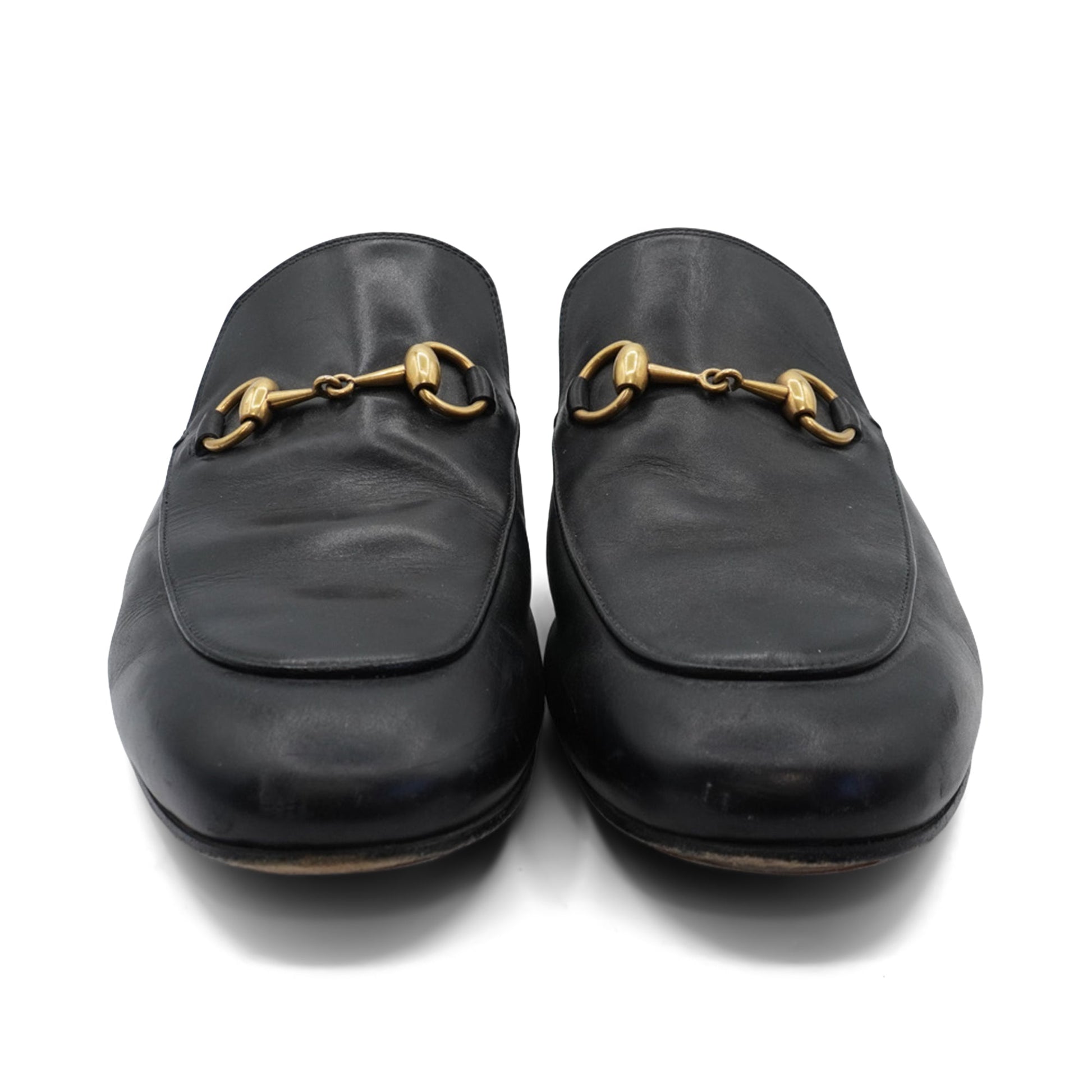 Gucci 'Princeton' slip-on loafer mules in black leather with a round toe and brushed gold horsebit hardware.