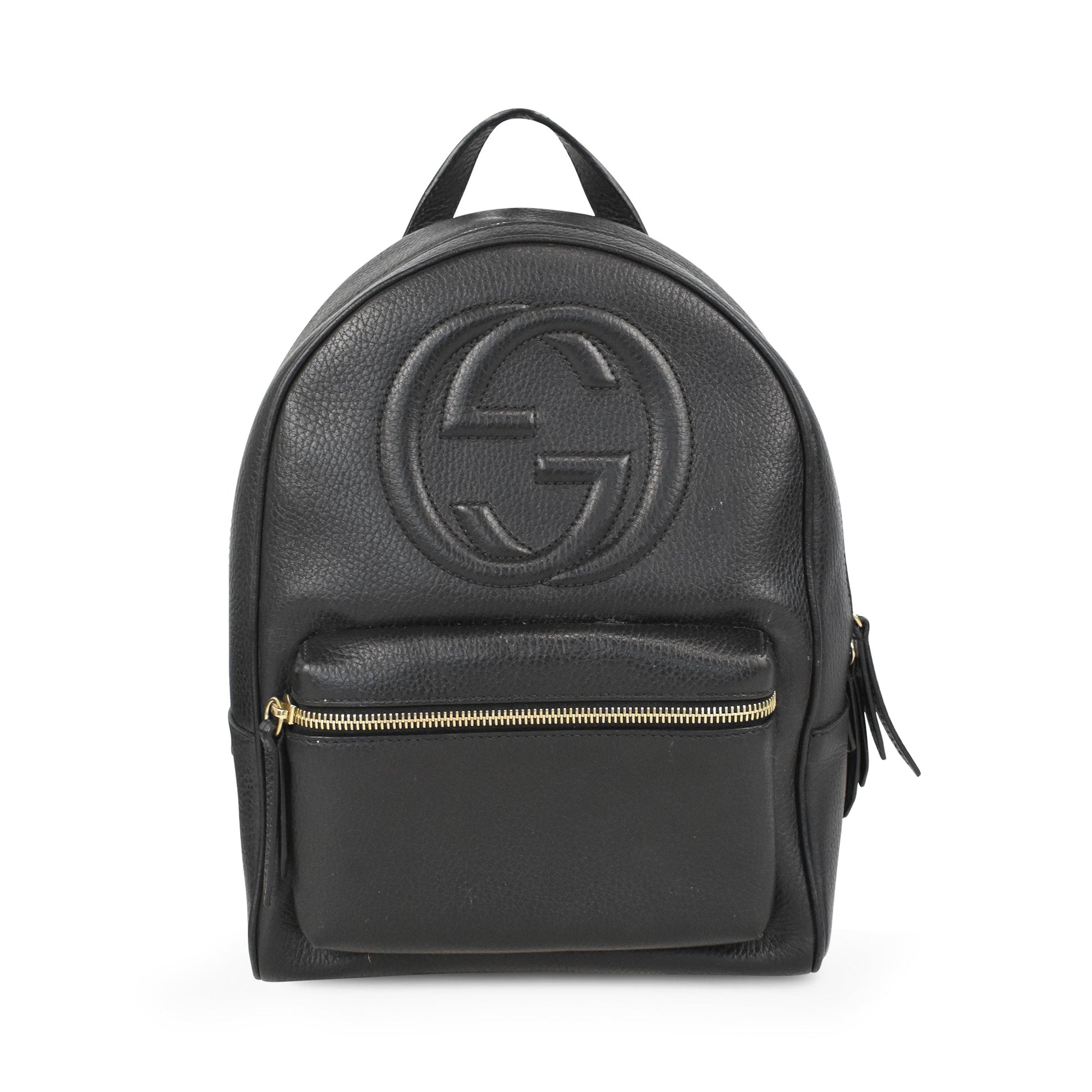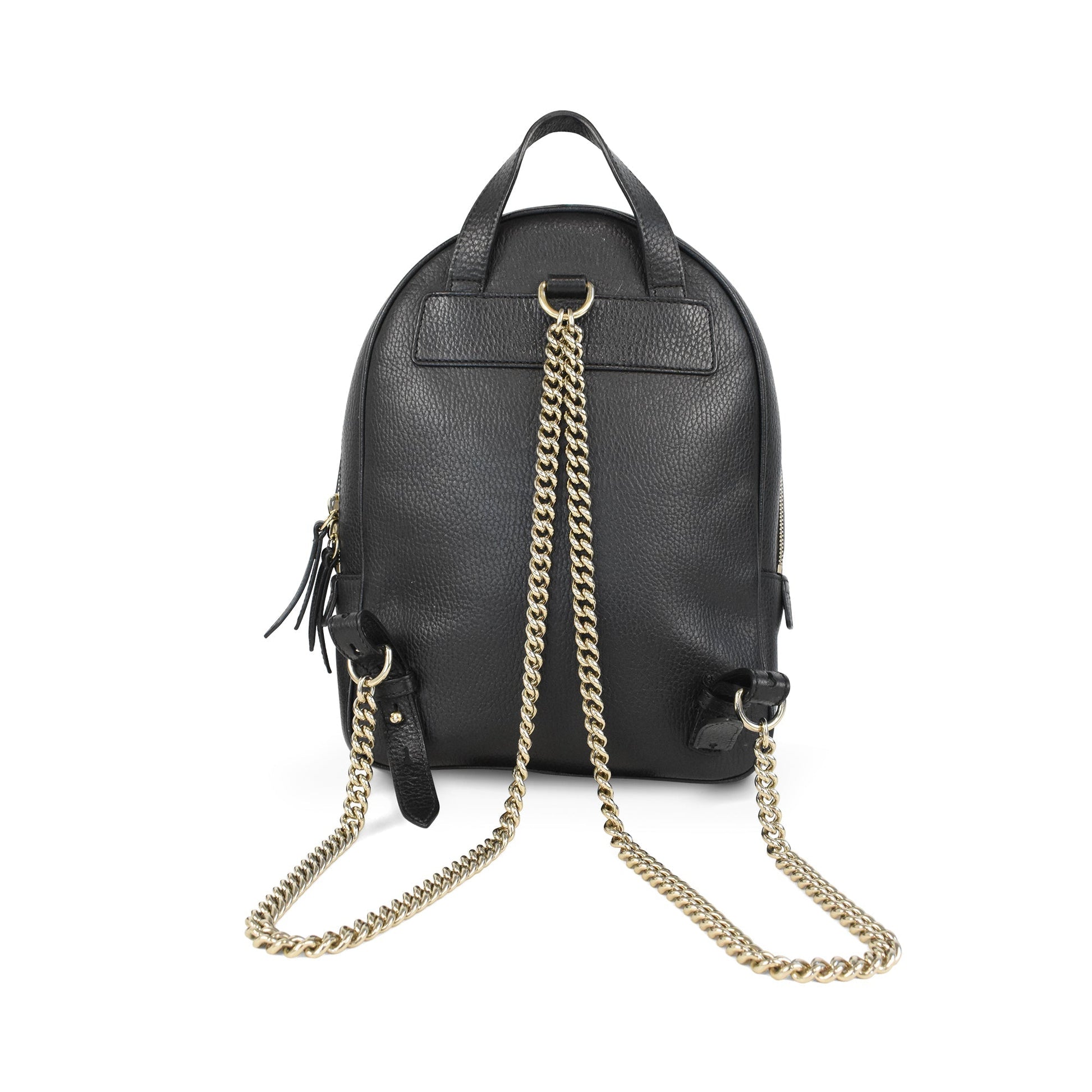 Gucci 'Soho' backpack in black grained leather with embossed interlocking GG logo and soft gold hardware. Features a front zip pocket and larger main pocket with two-way zipper closure. The bag has adjustable gold chain back straps and a leather handle. The interior is lined with beige canvas and has additional slip pockets.