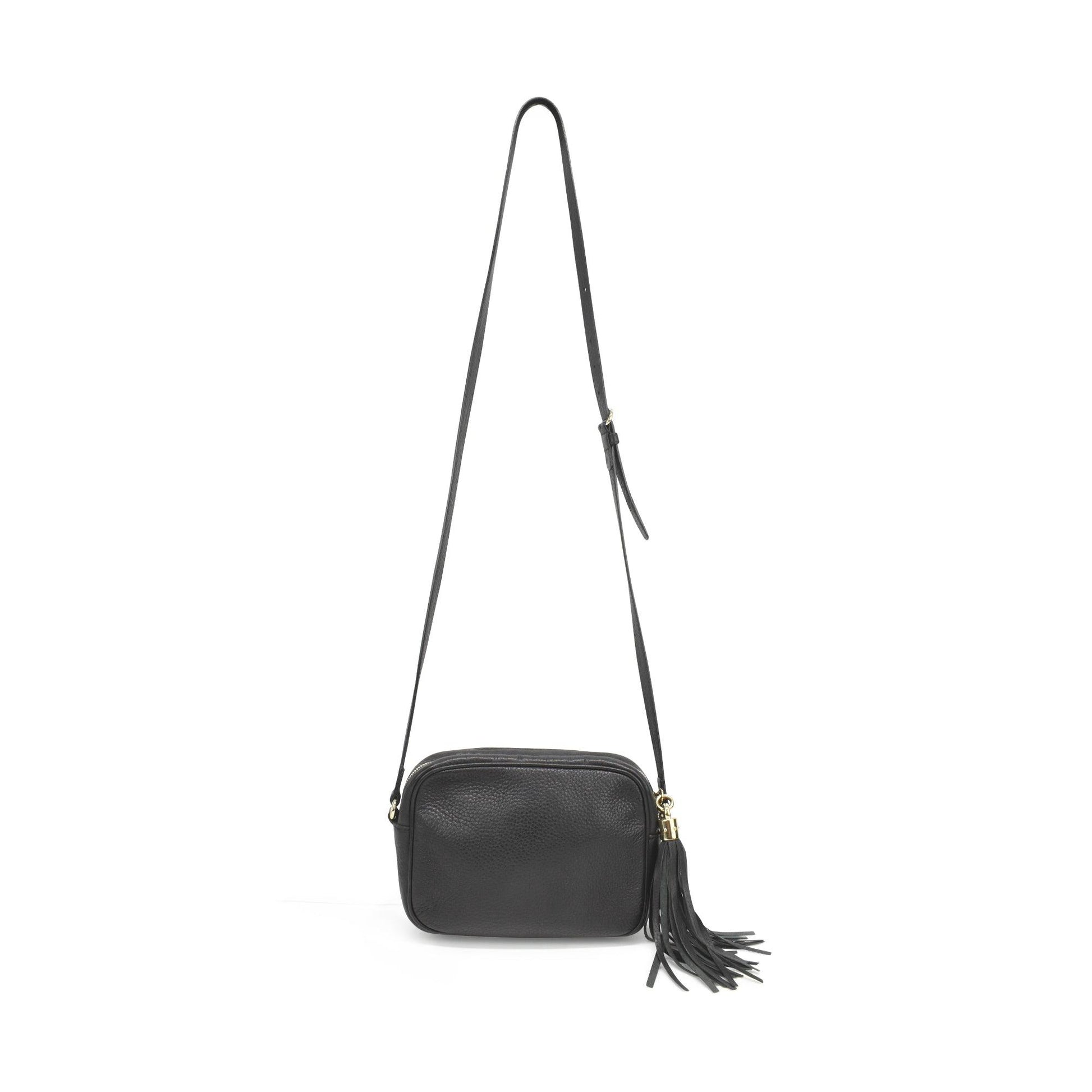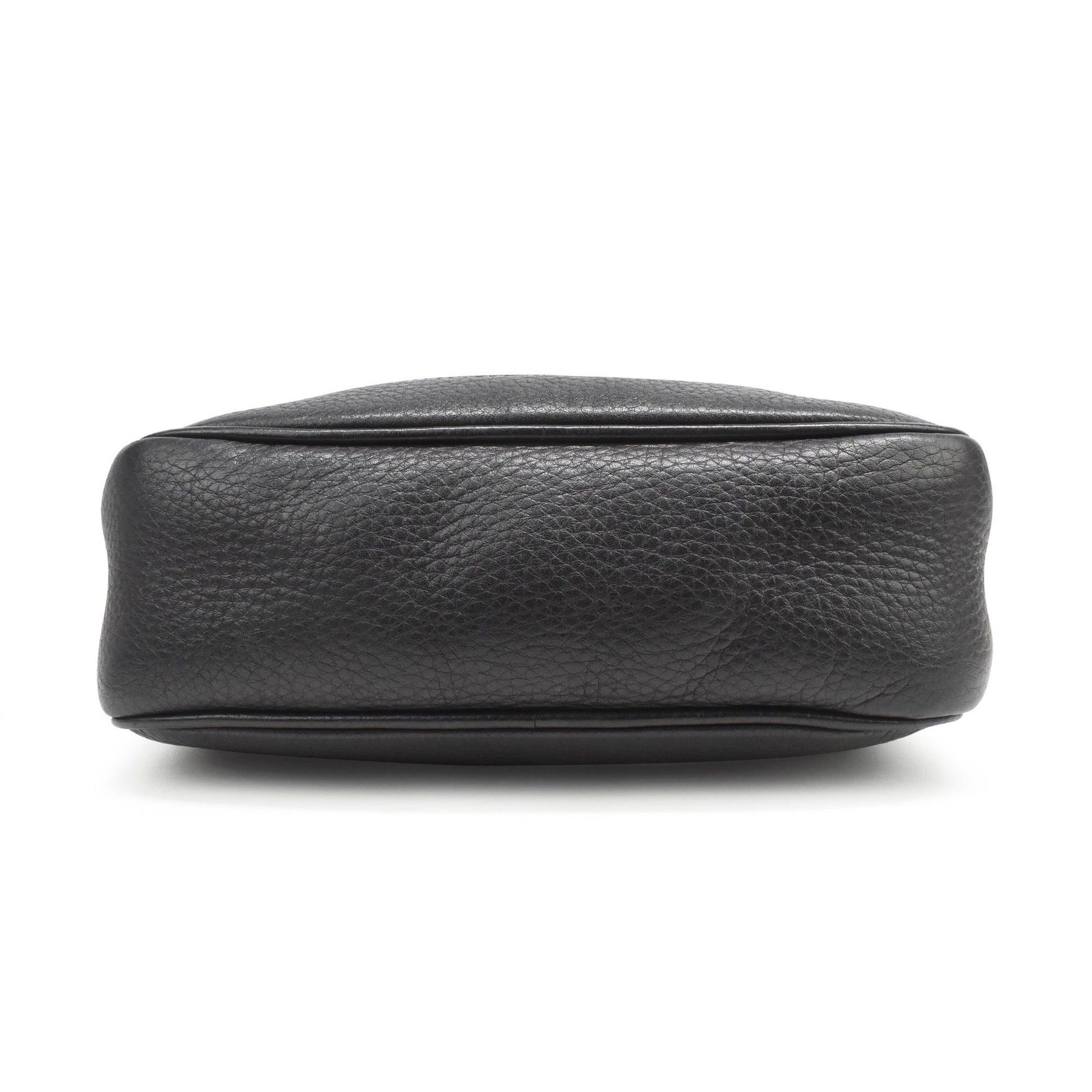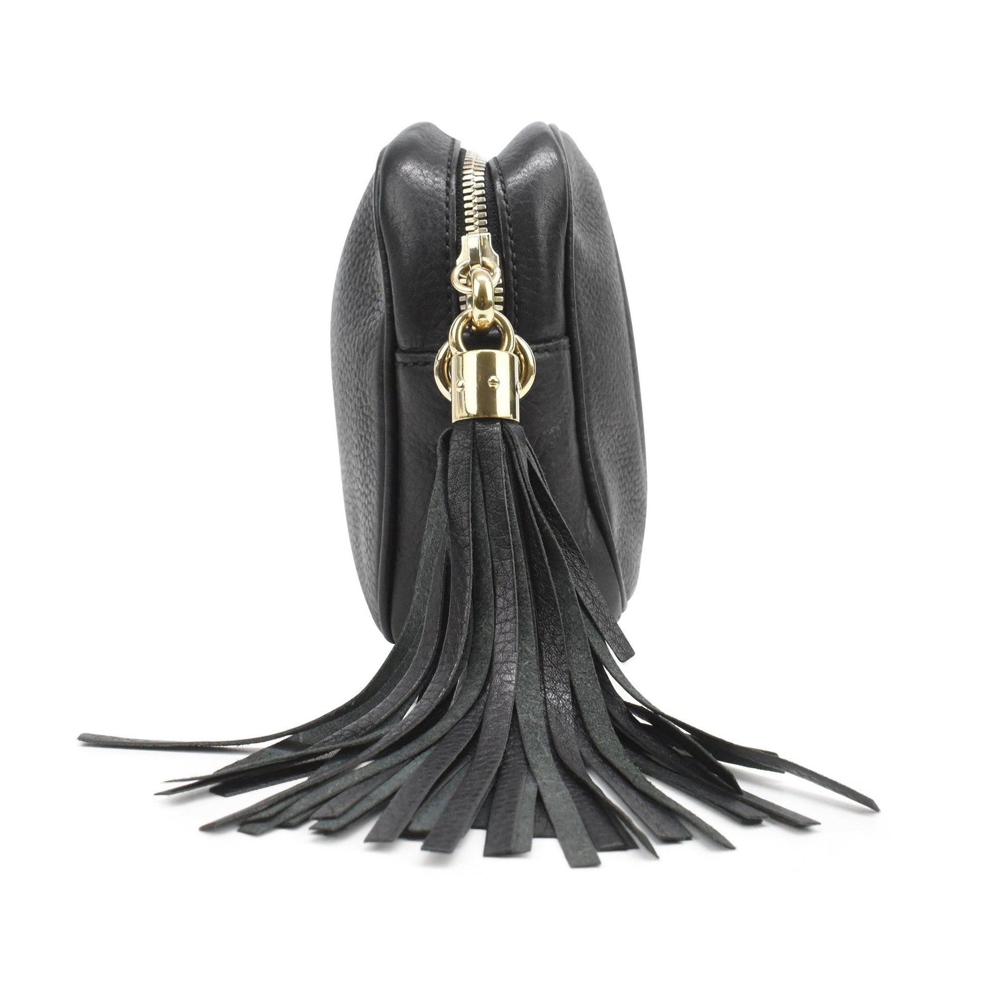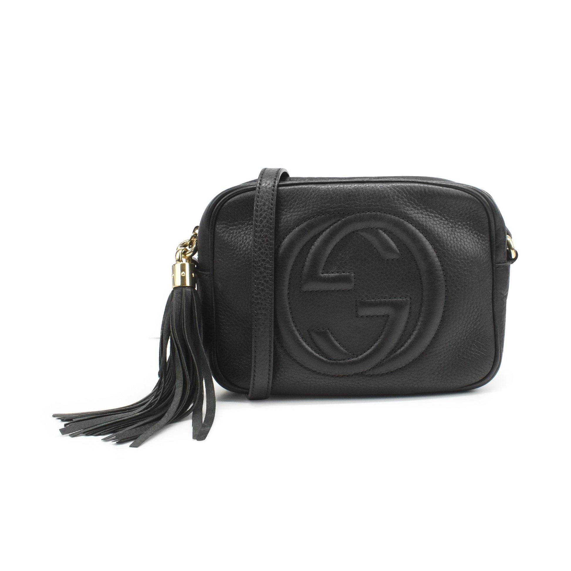 Gucci 'Soho' camera bag in black pebbled leather with soft gold hardware. Features a large GG logo on the front, an adjustable leather long strap, a top zip closure, and large tassel zipper pull. The interior is canvas lined and has a slip pocket.