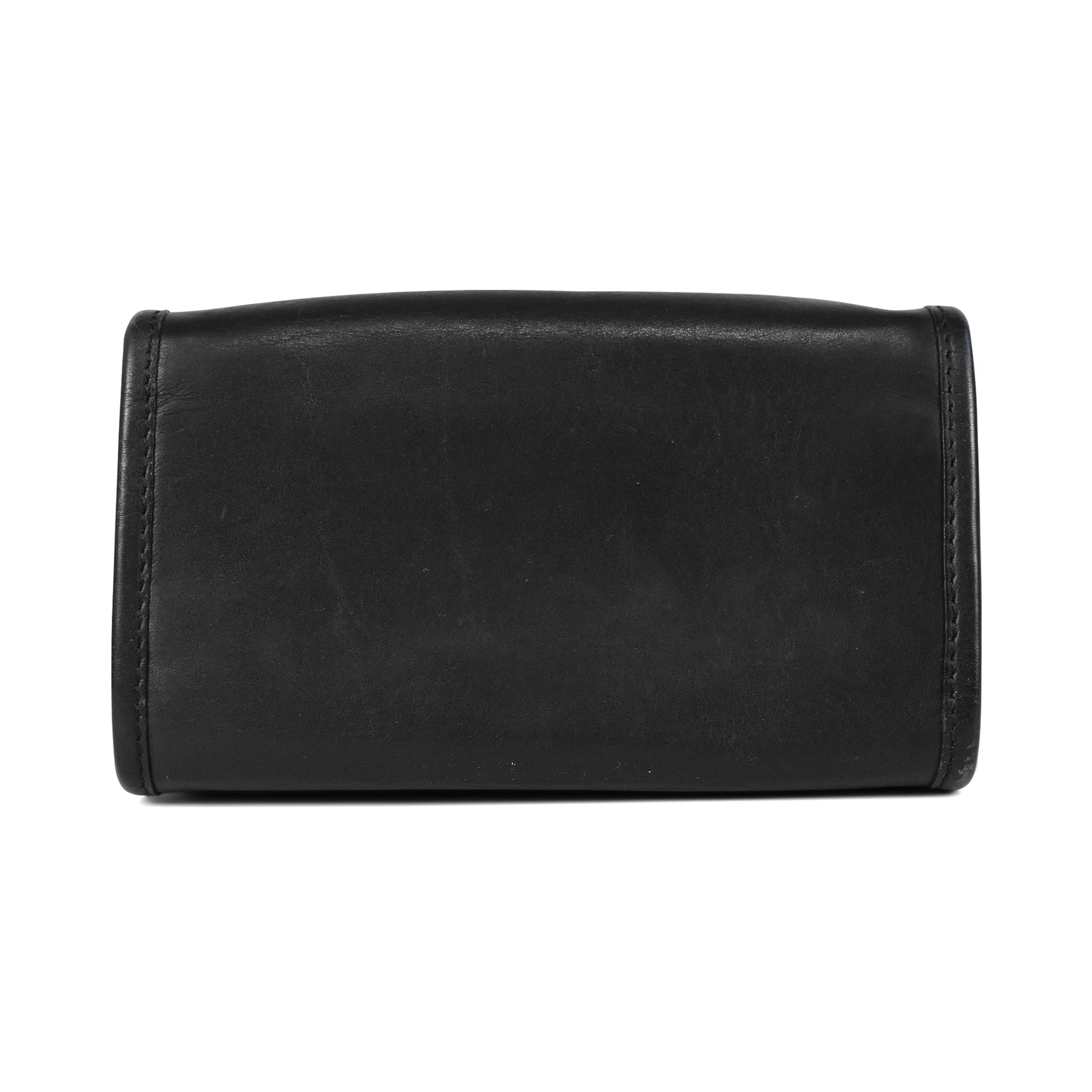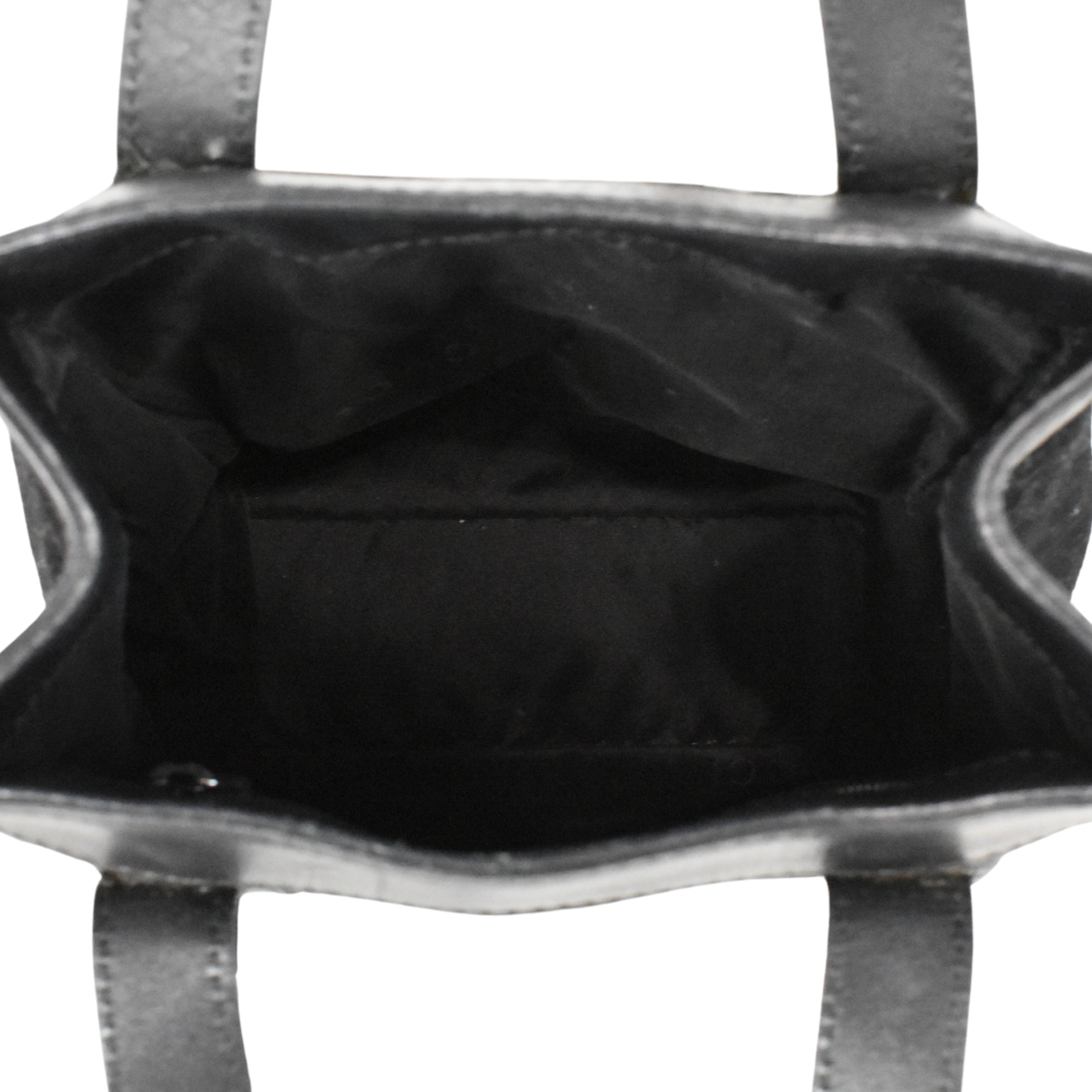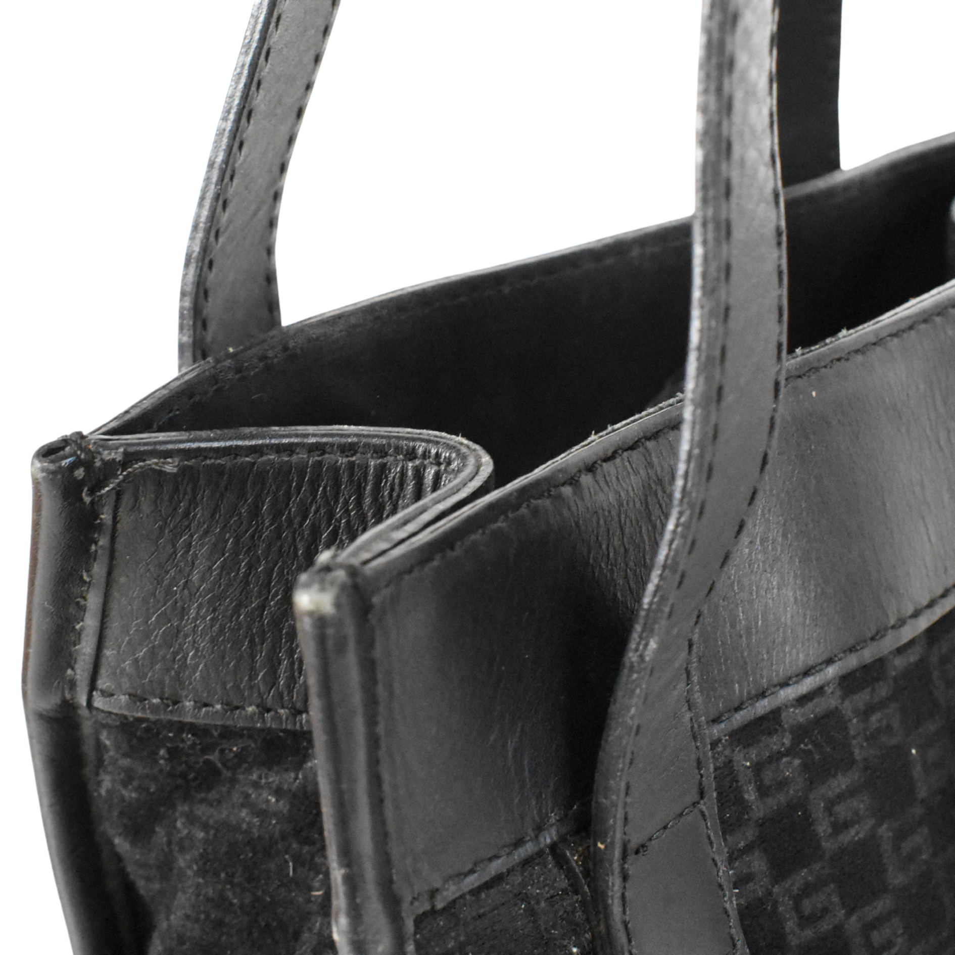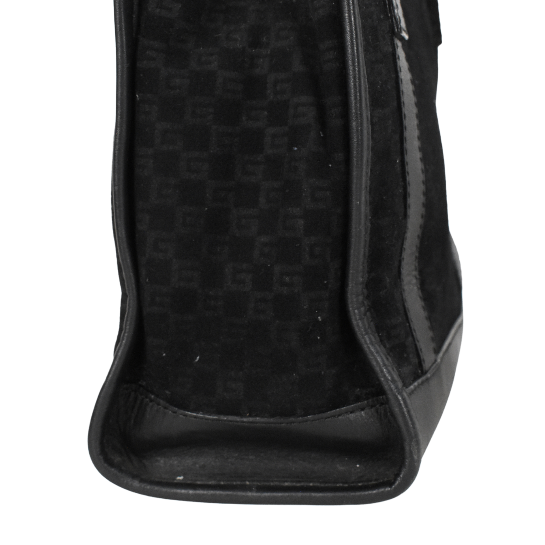 Gucci mini tote back in black felted wool embossed with a cubic G monogram. Features black leather accents and a fabric lining with interior zip pocket.