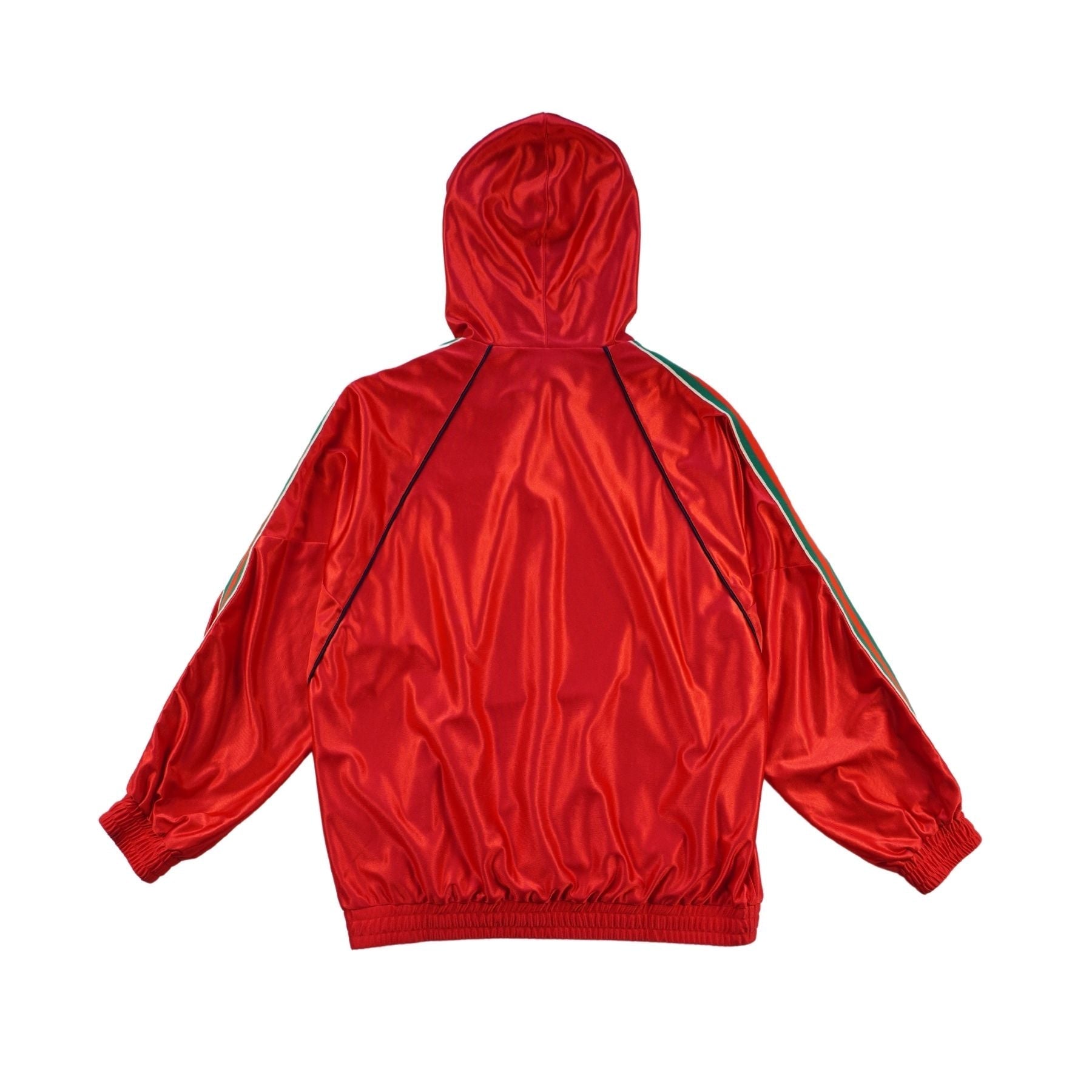 Gucci 'Track' hoodie in red shiny polyester with navy trim, a red, green and cream racing stripe down the sleeves, a drawstring hood, and a small vintage logo patch on the chest. From the spring-summer 2021 collection.