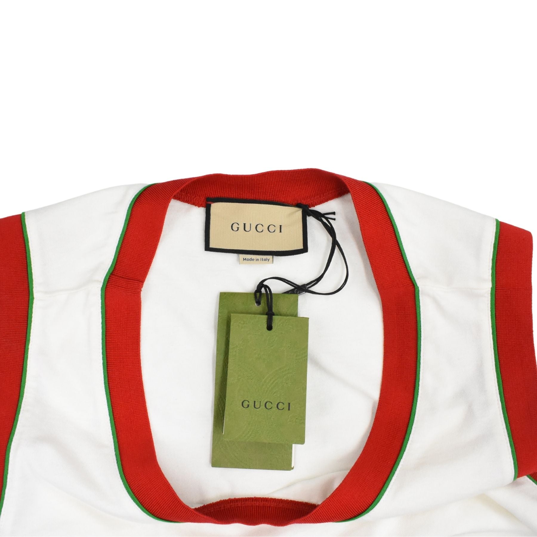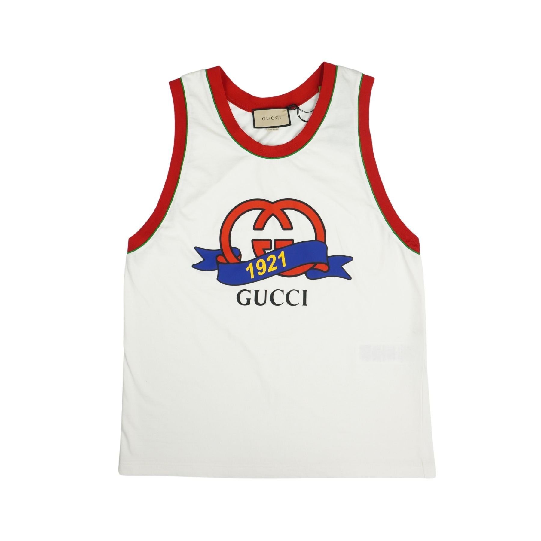 Gucci 'Sunlight' tank top in white cotton with a red and green trim and a large 'GG 1921' logo graphic on the chest.