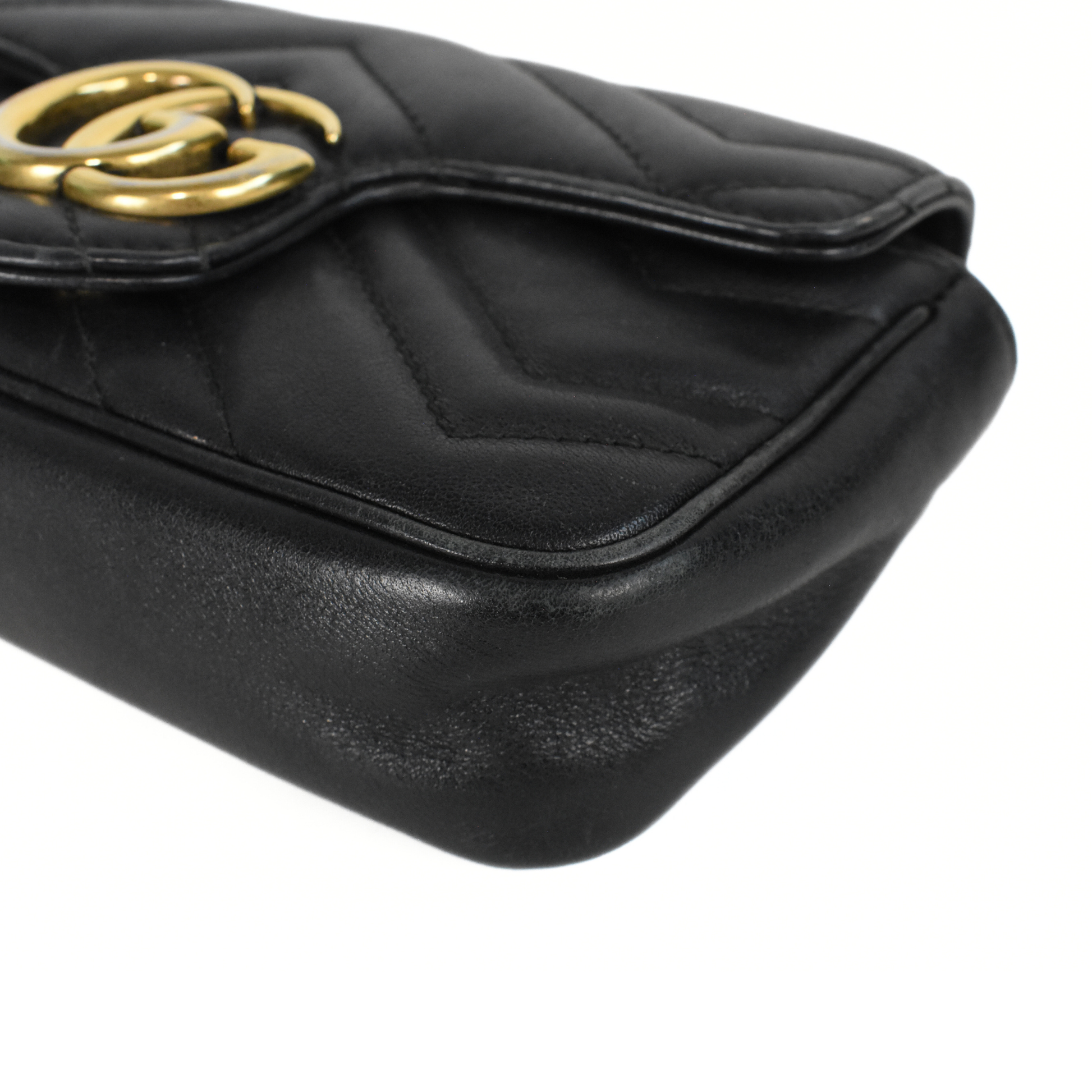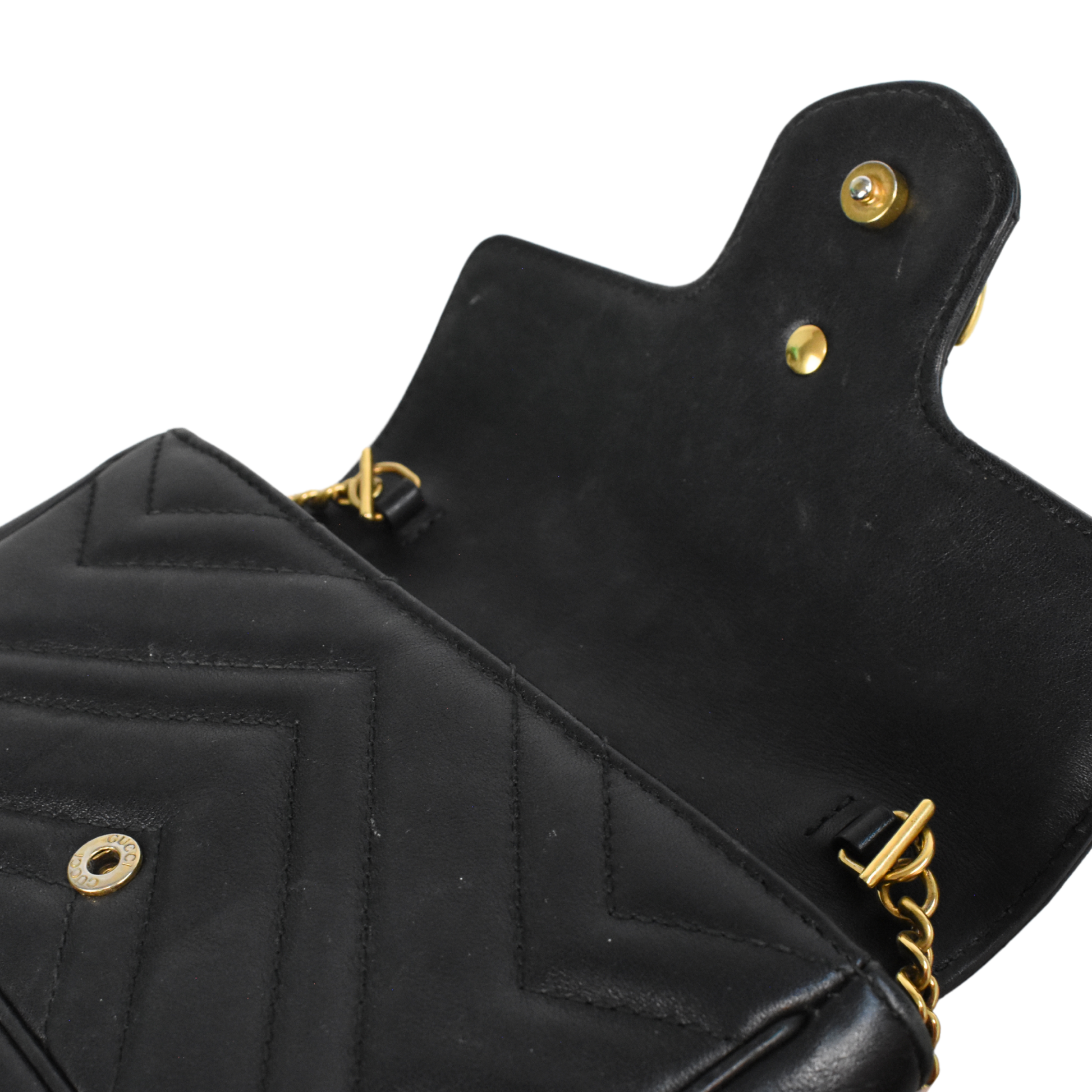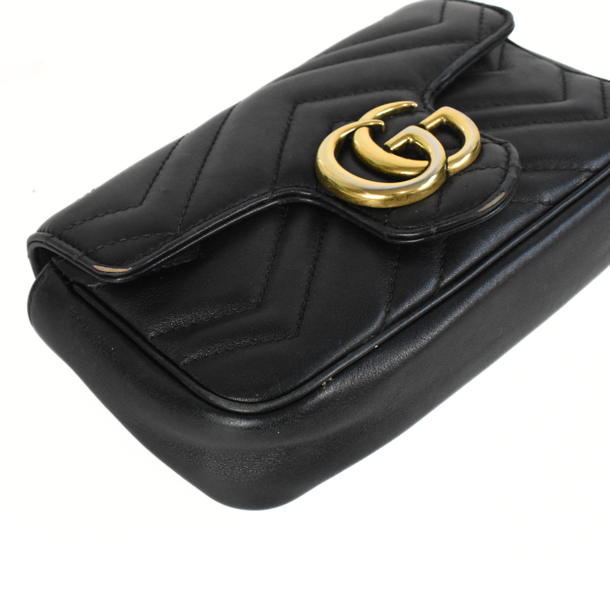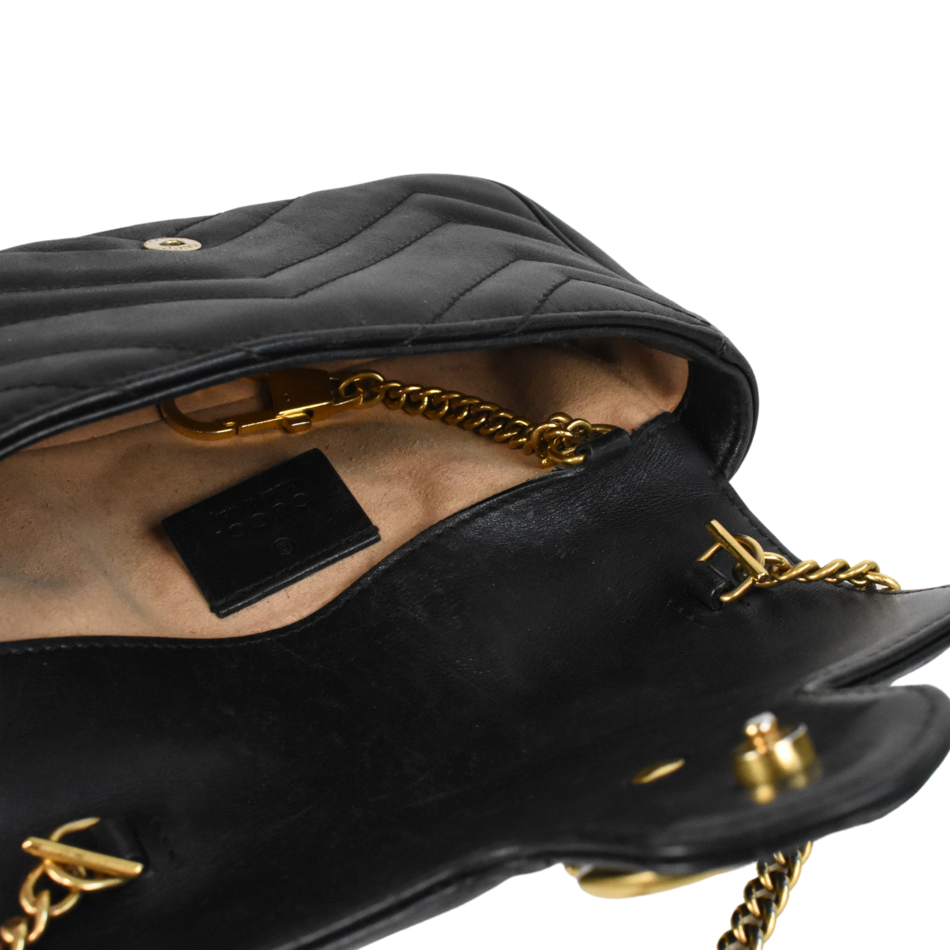Gucci 'Super Mini Marmont' crossbody bag in chevron quilted black leather with aged gold GG hardware. Features a snap button closure and pink microsuede lining with interior lobster claw clip on a short chain. The bag's chain strap can be removed allowing it to be carried as a clutch.