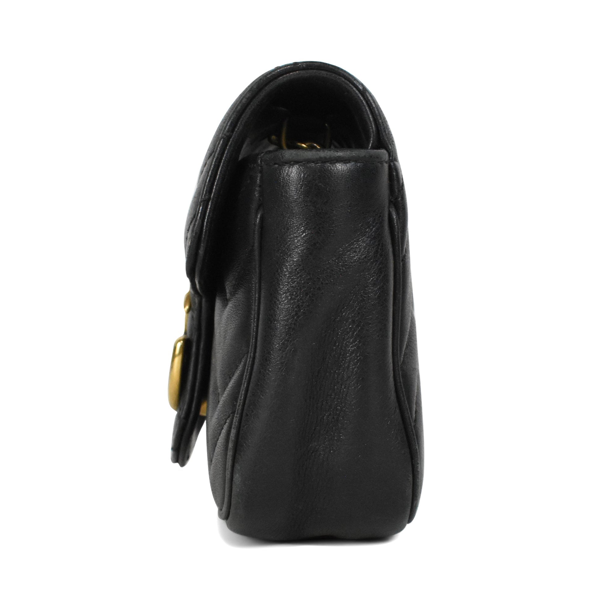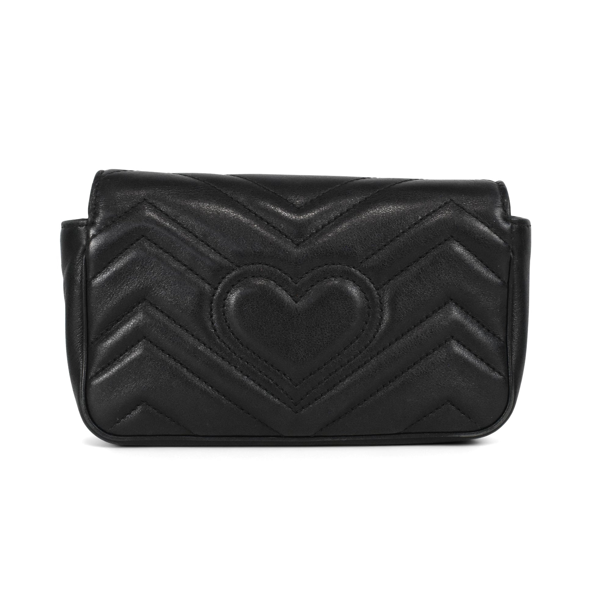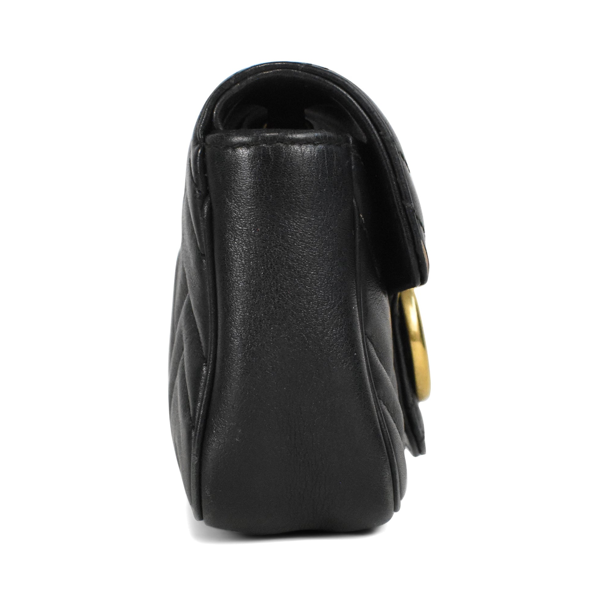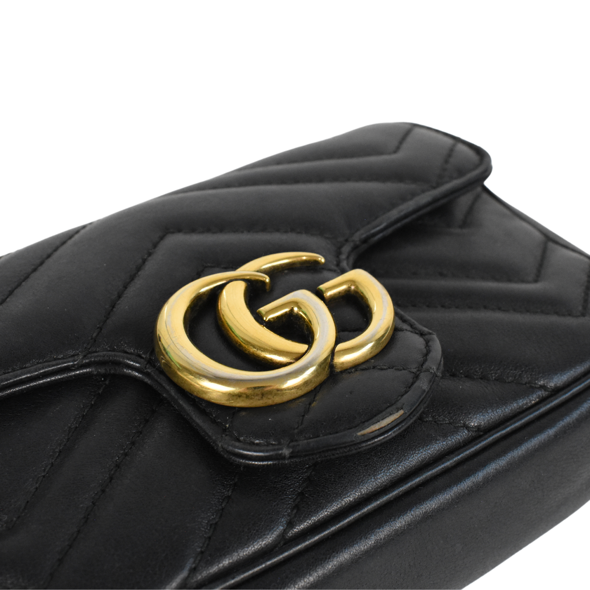 Gucci 'Super Mini Marmont' crossbody bag in chevron quilted black leather with aged gold GG hardware. Features a snap button closure and pink microsuede lining with interior lobster claw clip on a short chain. The bag's chain strap can be removed allowing it to be carried as a clutch.