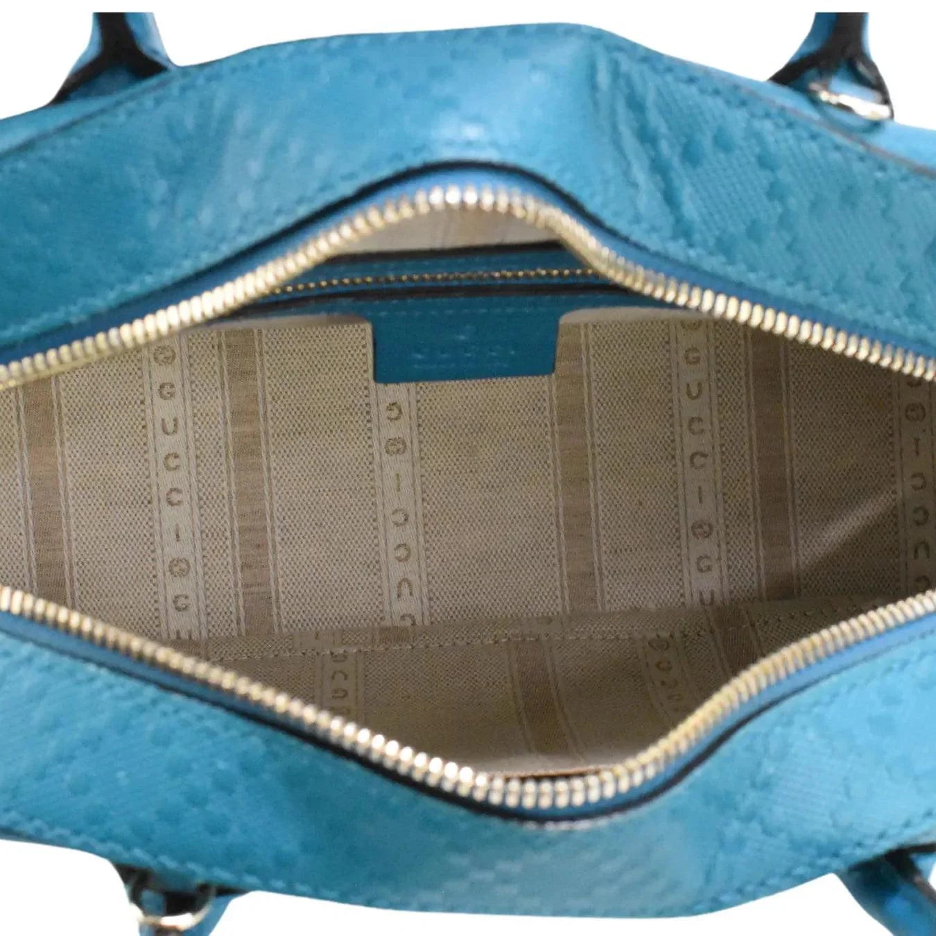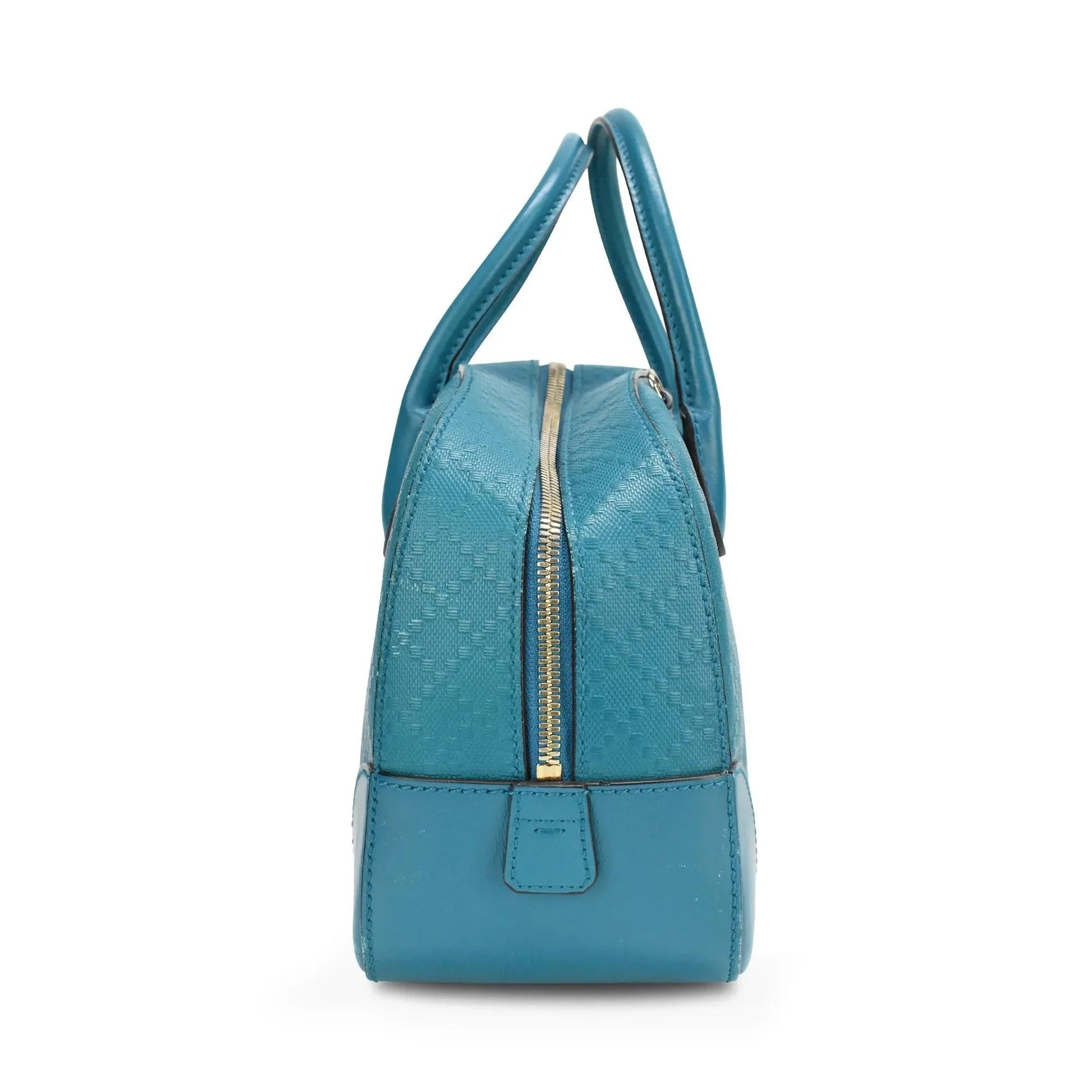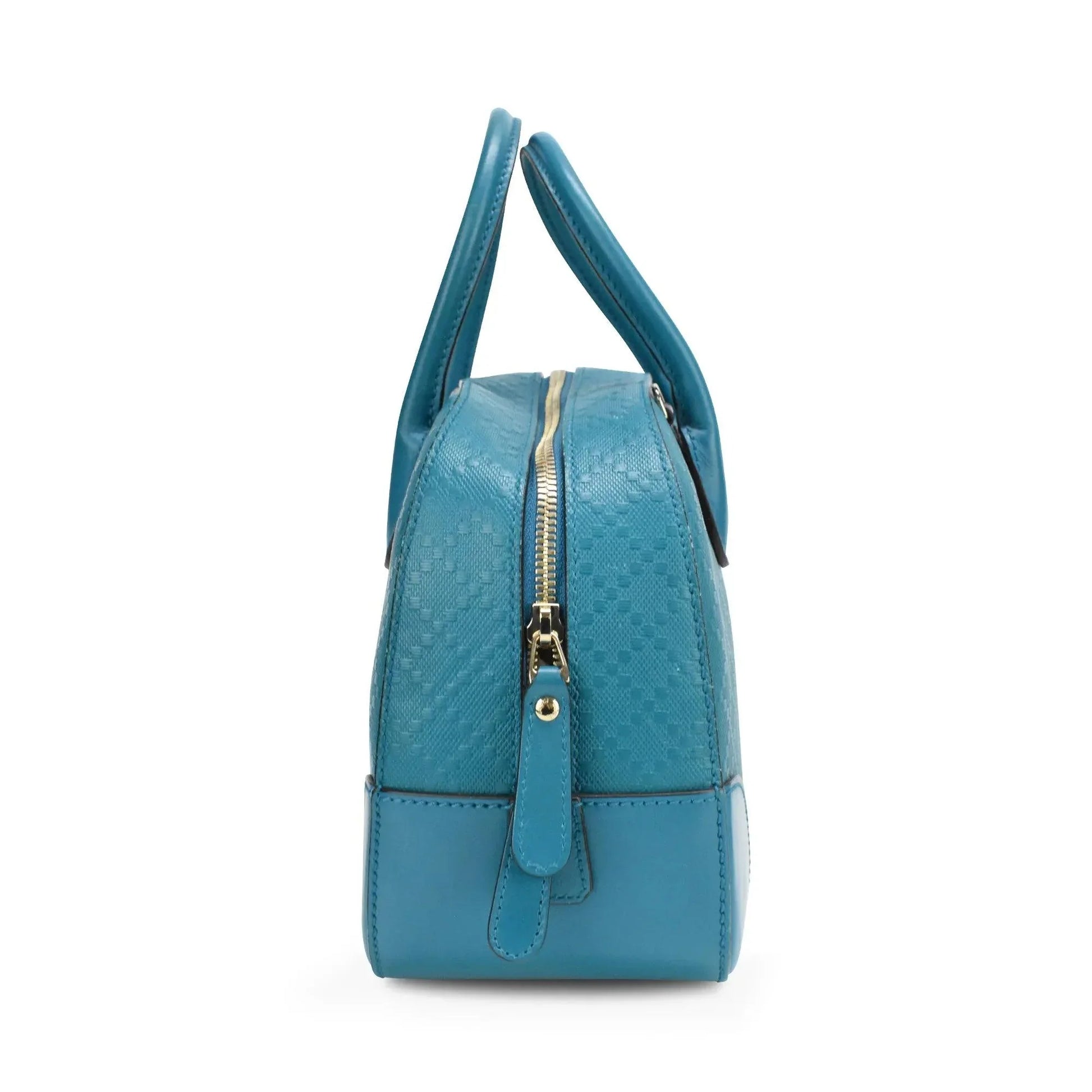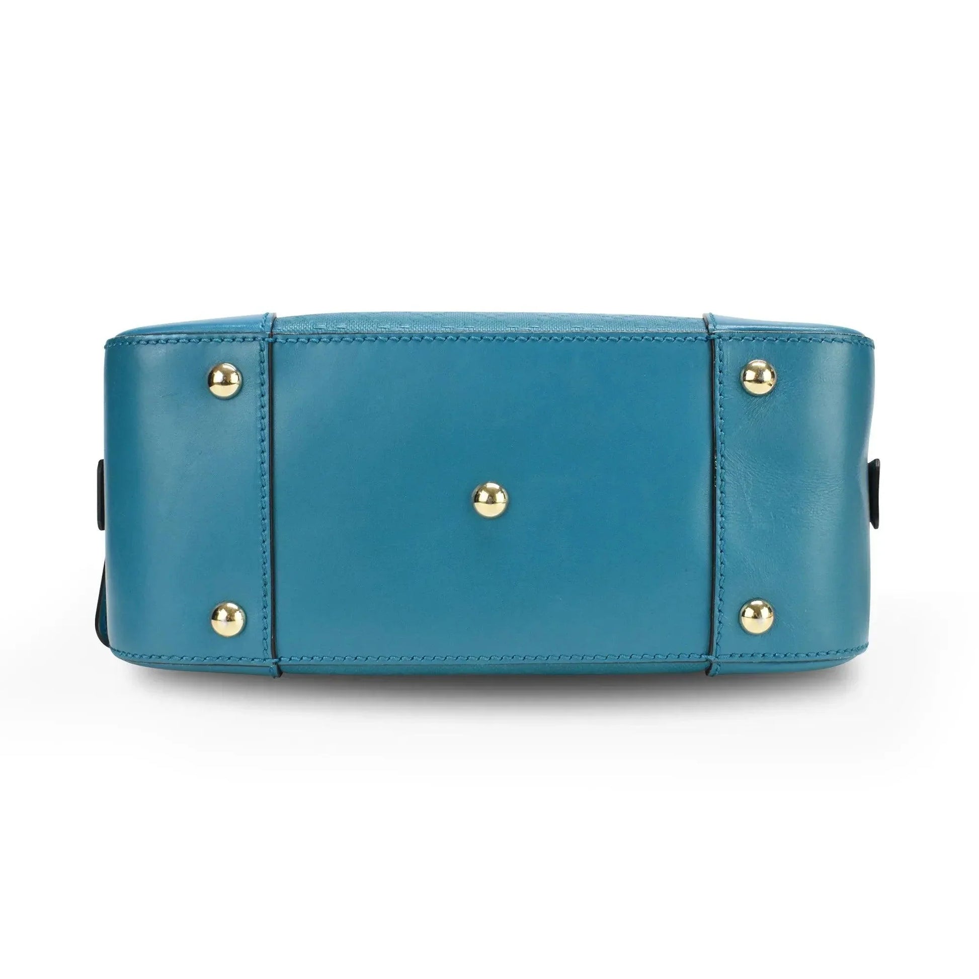 Gucci 'Satchel Small' Bag in teal diamante coated canvas with black piping and logo patch on the front. Features two-way zip closure, rolled top handles, removable crossbody strap and inner canvas lining with zip and open pockets.