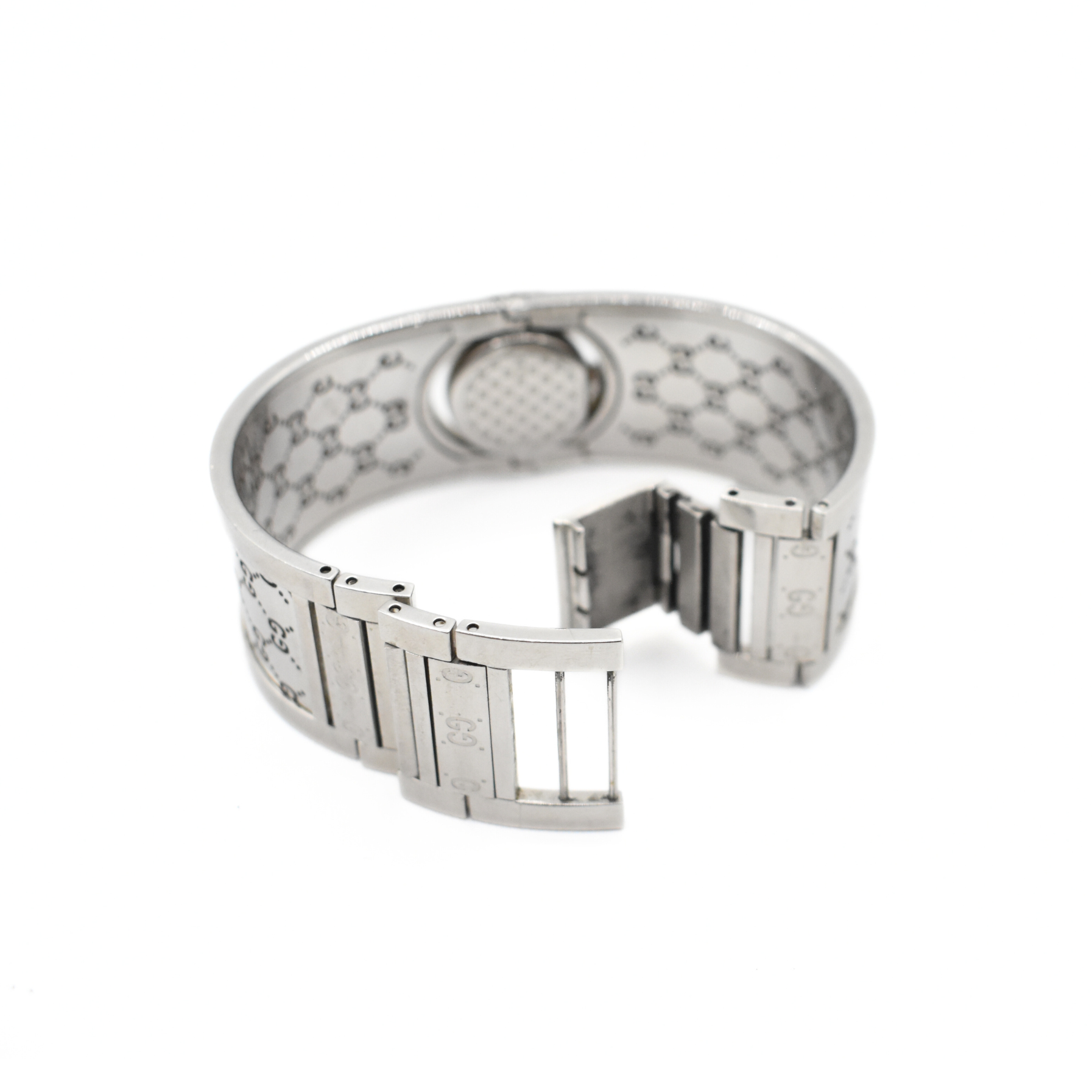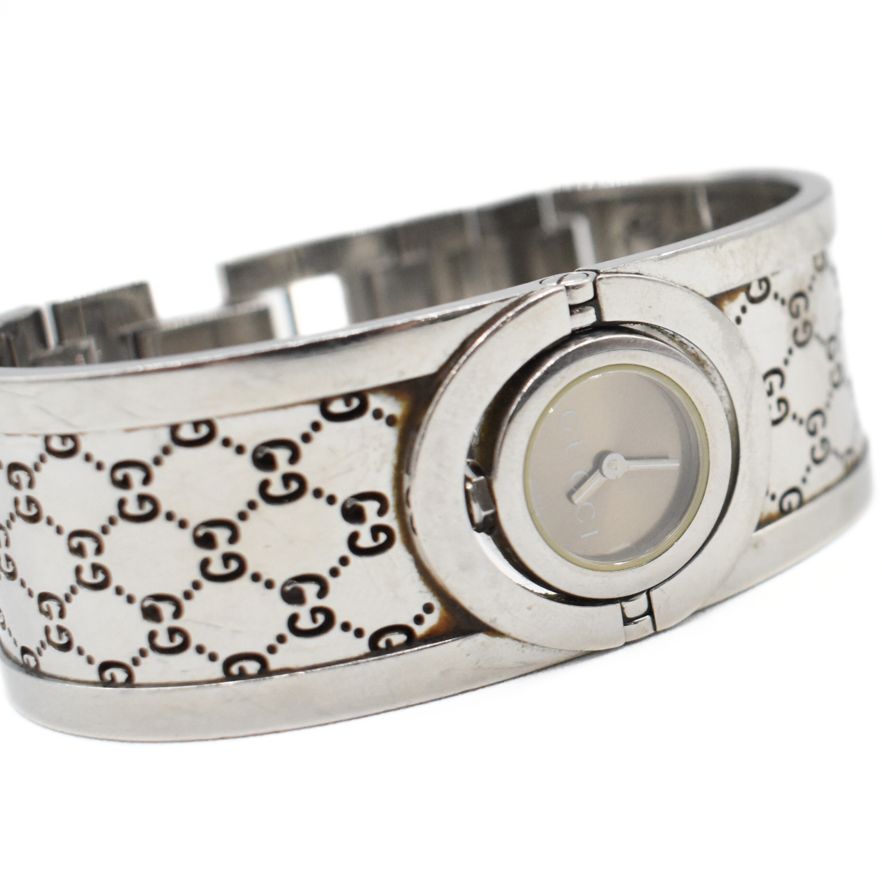 Gucci 'Twirl' watch in silver stainless steel with a 'GG' monogram embossed thick band, a grey quartz face with a swivel detail, and a butterfly clasp closure.