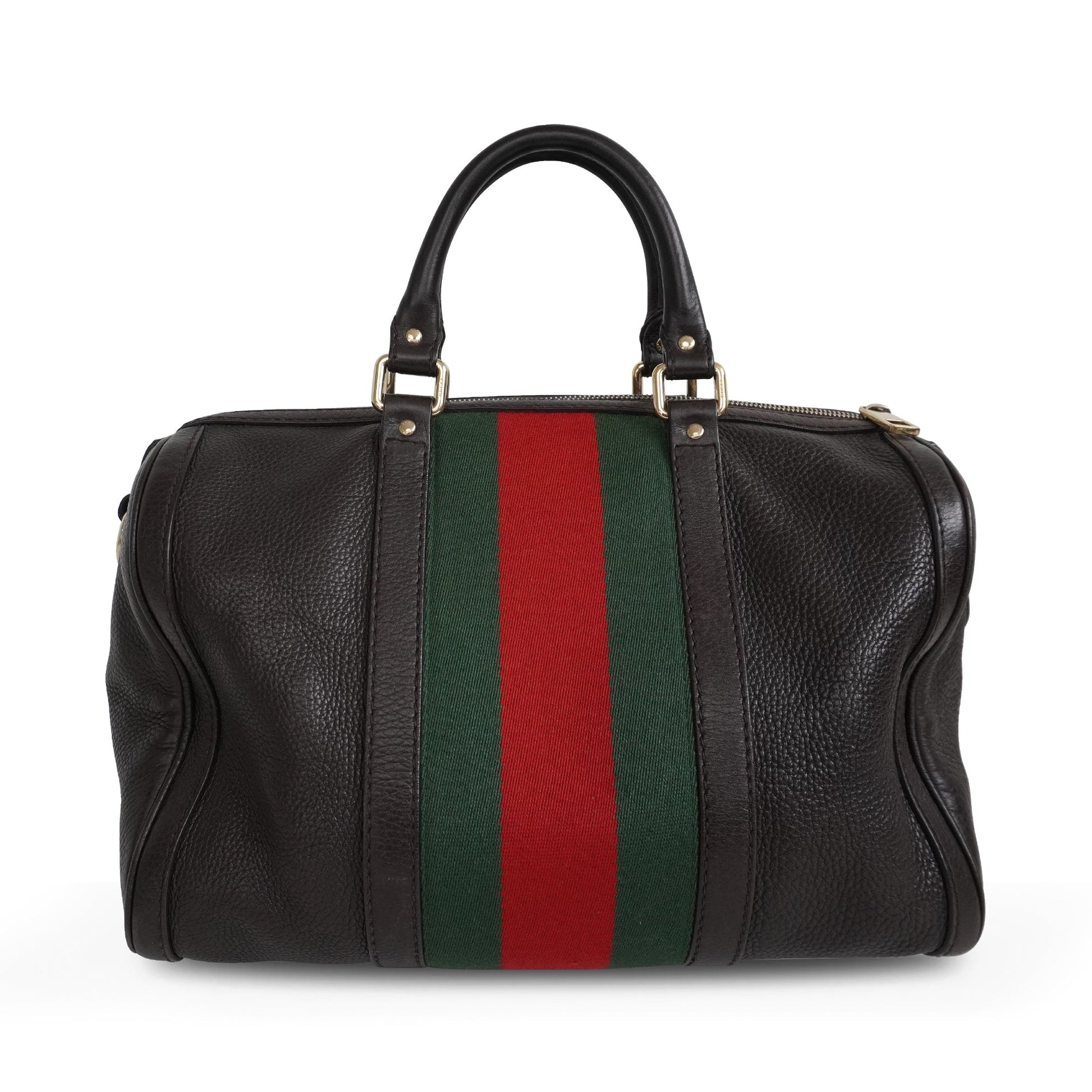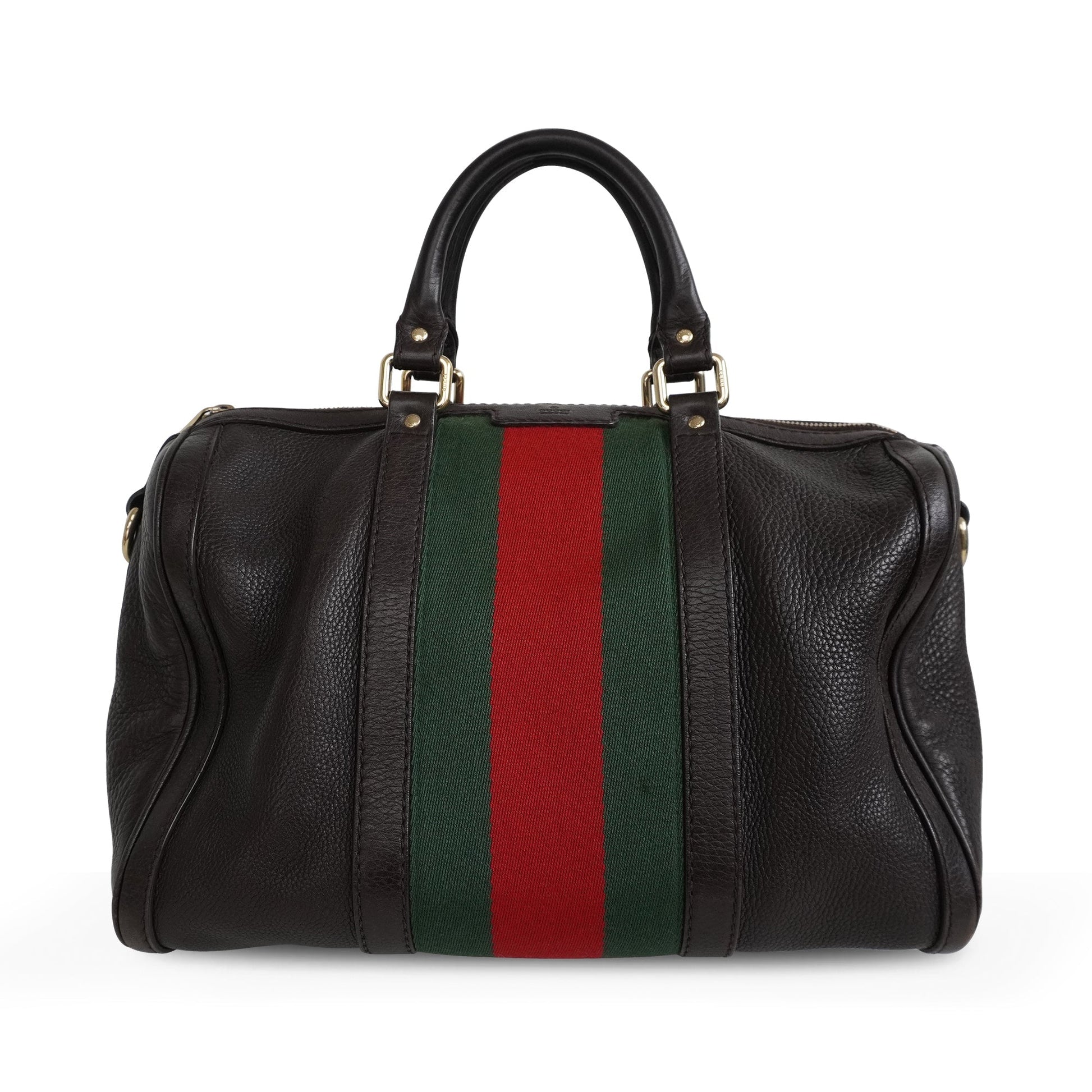 Gucci 'Web' boston bag in dark brown leather with a red and green canvas racing stripe down the centre, dual rolled top handles, and a removable crossbody strap with soft gold buckle hardware. The bag has a top zip opening that reveals a beige canvas interior lining with zip and slip pockets.