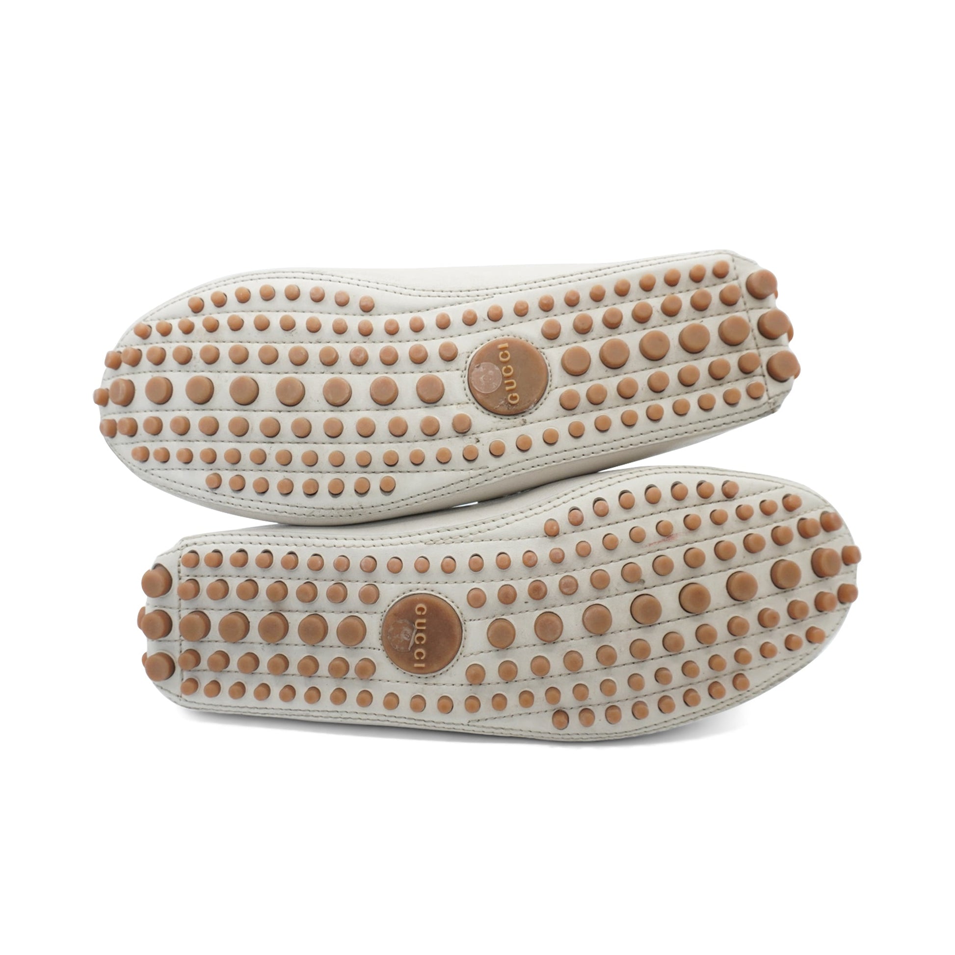 Gucci 'Web' loafers in cream white leather with a red and navy canvas racing stripe, a bamboo horsebit detail at the toe, and a driver sole.