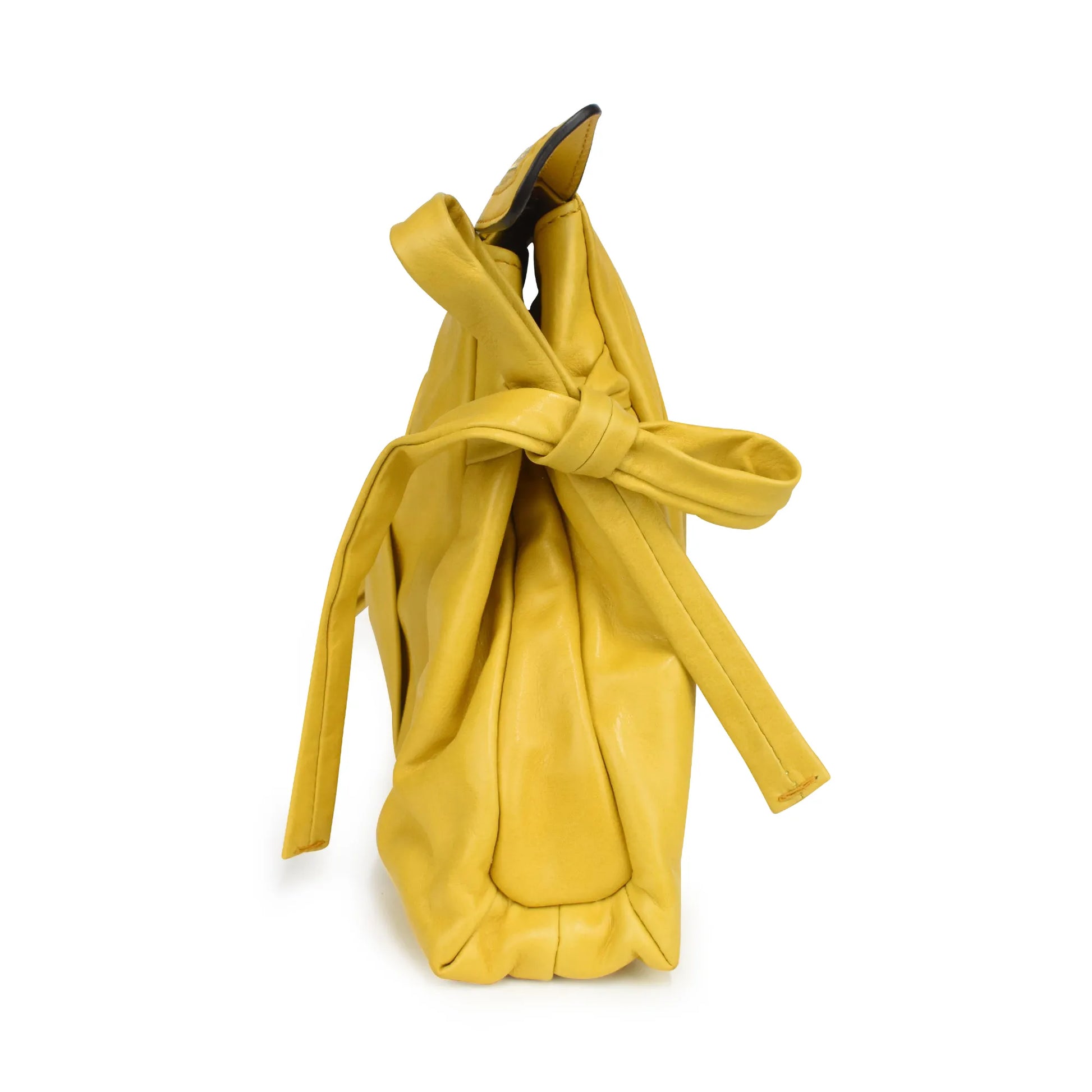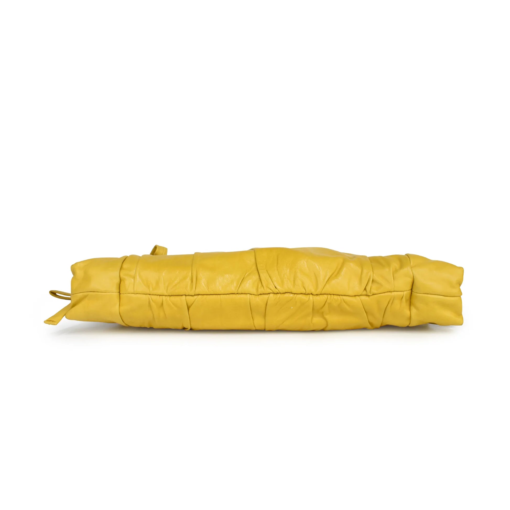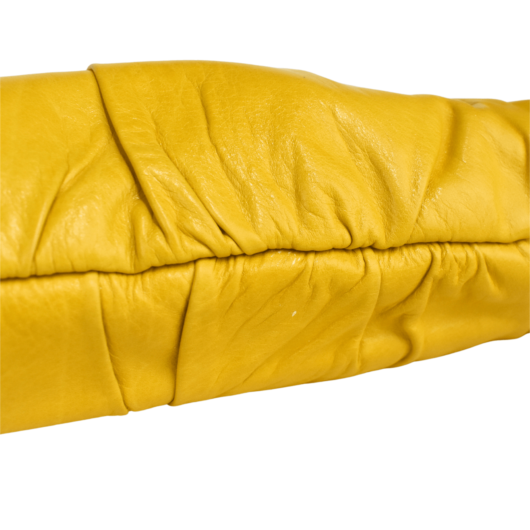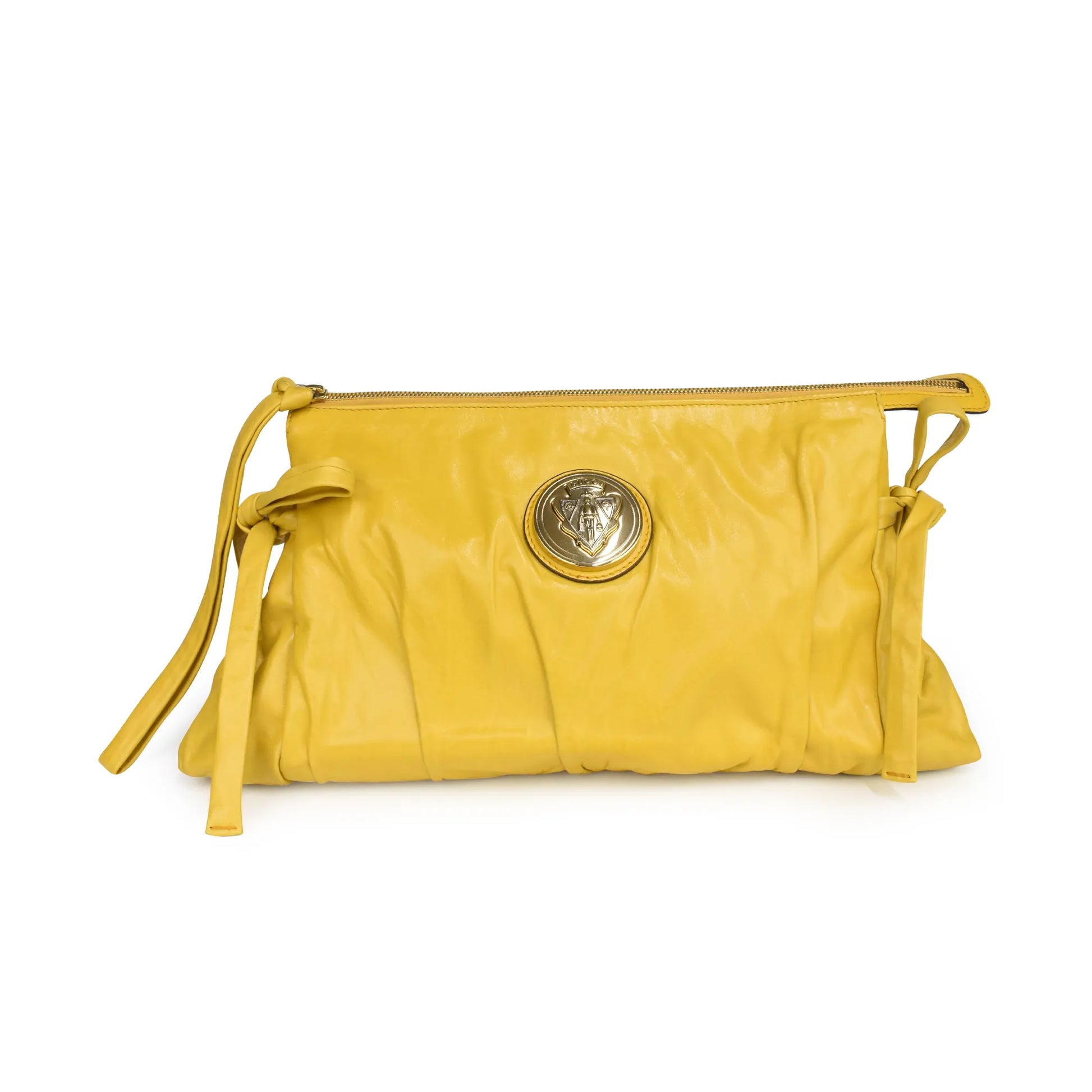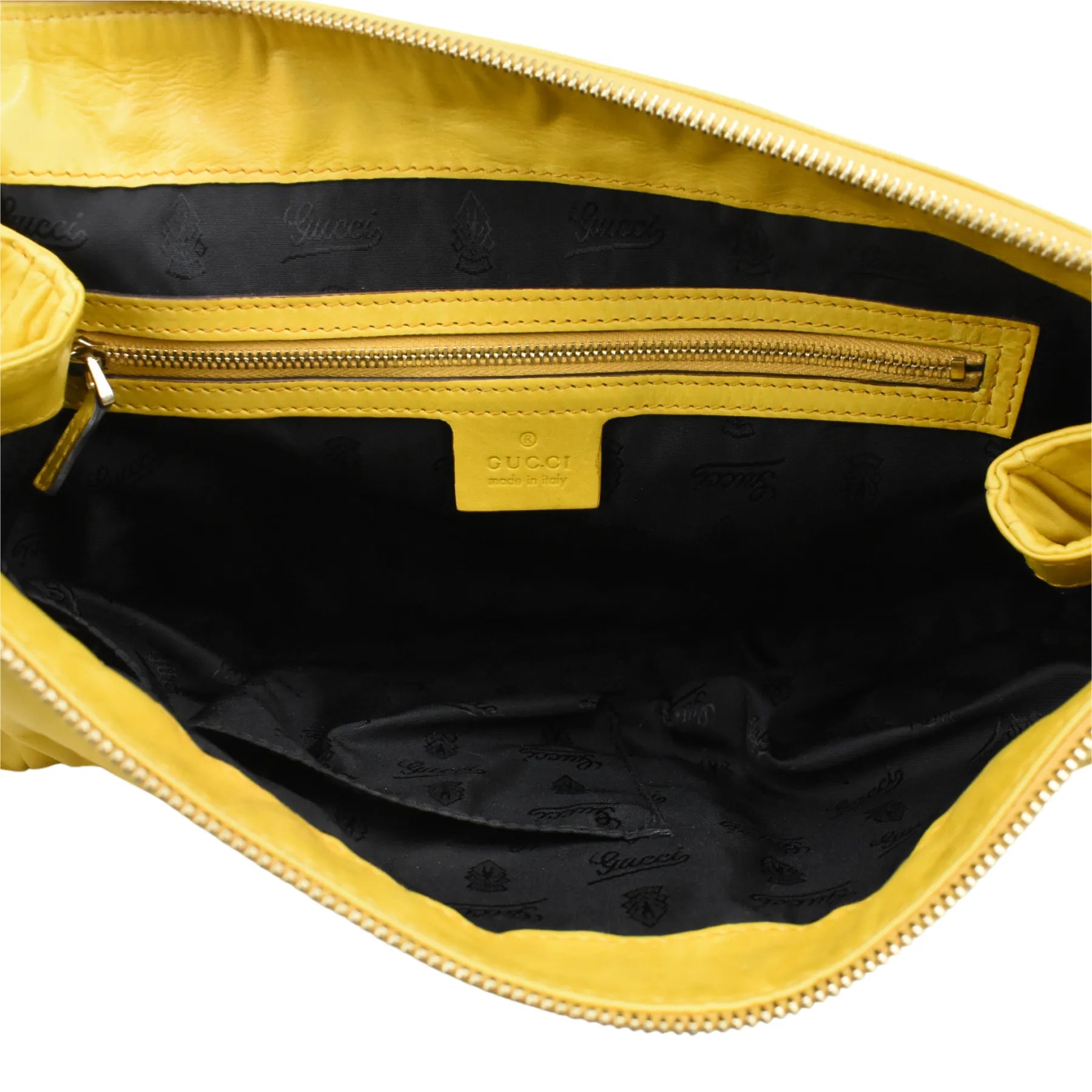 Gucci 'Hysteria' clutch in yellow pleated leather with a front crest logo in gold hardware. Features a top zip closure, side bow detailing and black canvas lining with a zip pocket.