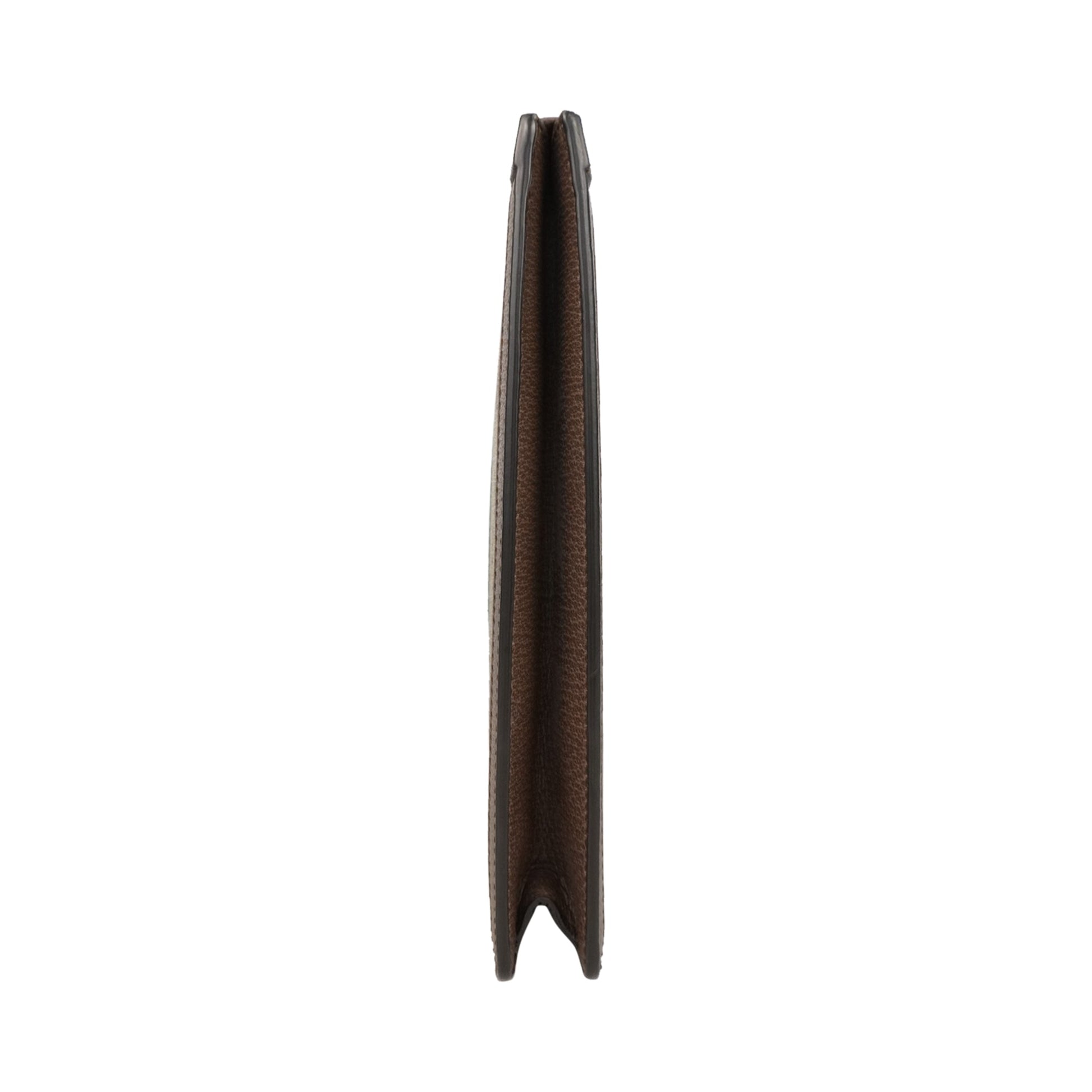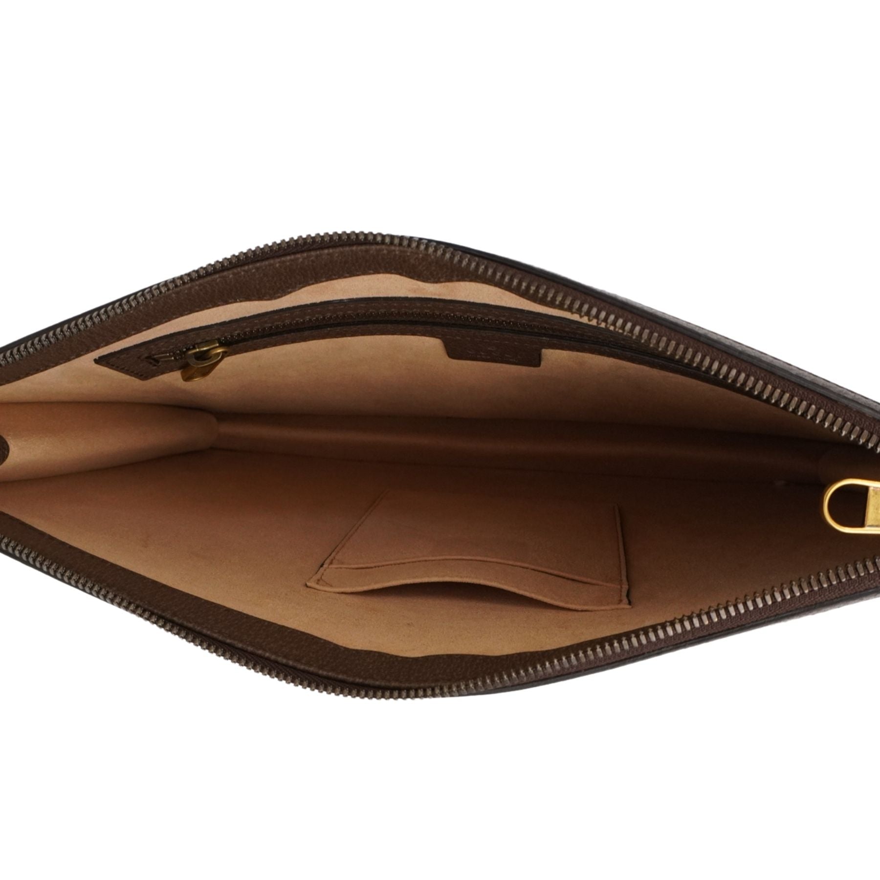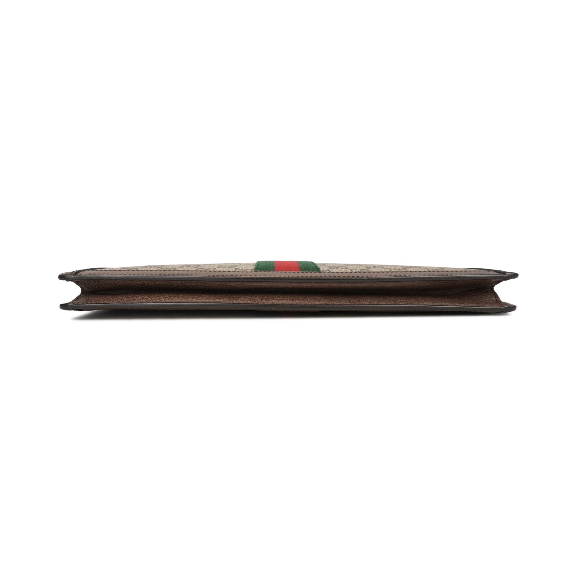 Gucci 'Ophidia' large pouch in brown logo monogram coated canvas with a light brown leather trim. Features red and green cotton racing stripe down the centre, a zip closure in aged gold hardware, and orange enamel hardware logo on the front. The interior is beige suede lined with a zip pocket and 2 small slip pockets.