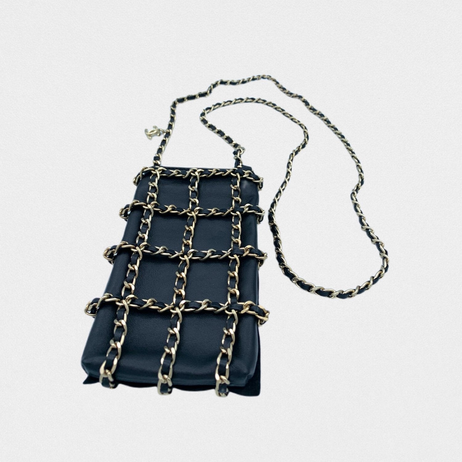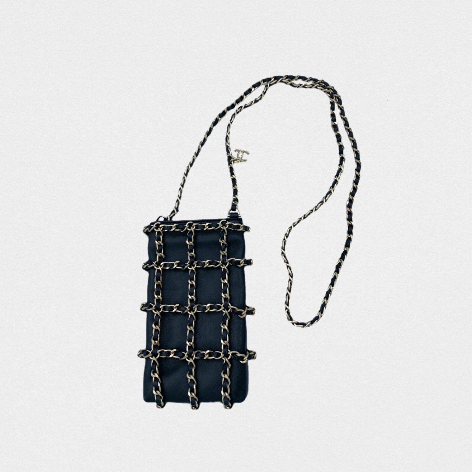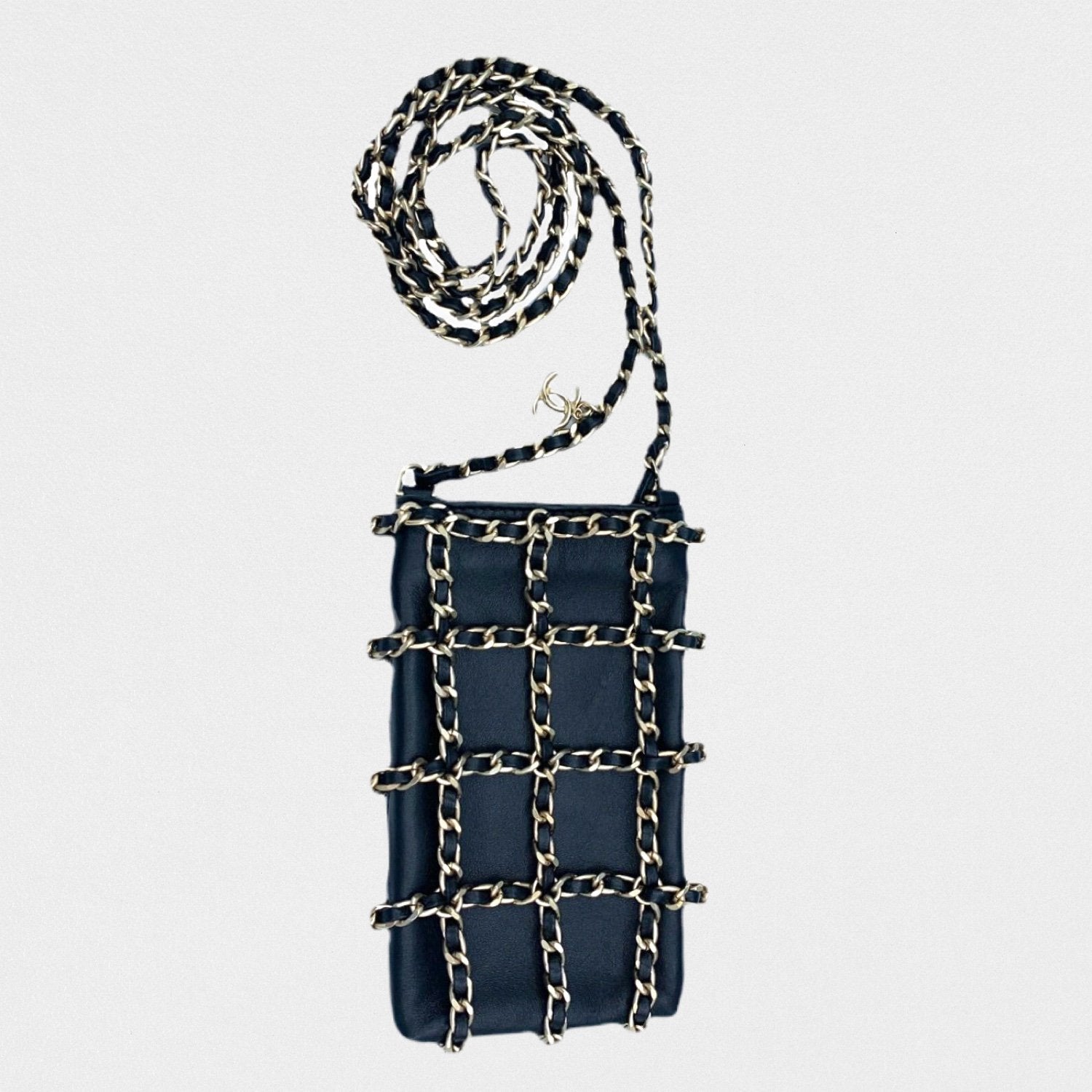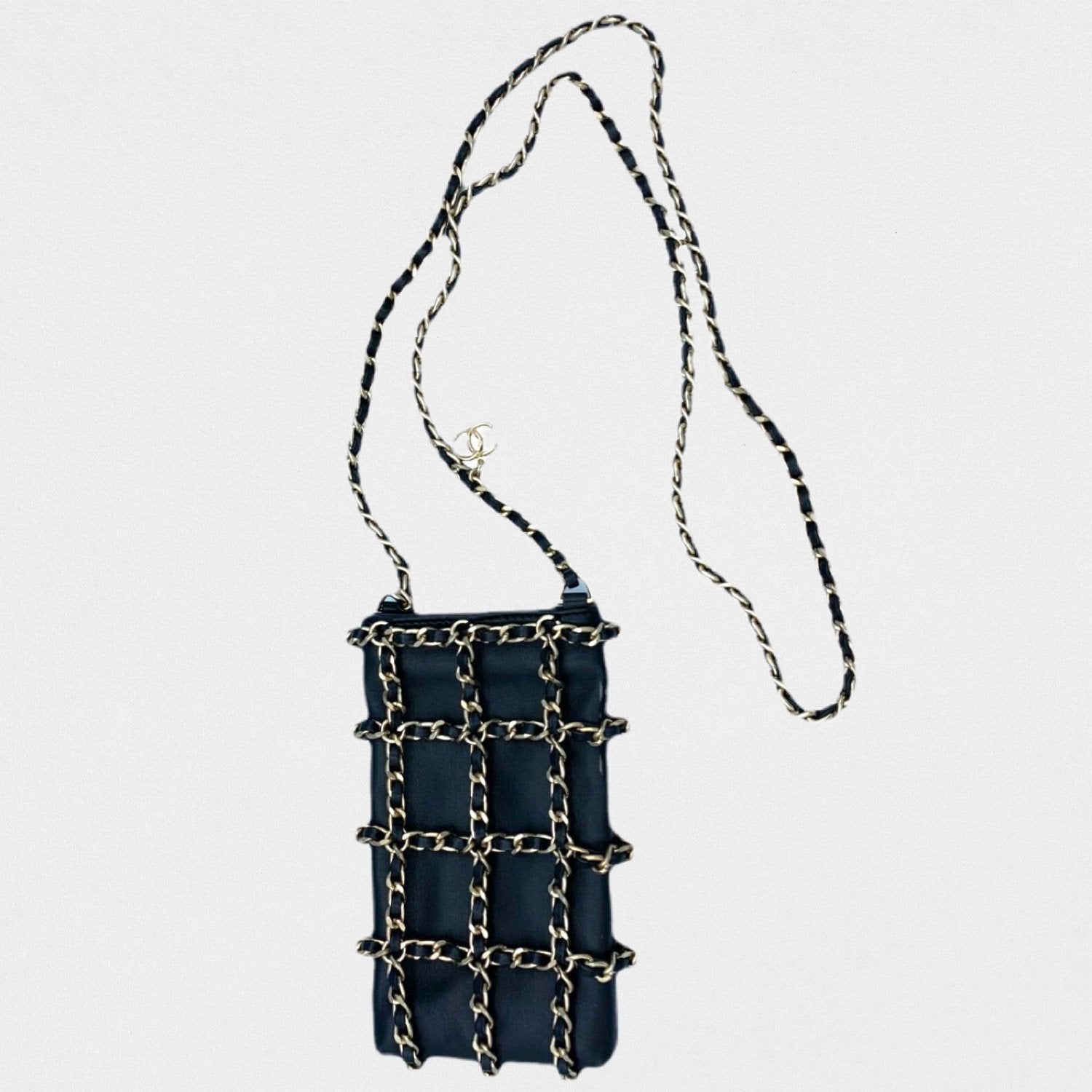 DESCRIPTION: Chanel leather phone pouch with golden chains. Long strap to wear cross-body.