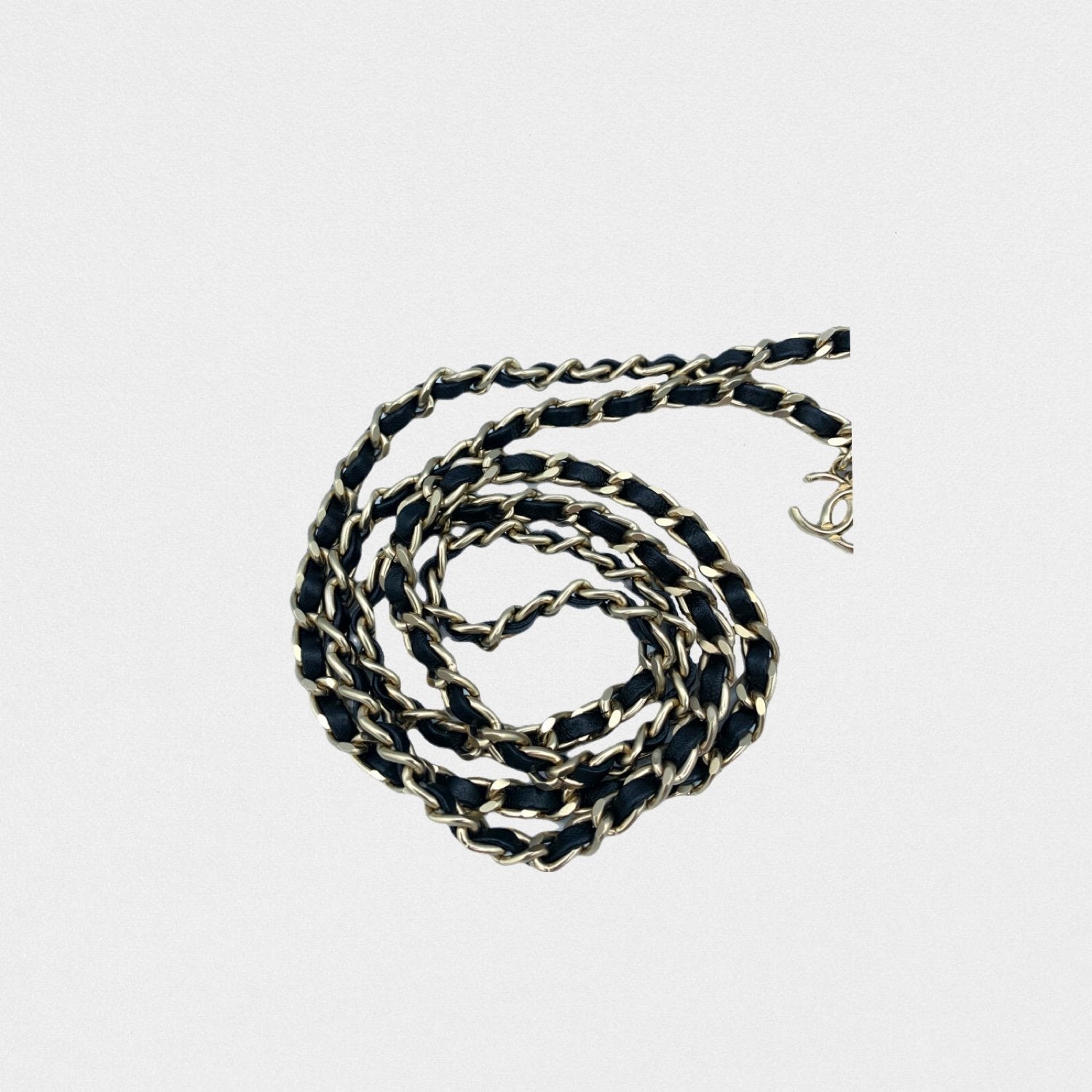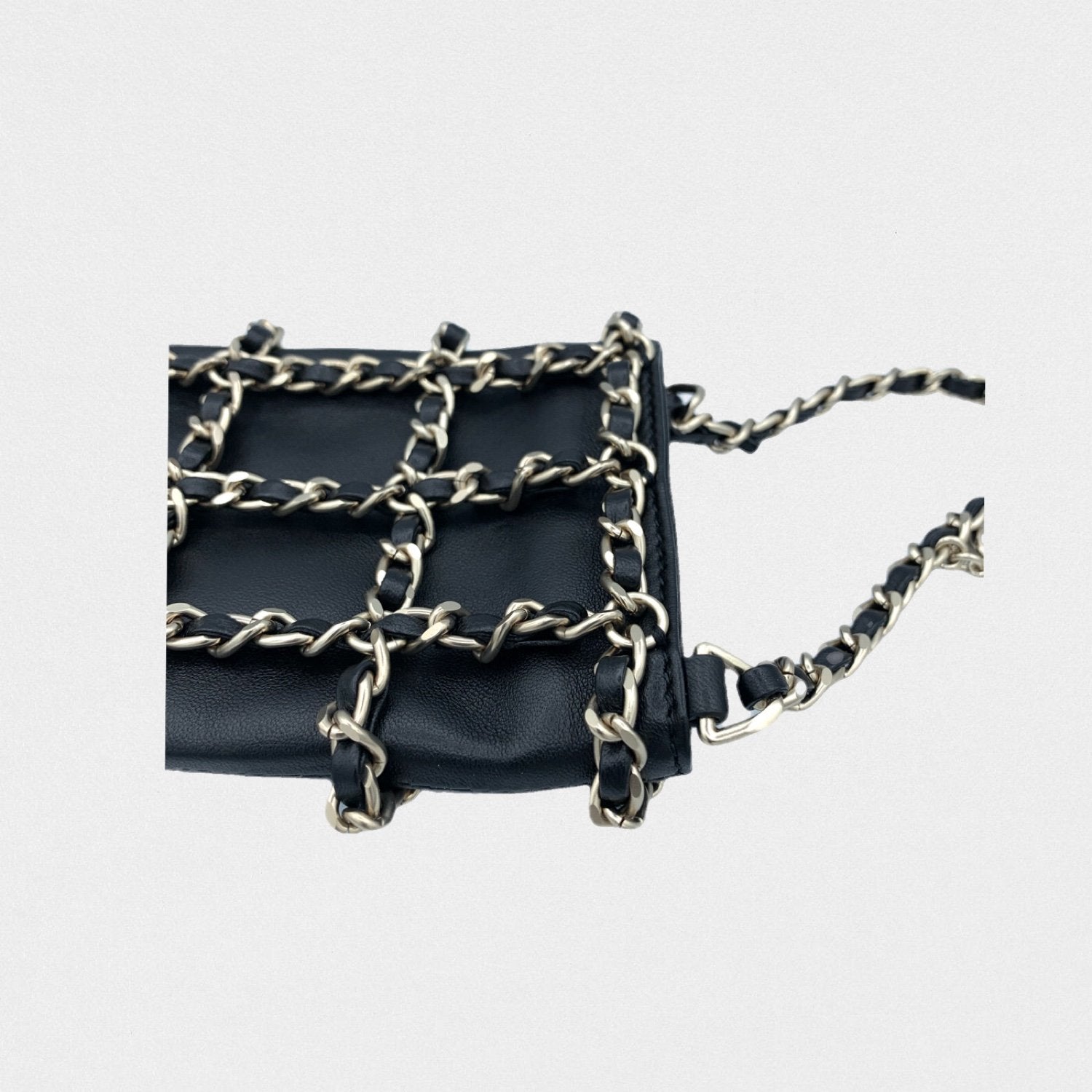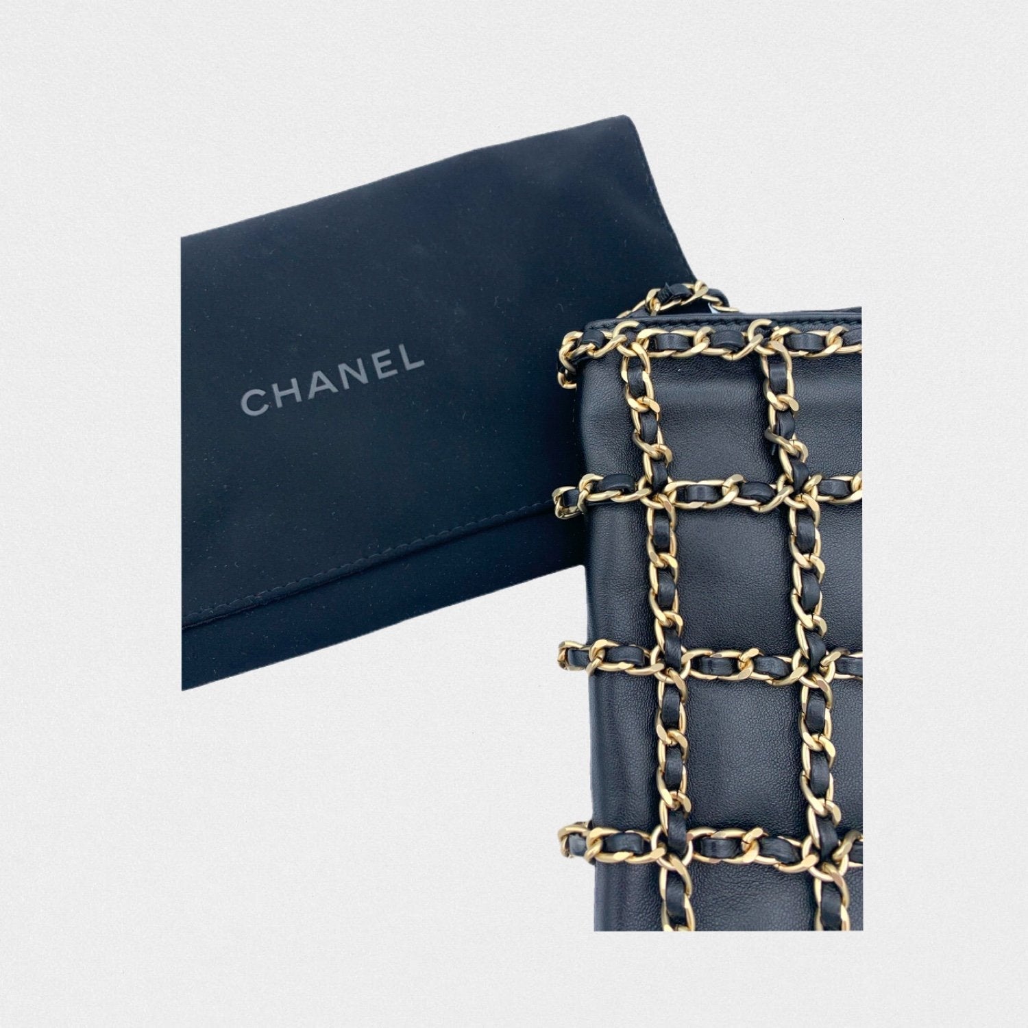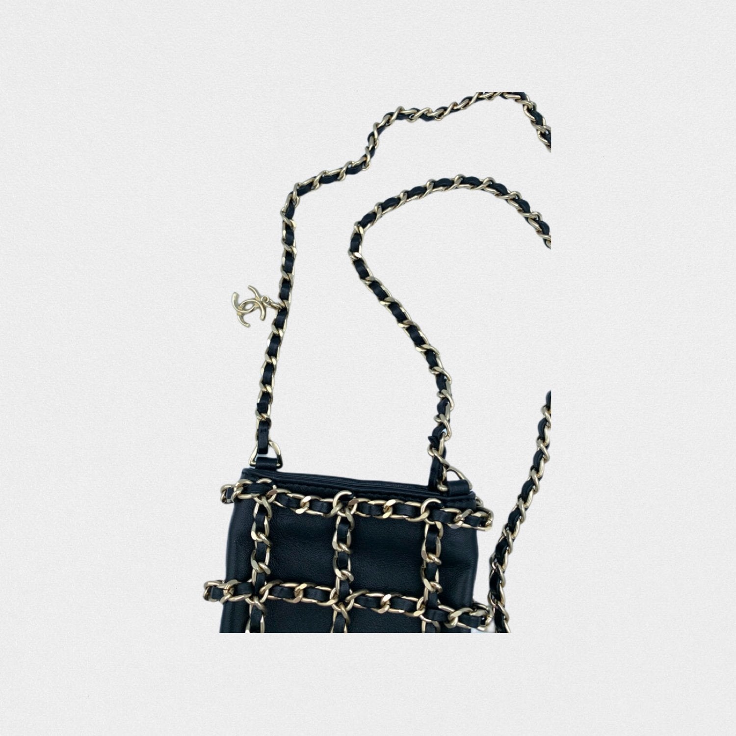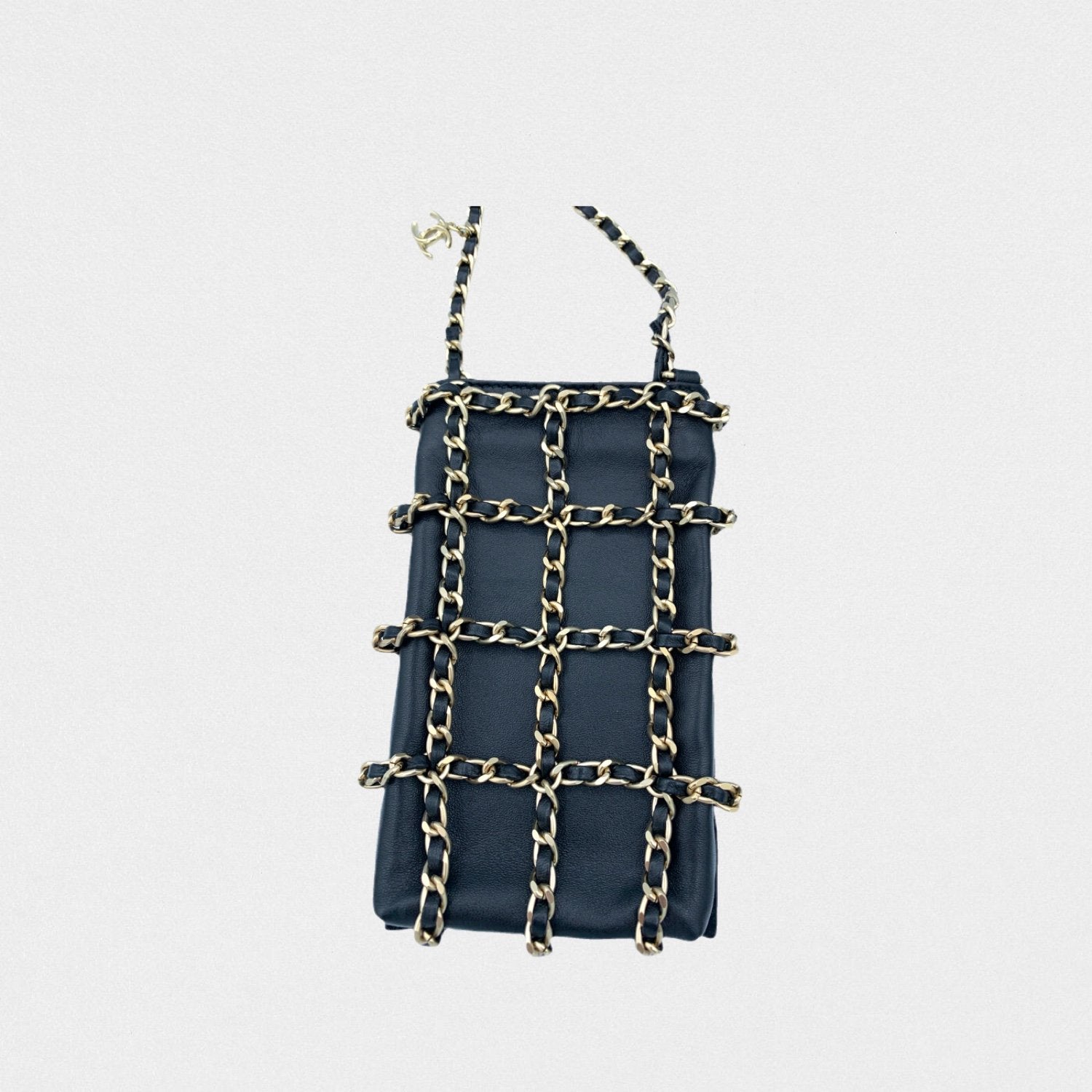 DESCRIPTION: Chanel leather phone pouch with golden chains. Long strap to wear cross-body.