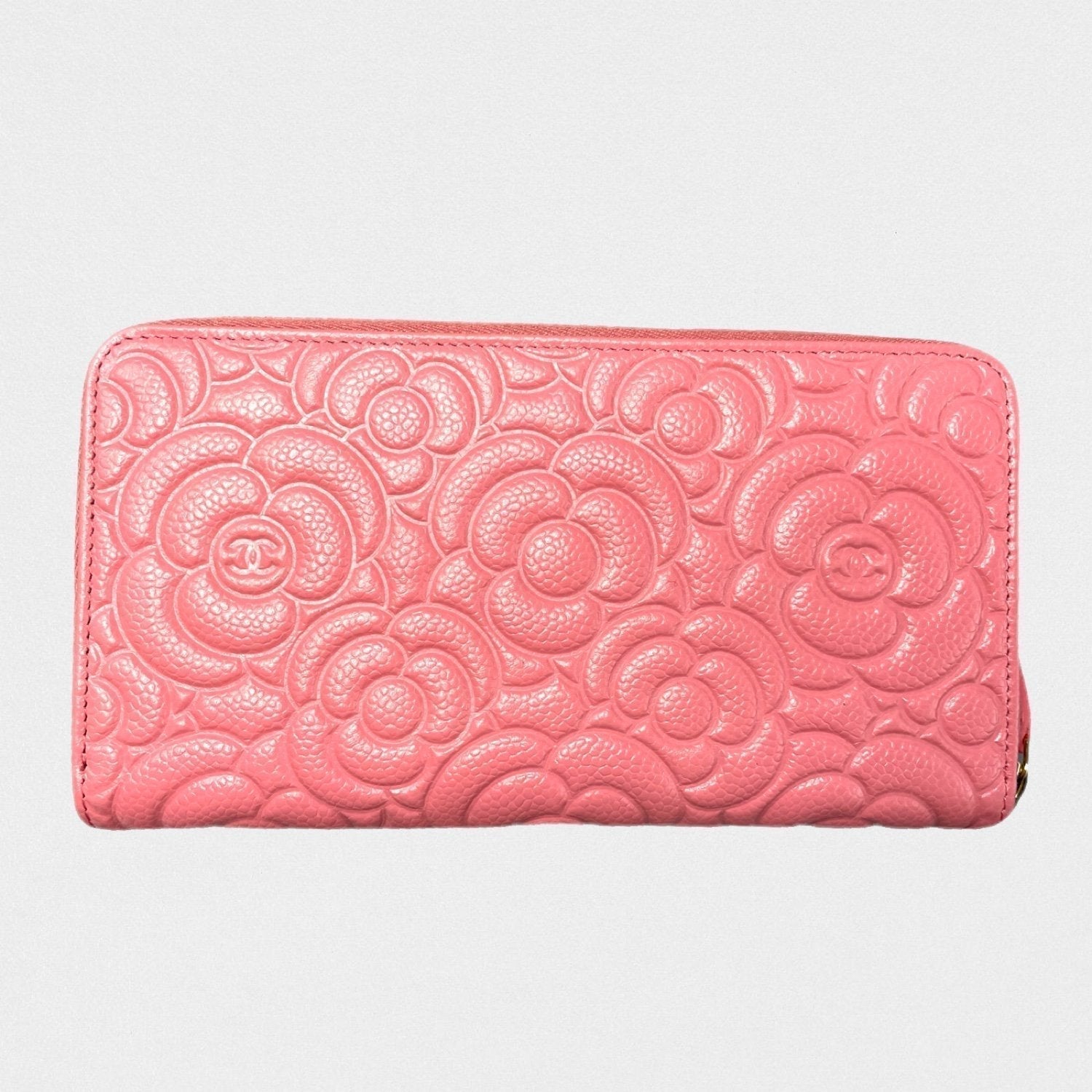 DESCRIPTION:Chanel Camellia Compagnon wallet -Chanel zipped organizer wallet in pink camellia embossed leather. Chanel silver logo on the front. 8 card slots, zipped pocket and two patch pockets - Closing with a zip