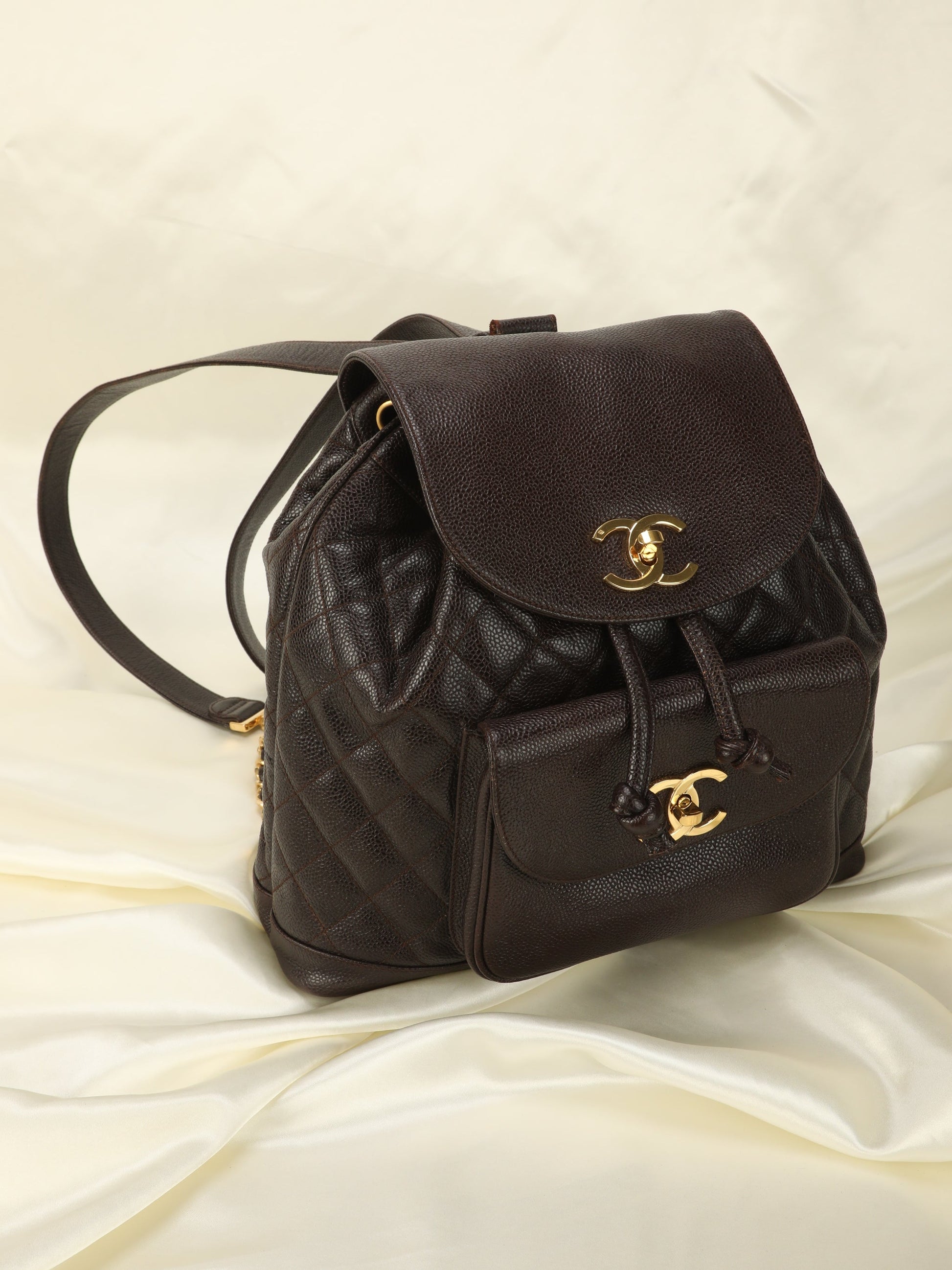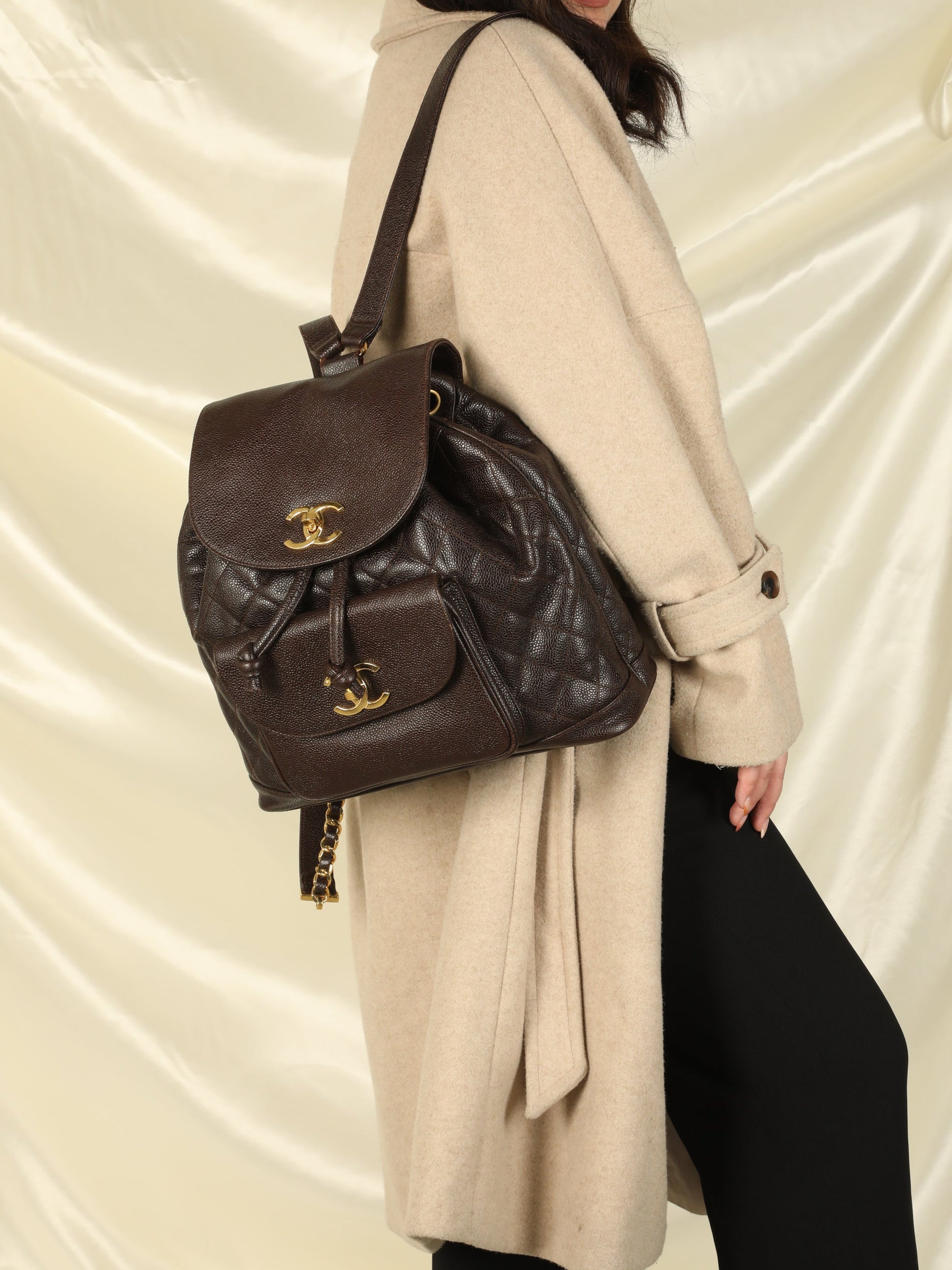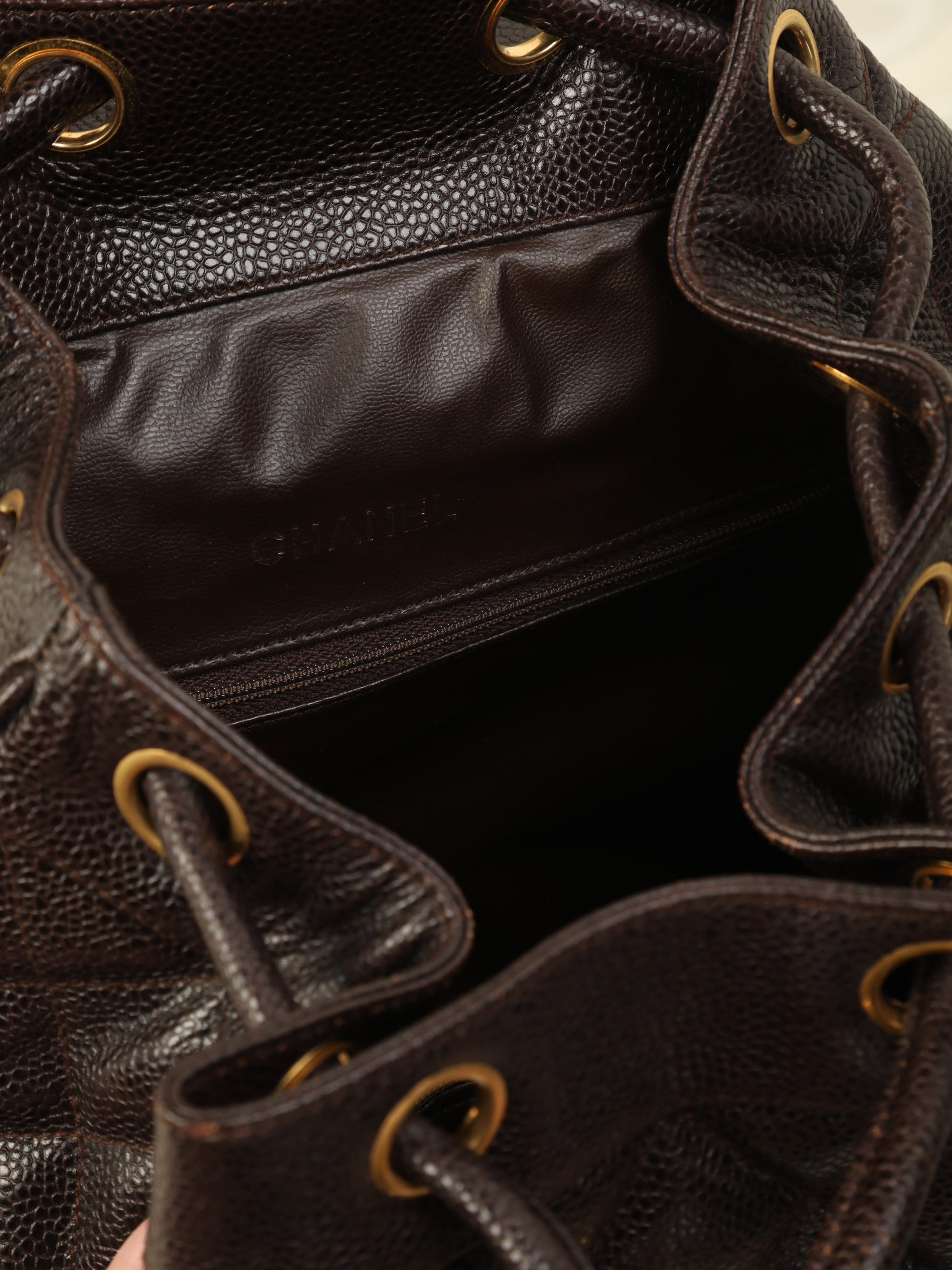 Bringing to the shop an extremely rare Chanel caviar backpack!! What makes this is a rare piece is the?double?Chanel logos on the front matched with the quilted caviar and gold chain accents. Can be loved for years to come. Beautiful?chocolate brown color looks incredible with warm tones or an all neutral fit.?Vintage Chanel crafted in the 90's= 24k hardware. Don't miss out on this gorgeous find. Perfect for traveling or festival season! Only other one in this style and in caviar material is going online for 7500!!