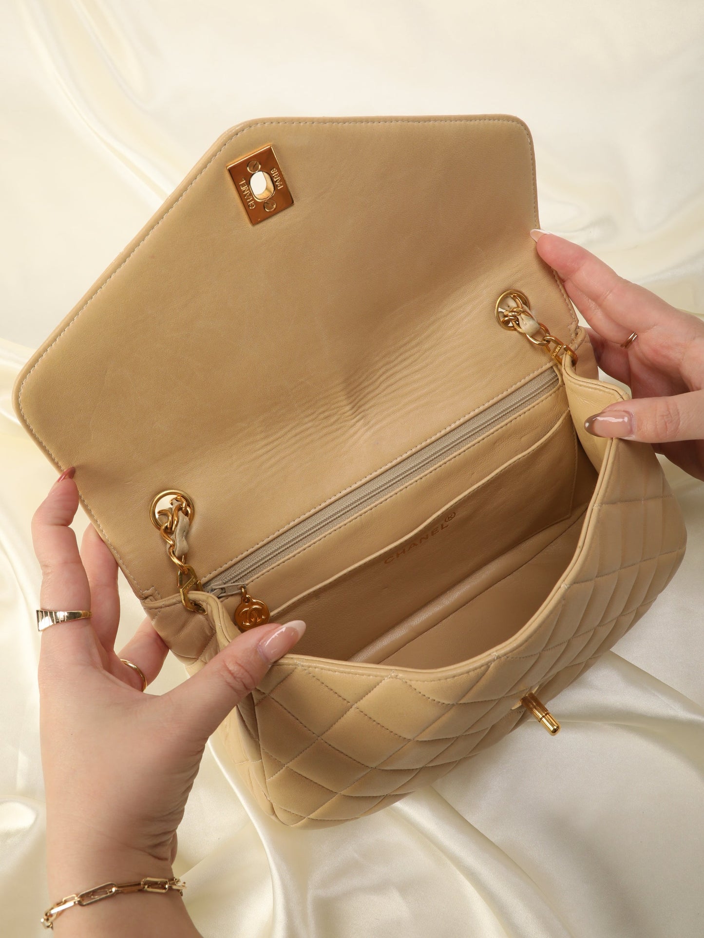 ?Bringing to the shop a rare, soft?classic Chanel that can be loved for years to come. What makes this piece rare is the tied chain. Chanel only made a number of these in this style. Puffy quilted lambskin! Vintage Chanel crafted in the 90's= 24k hardware and soft buttery lambskin. Don't miss out on this gorgeous find.??