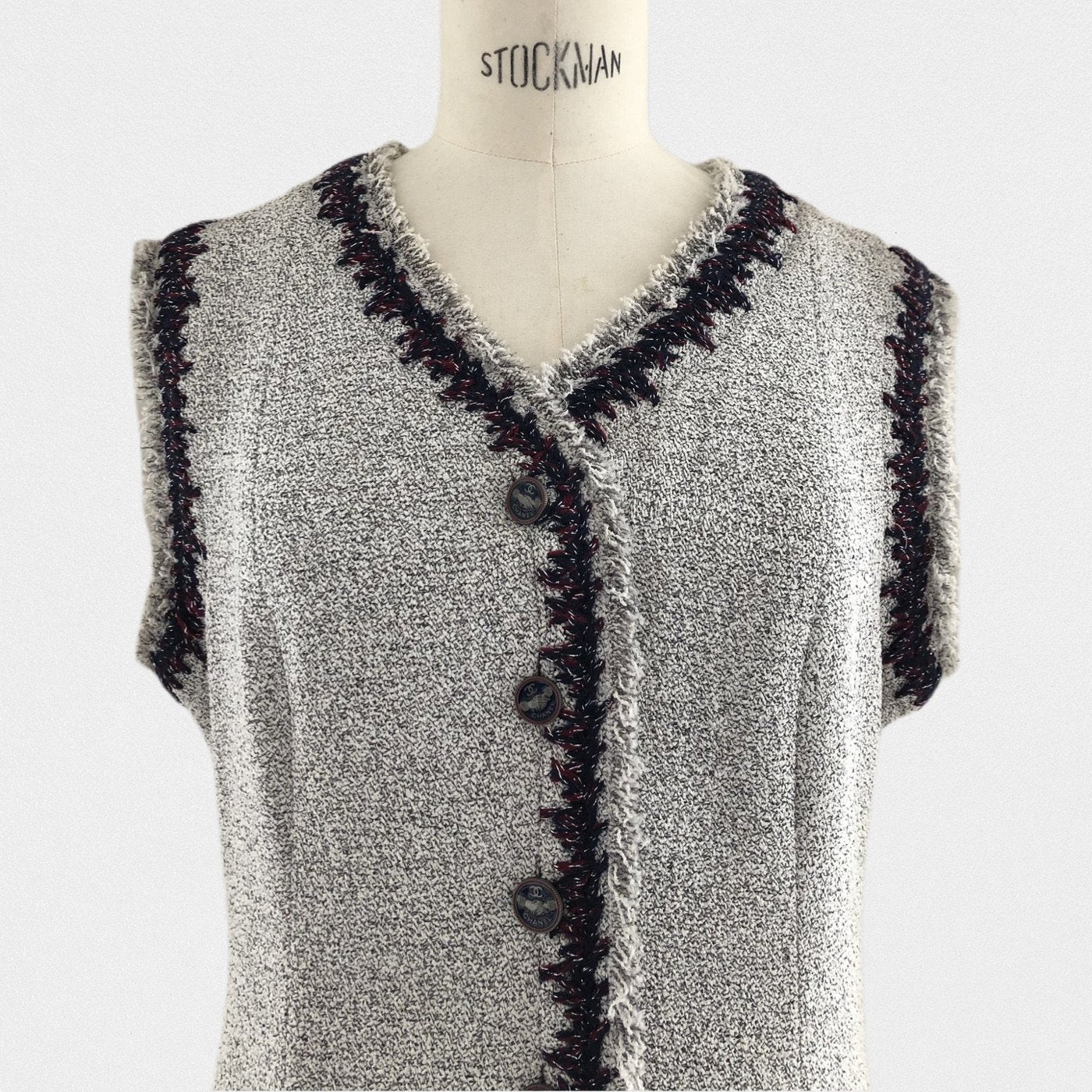 DESCRIPTION:Chanel Paris-Moscow dress - Red and blue border - 2 open side pockets - Opening with 5 Chanel + CC logo buttons