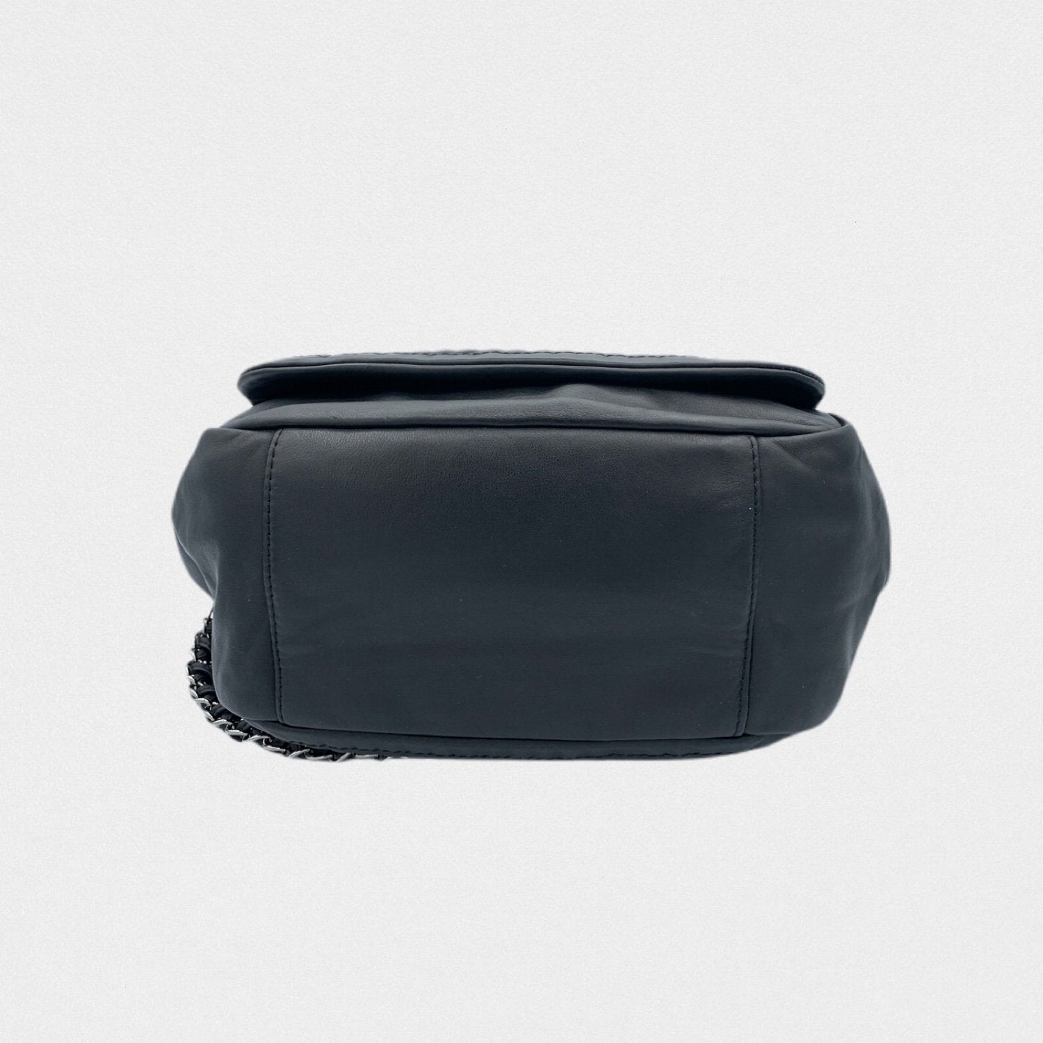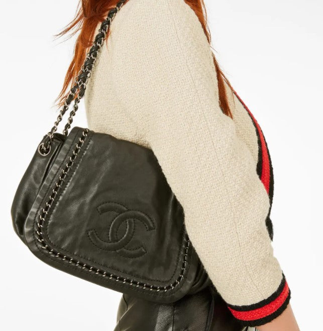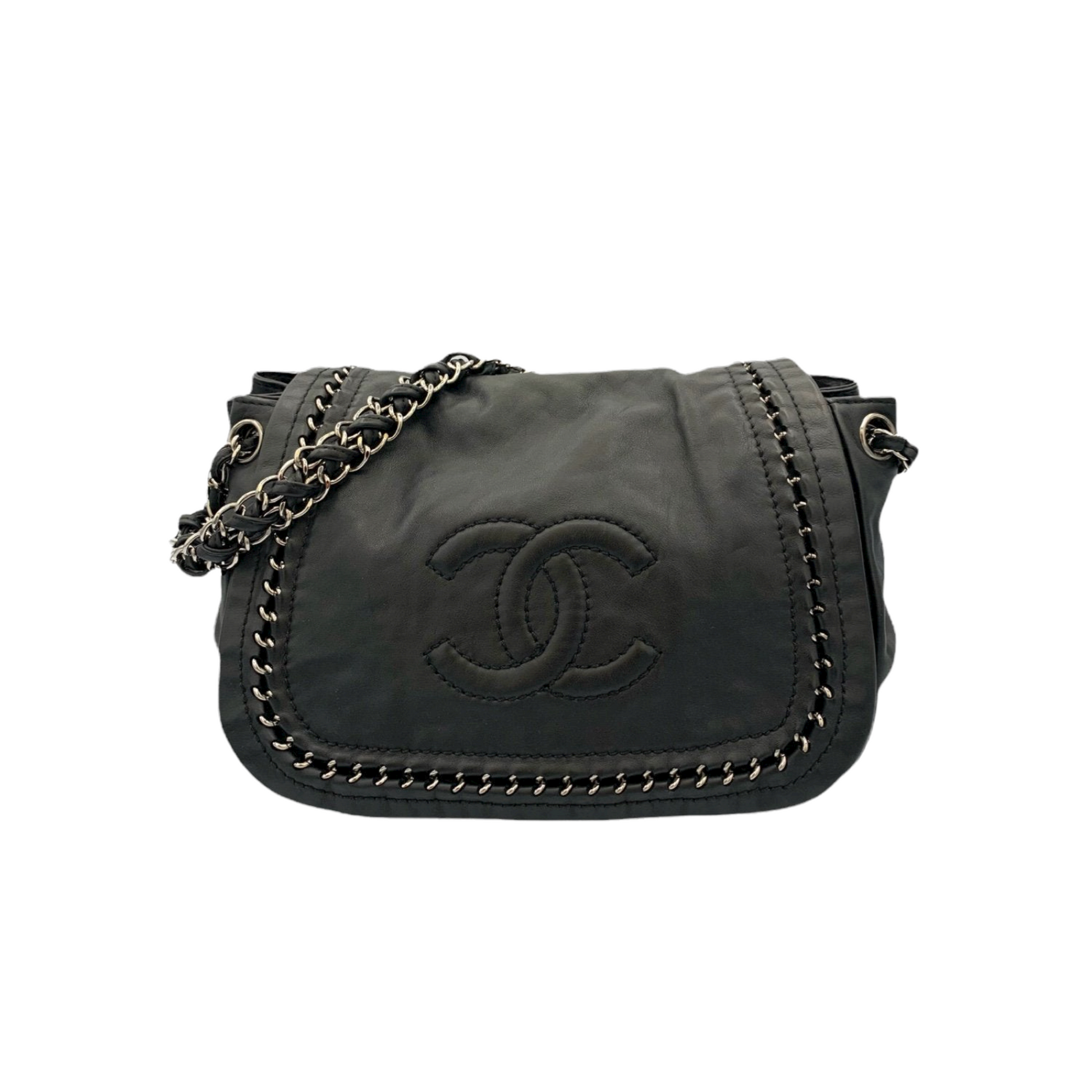DESCRIPTION: Printed CC logo satchel featuringChanel logo embedded like an imprint, highlighted by all the trimmings and the double silver metal chain