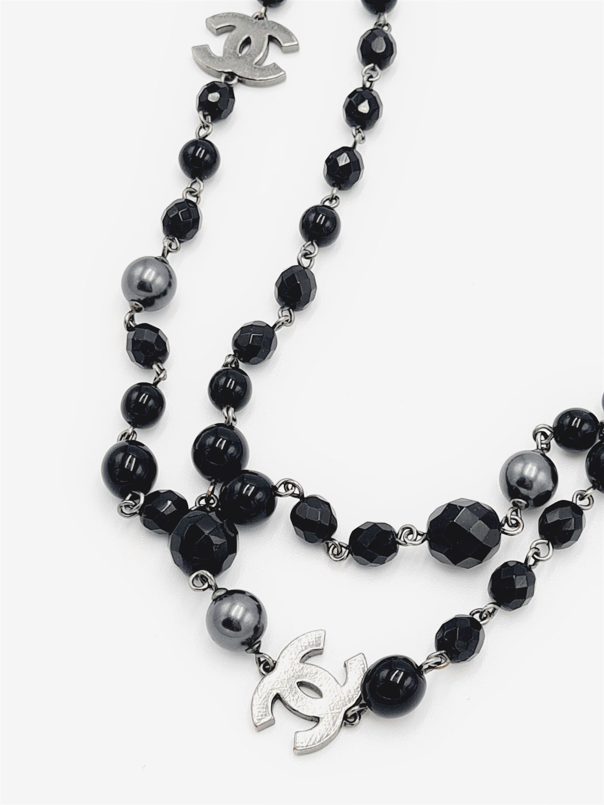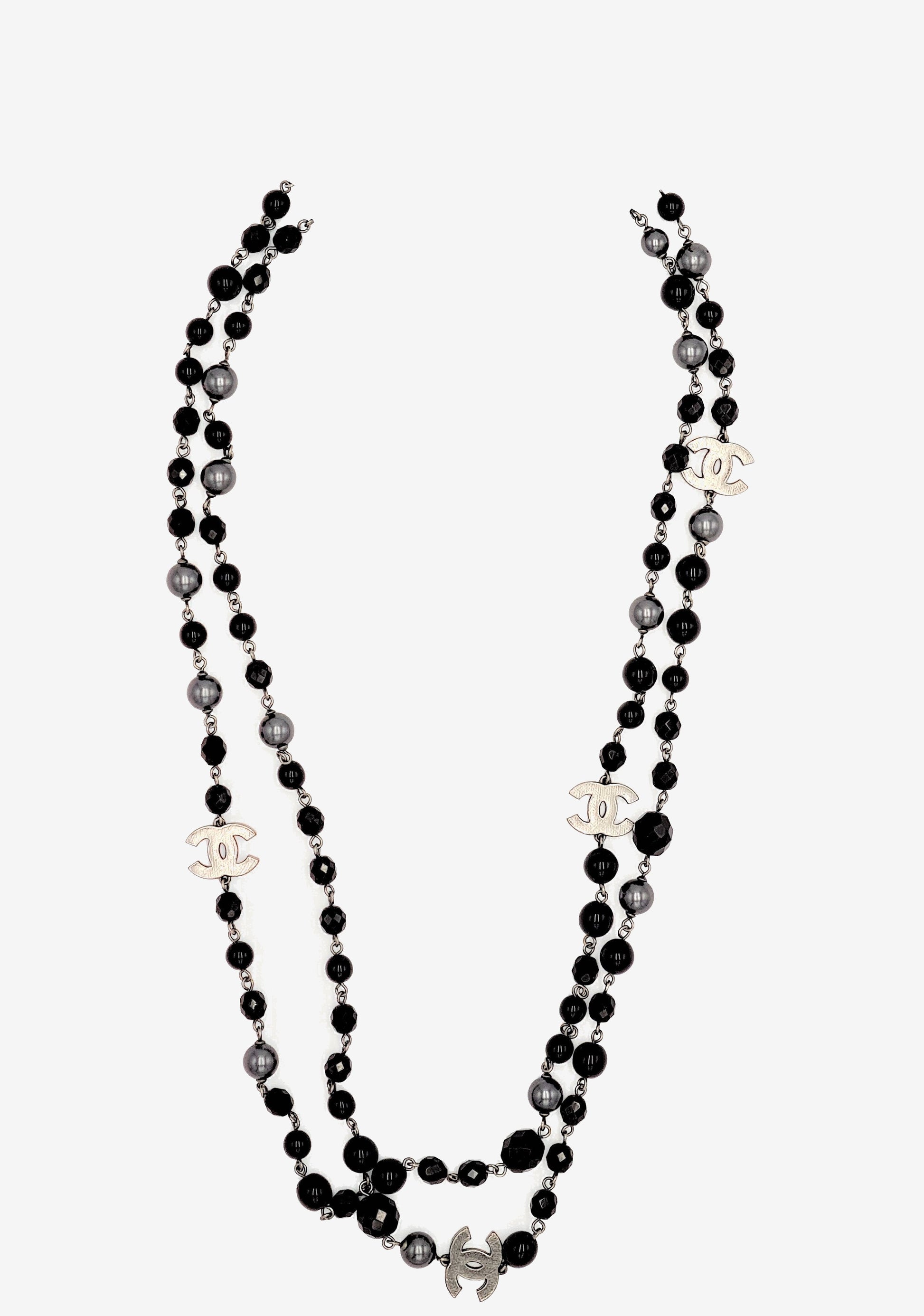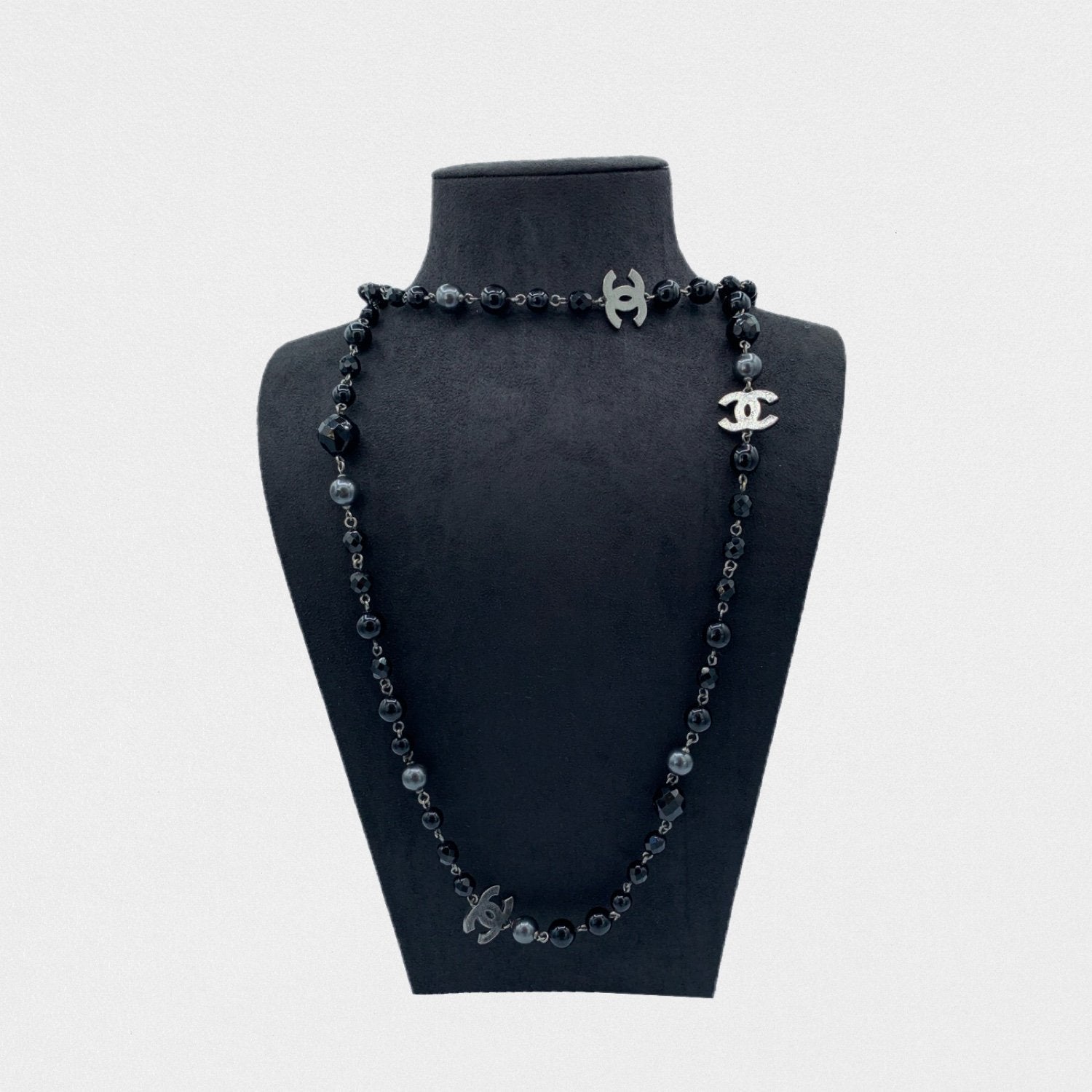 DESCRIPTION: Chanel black long necklace embellished with CC logo